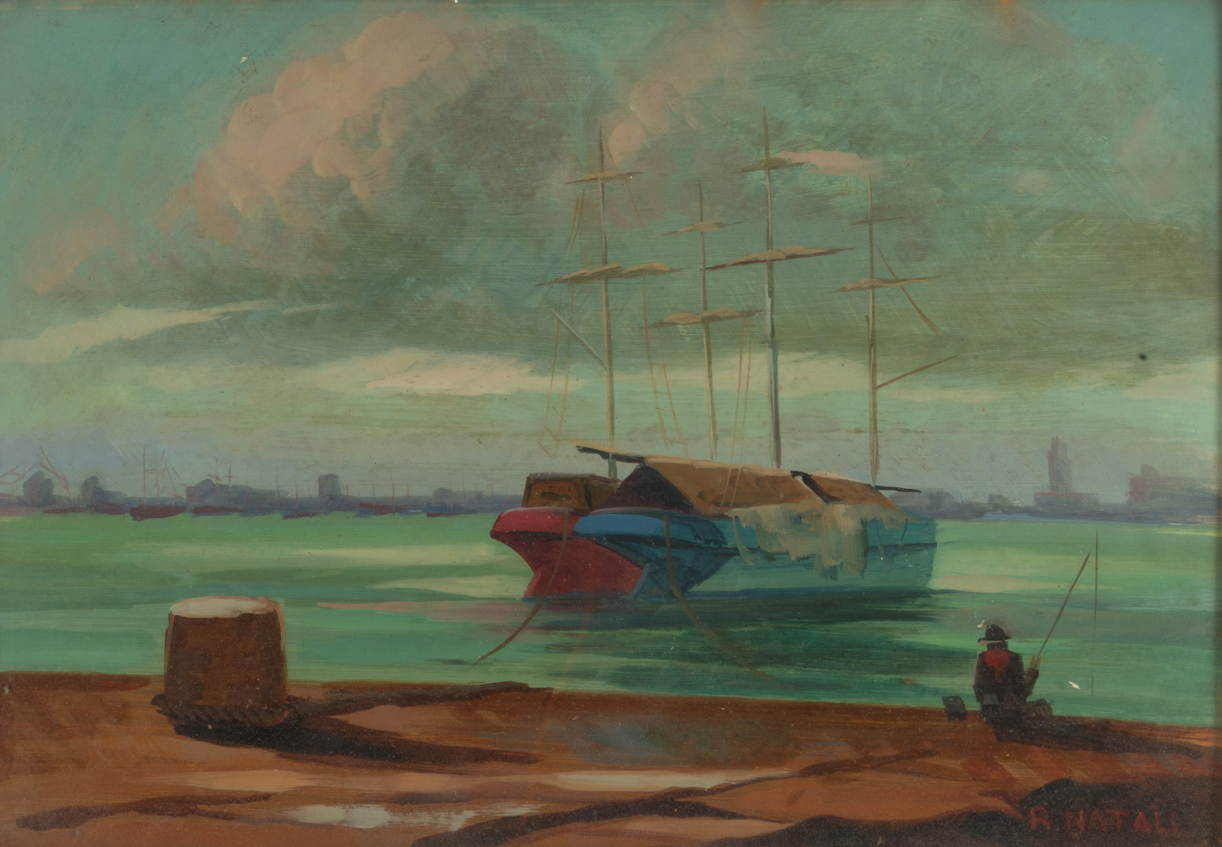 Dipinto "VELIERI ORMEGGIATI CON PESCATORE"