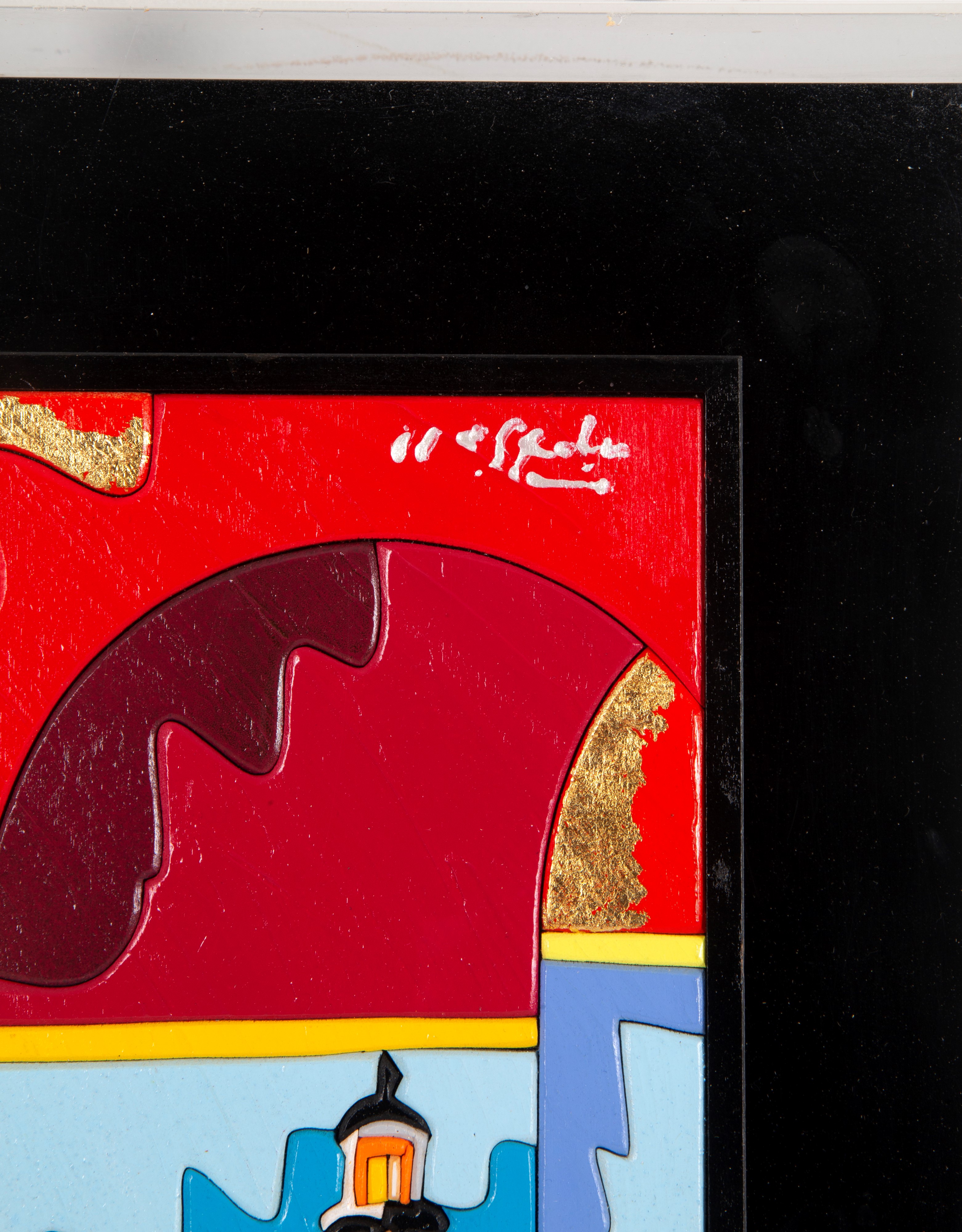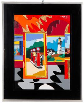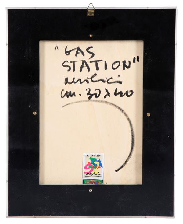 Acrilico su tavola intitolato “GAS STATION”. Firmato in alto a destra. Controfirmato e intitolato sul retro. Con etichetta di autenticità sul retro.