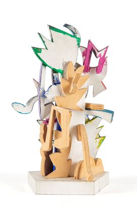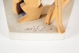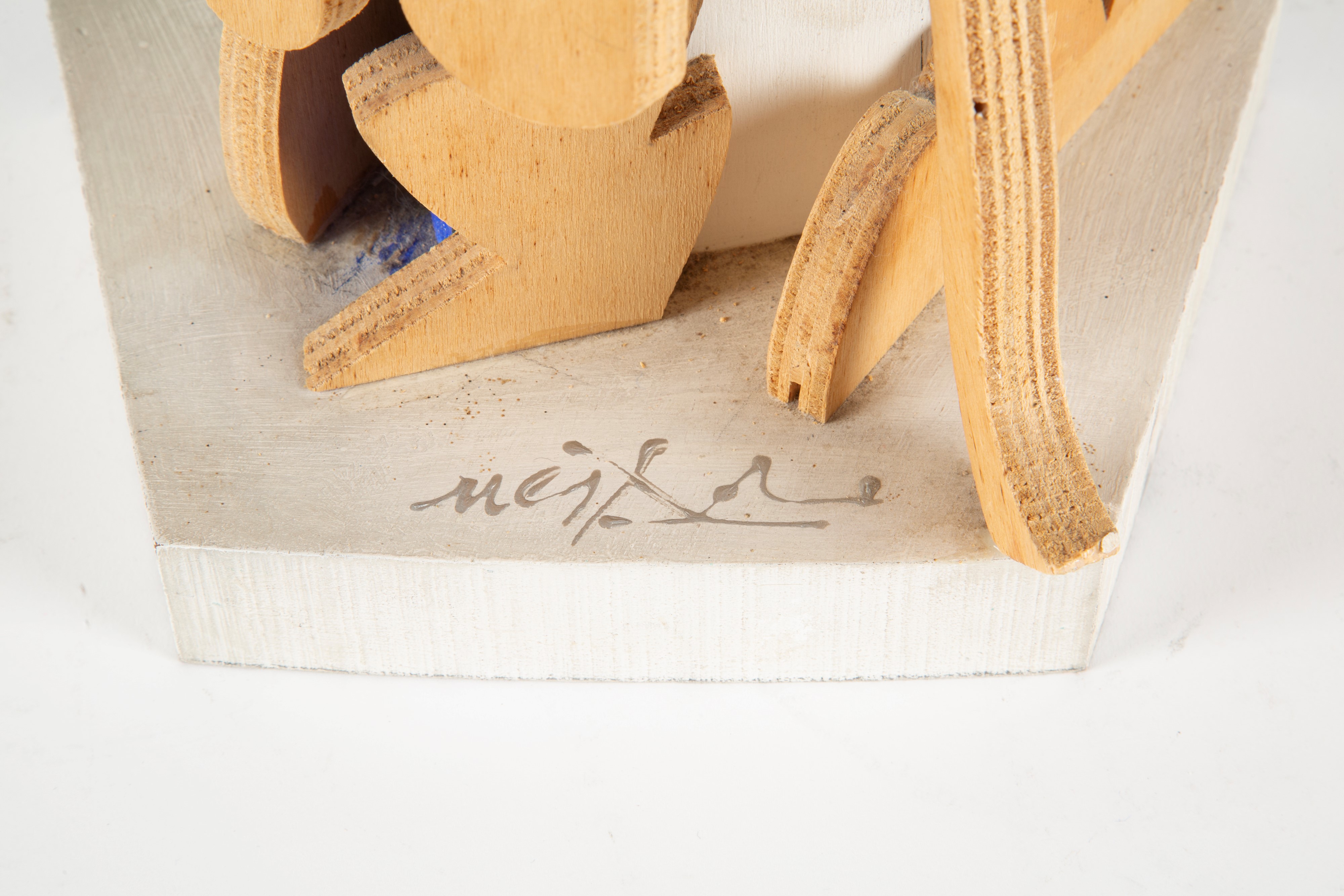 Scultura in legno raffigurante "NUMERI IN MOVIMENTO". Firmata sul retro sulla base.