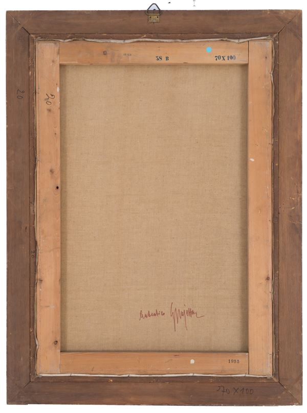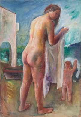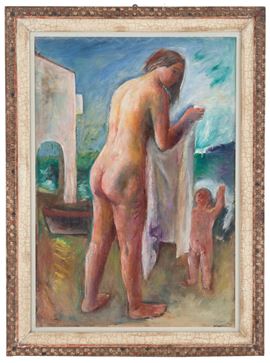 Dipinto olio su tela raffigurante "MADRE E FIGLIO SULLA SPIAGGIA". Timbro 00060 sul retro. In cornice. Numero di archiviazione 3060. Esposto alla mostra "Guido Pajetta. Anni trenta-ottanta", Galleria d'Arte Cafiso, Milano, 18 maggio - 18 giugno 1994. Pubblicato nel catalogo generale ragionato dei dipinti di Guido Pajetta; a cura di Enrico Crispolti. Vol. I, p. 84.