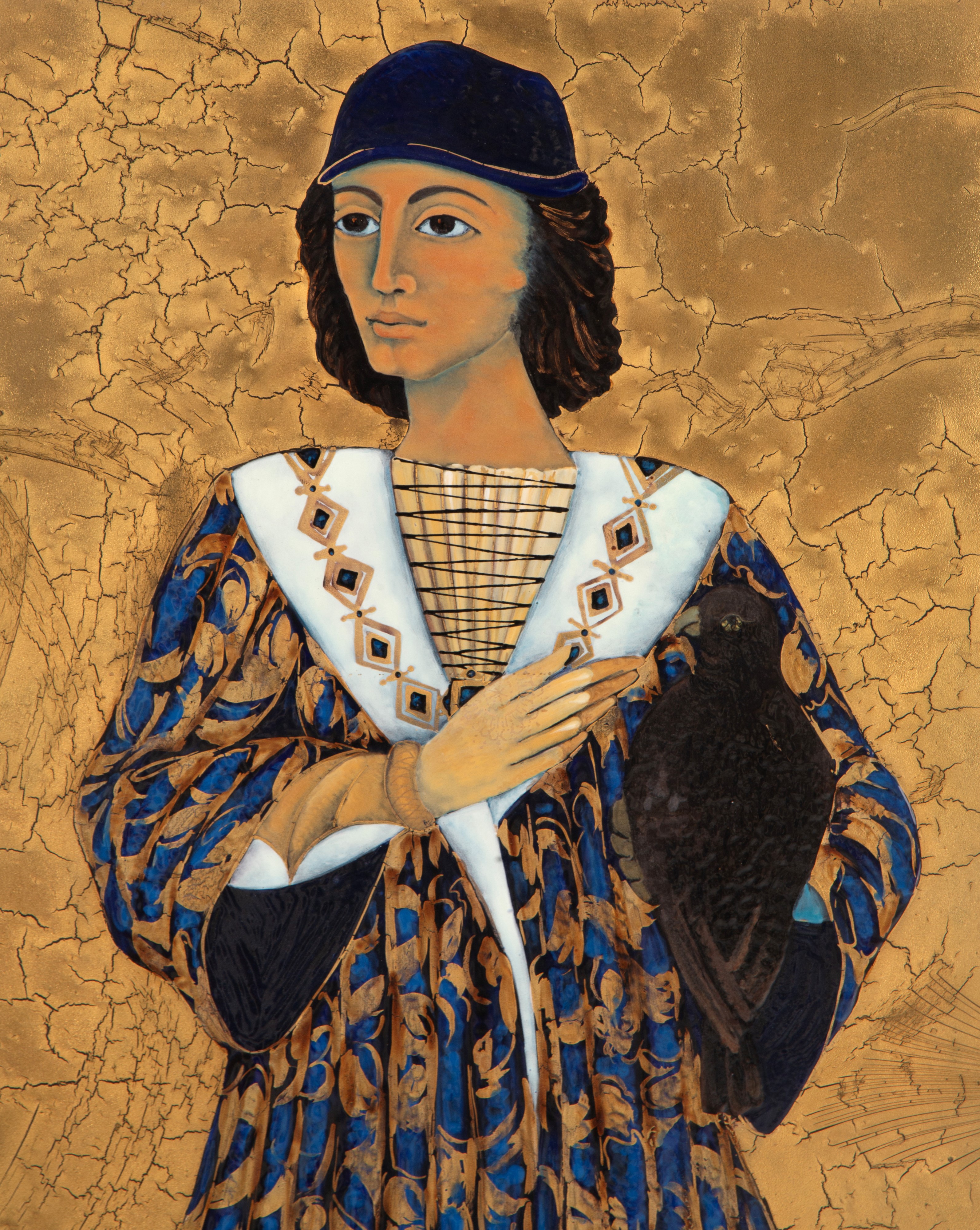 Pannello in smalto su legno raffigurante "FANCIULLO CON RAPACE". Firma non identificata in basso a destra. XX secolo. In cornice.