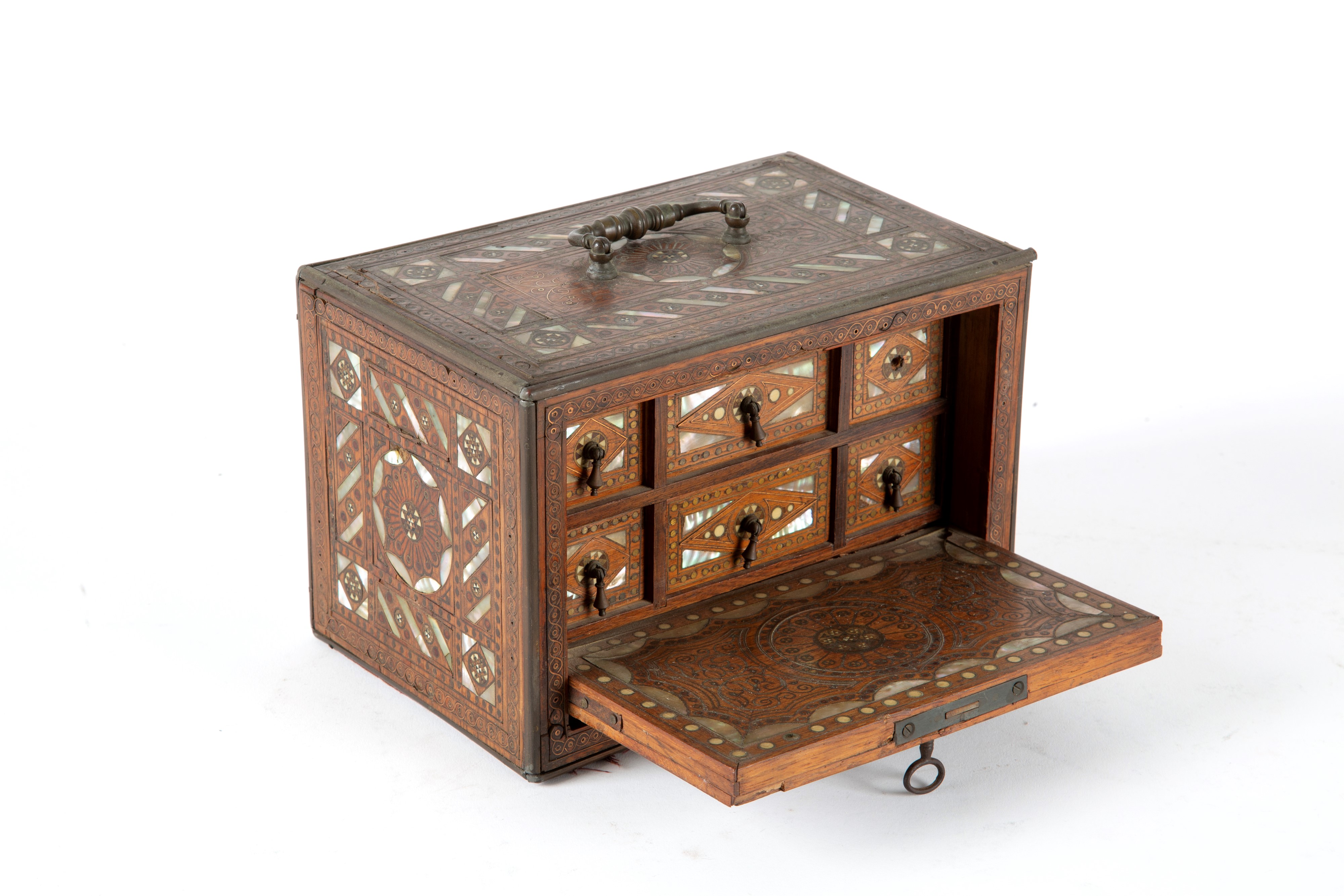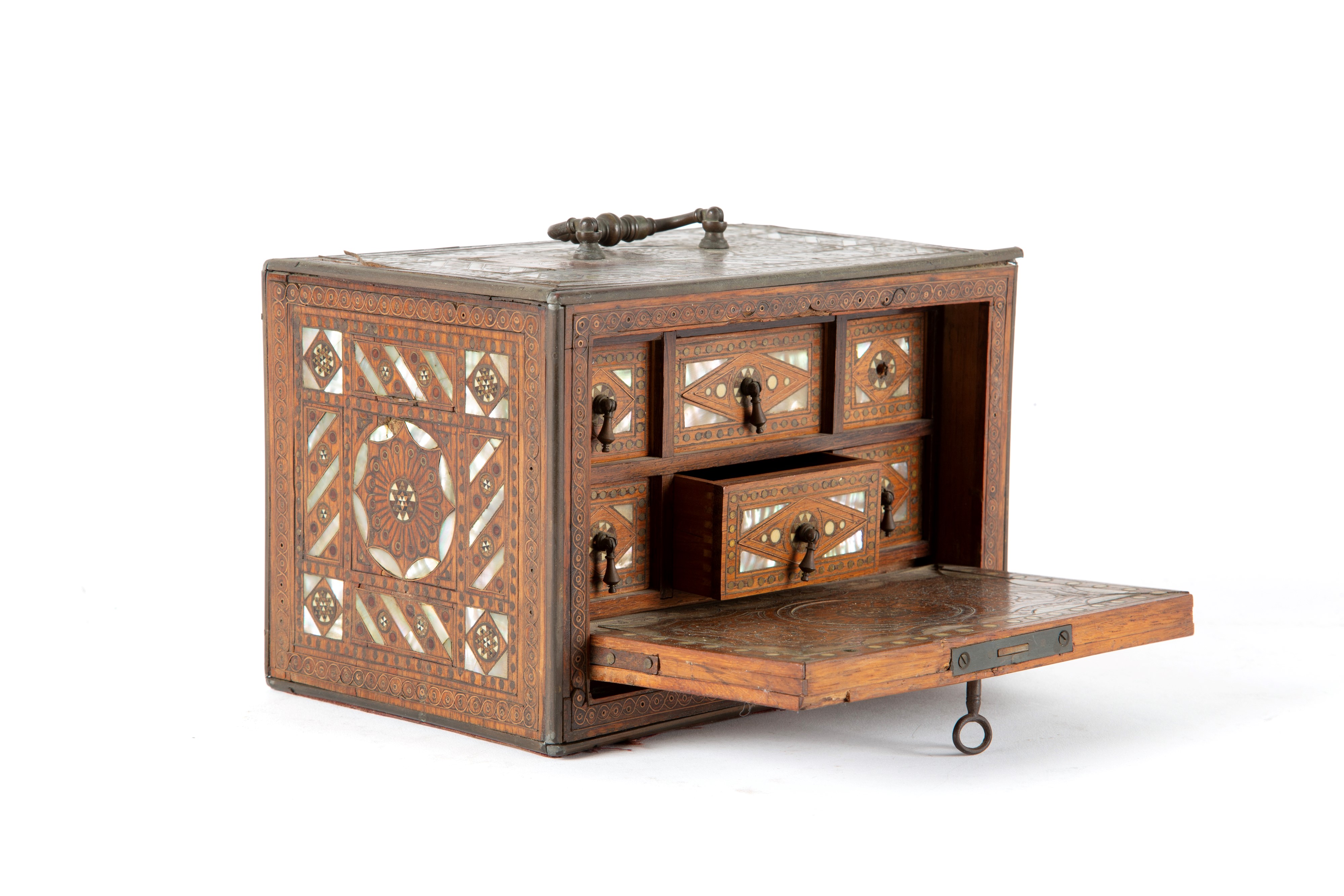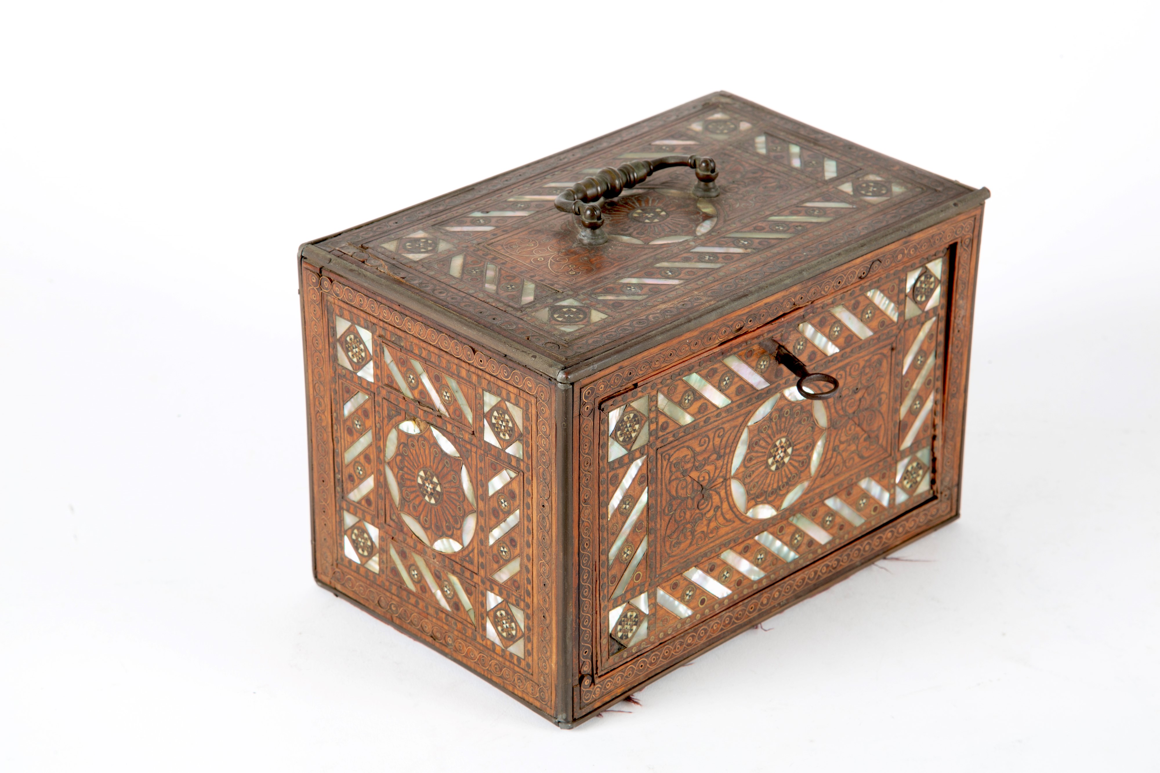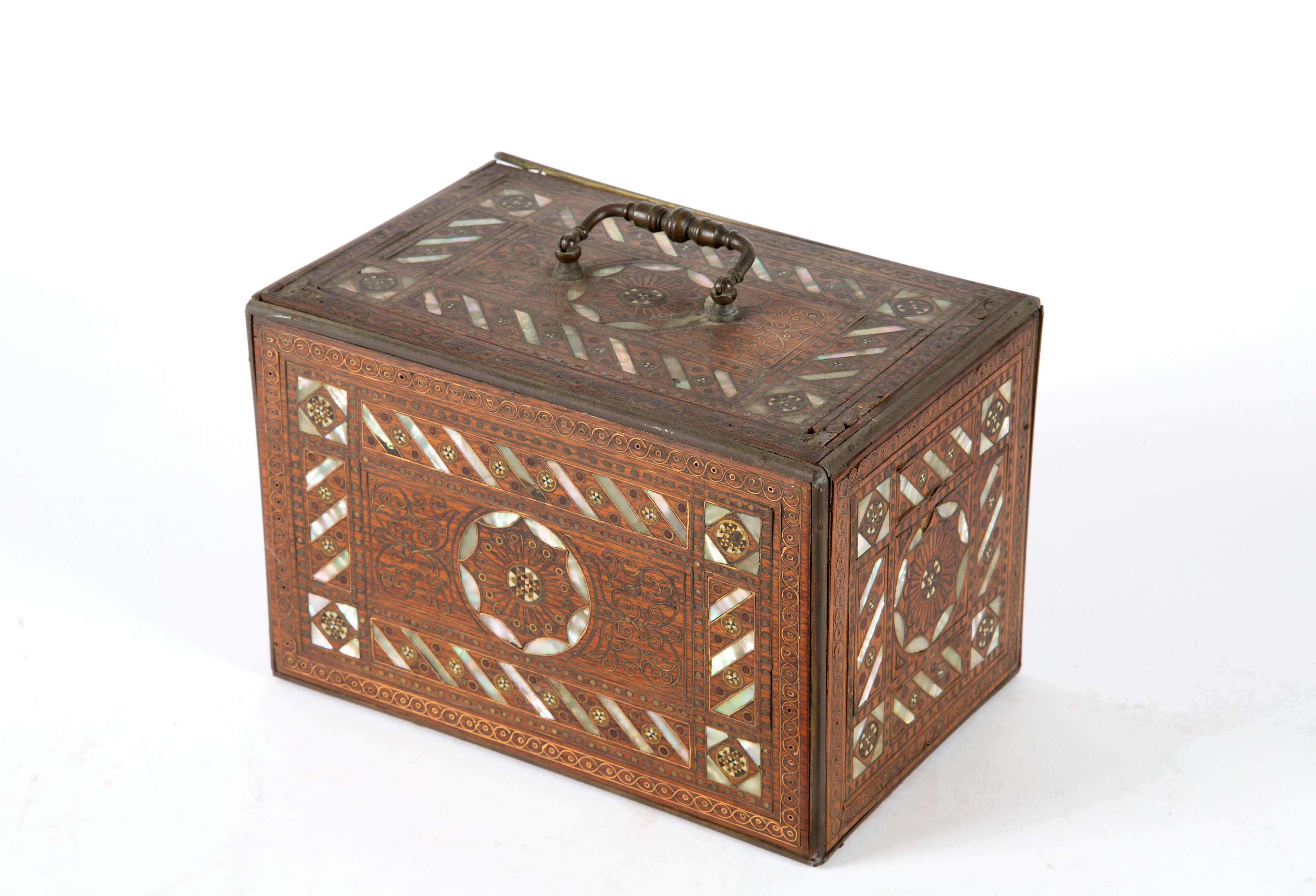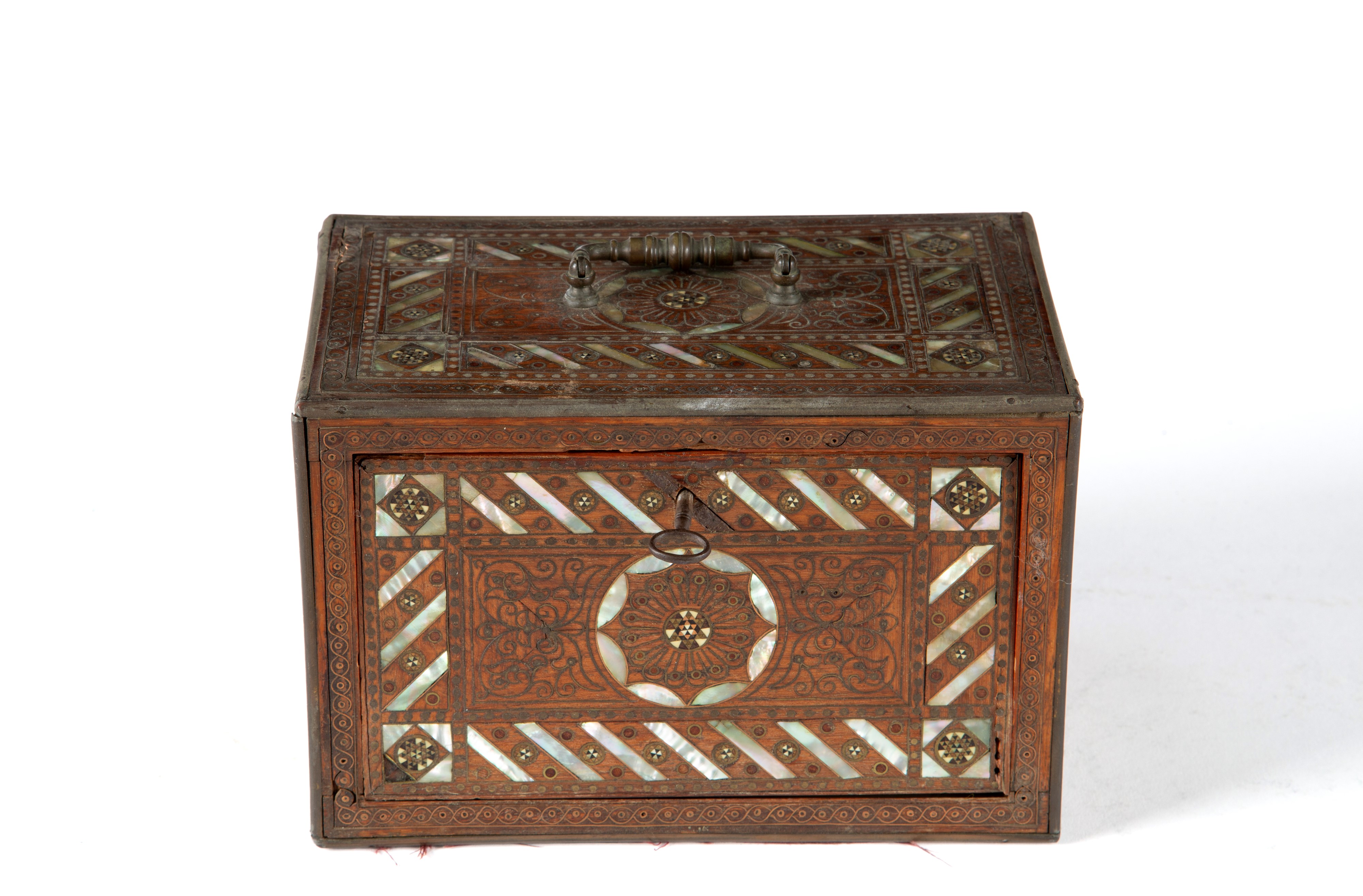Portagioie in legno filettato in rame con intarsi in madreperla. Metà XIX secolo. Difetti.