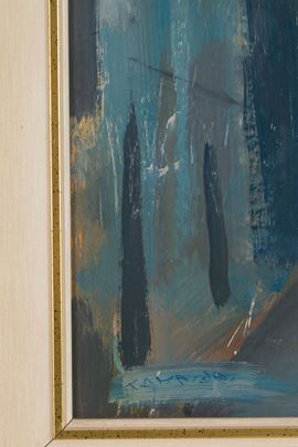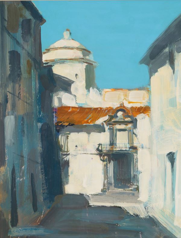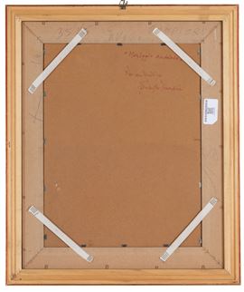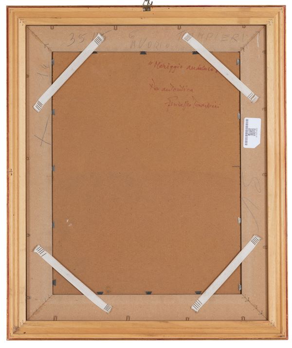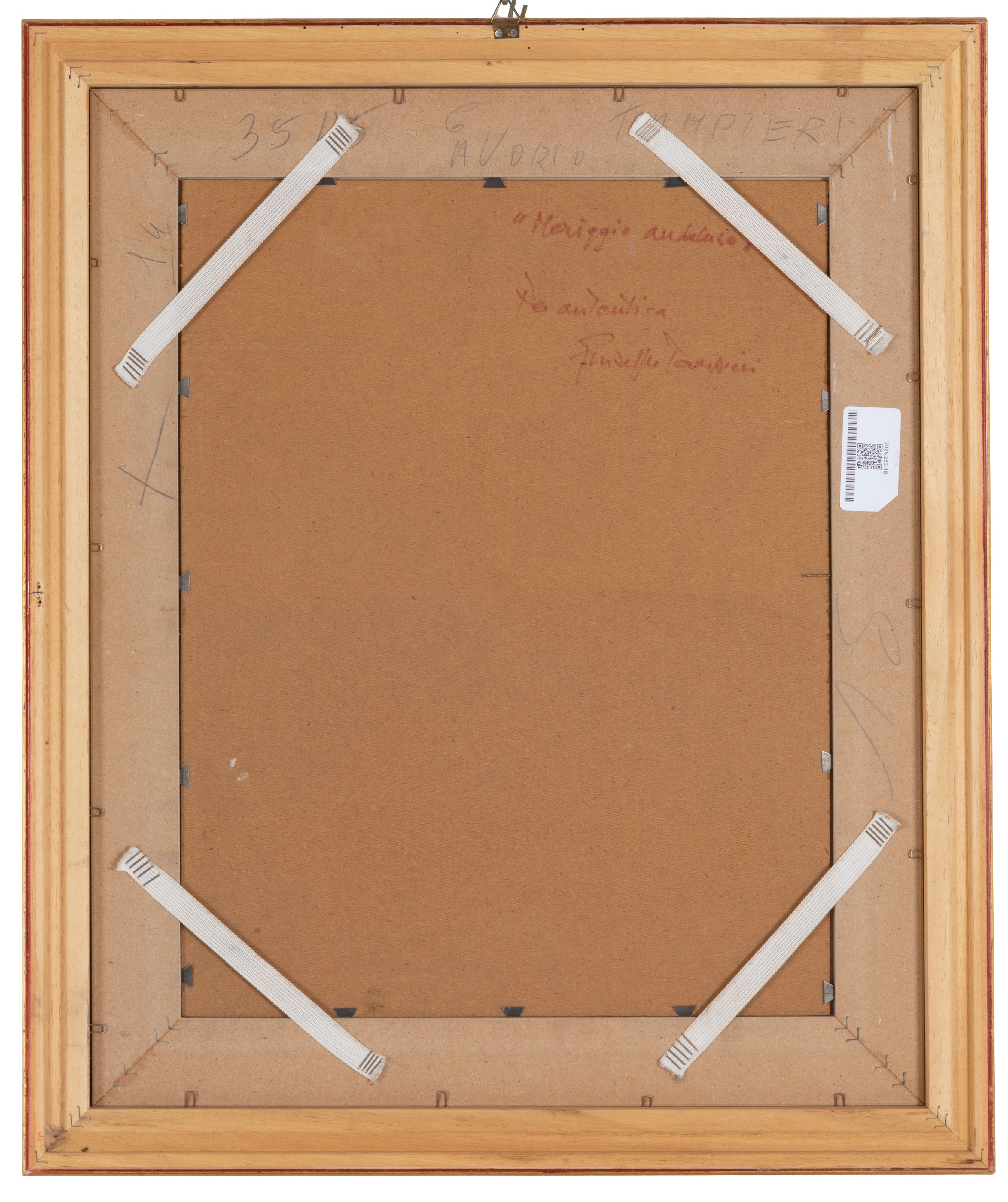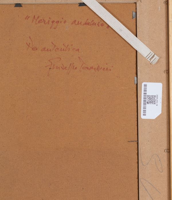 Dipinto olio su compensato intitolato "MERIGGIO ANDALUSO". Firmato in basso a sinistra. Intitolato sul retro. In cornice.