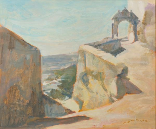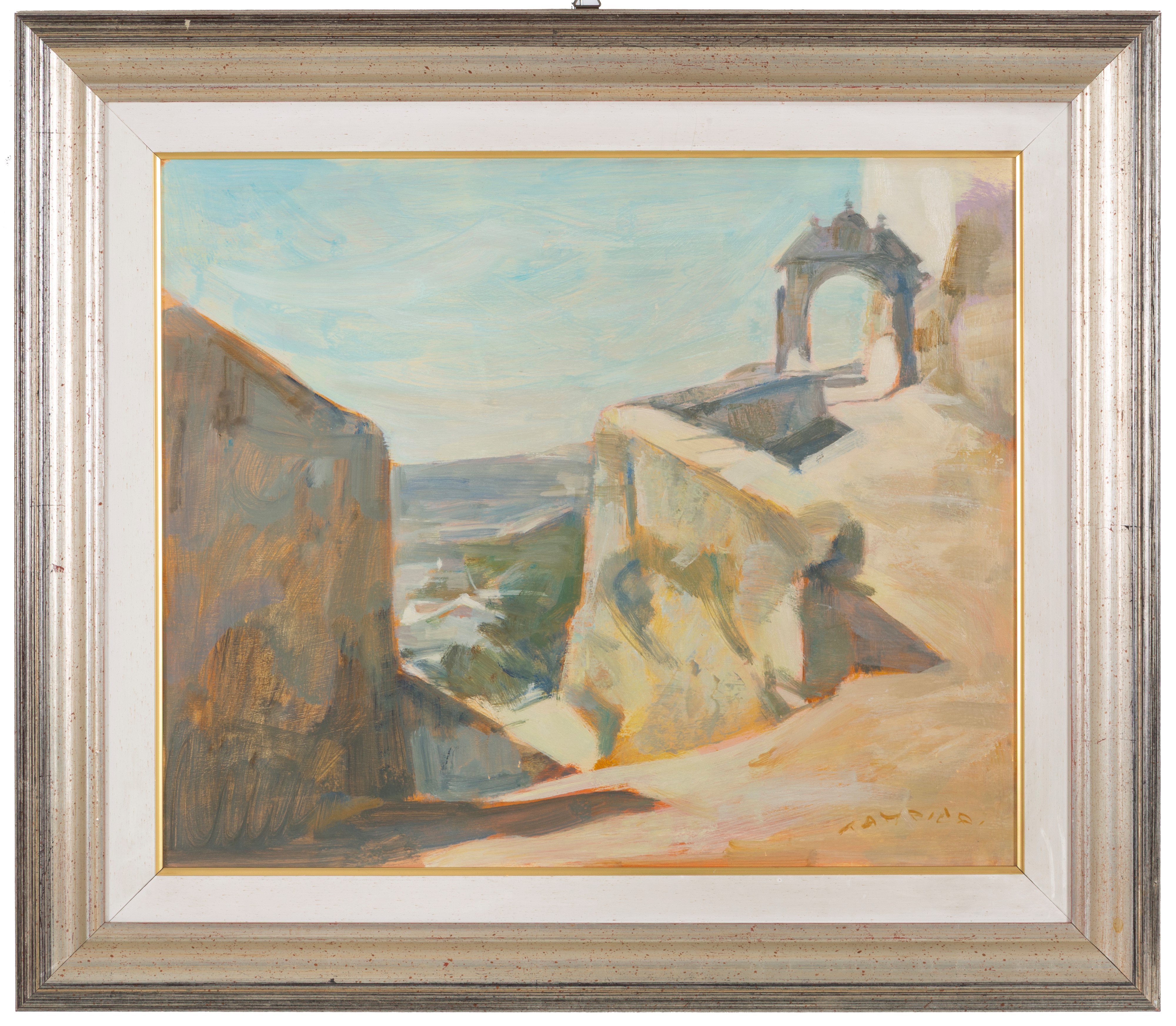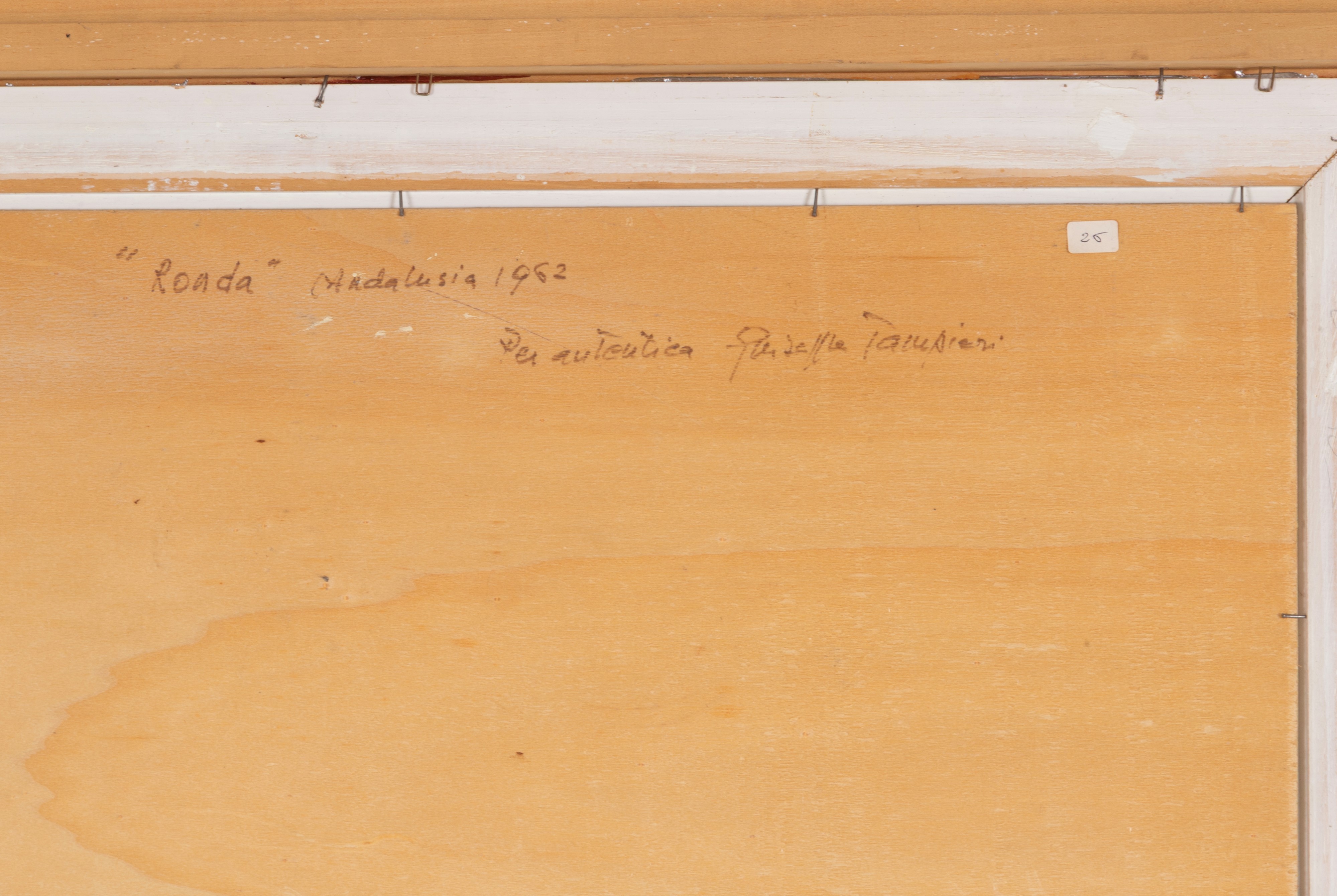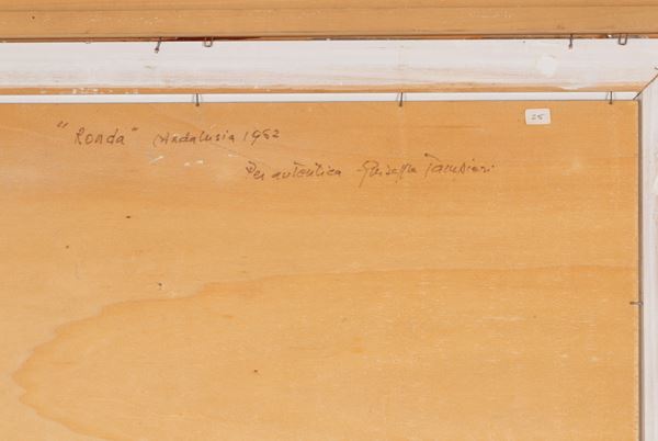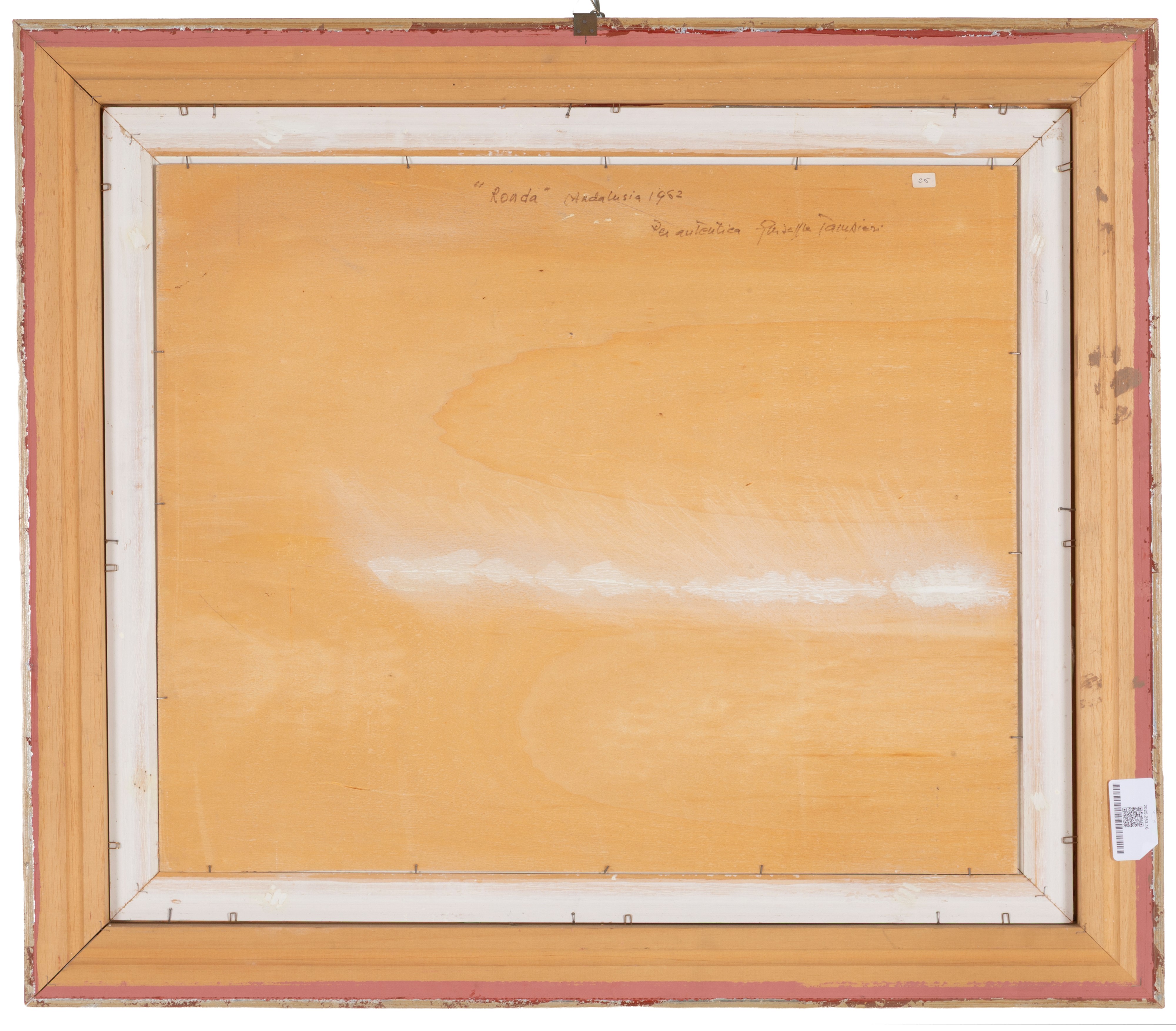 Dipinto olio su tavoletta intitolato "RONDA, ANDALUSIA". Firmato in basso a destra. Intitolato e datato 1962 sul retro. In cornice.