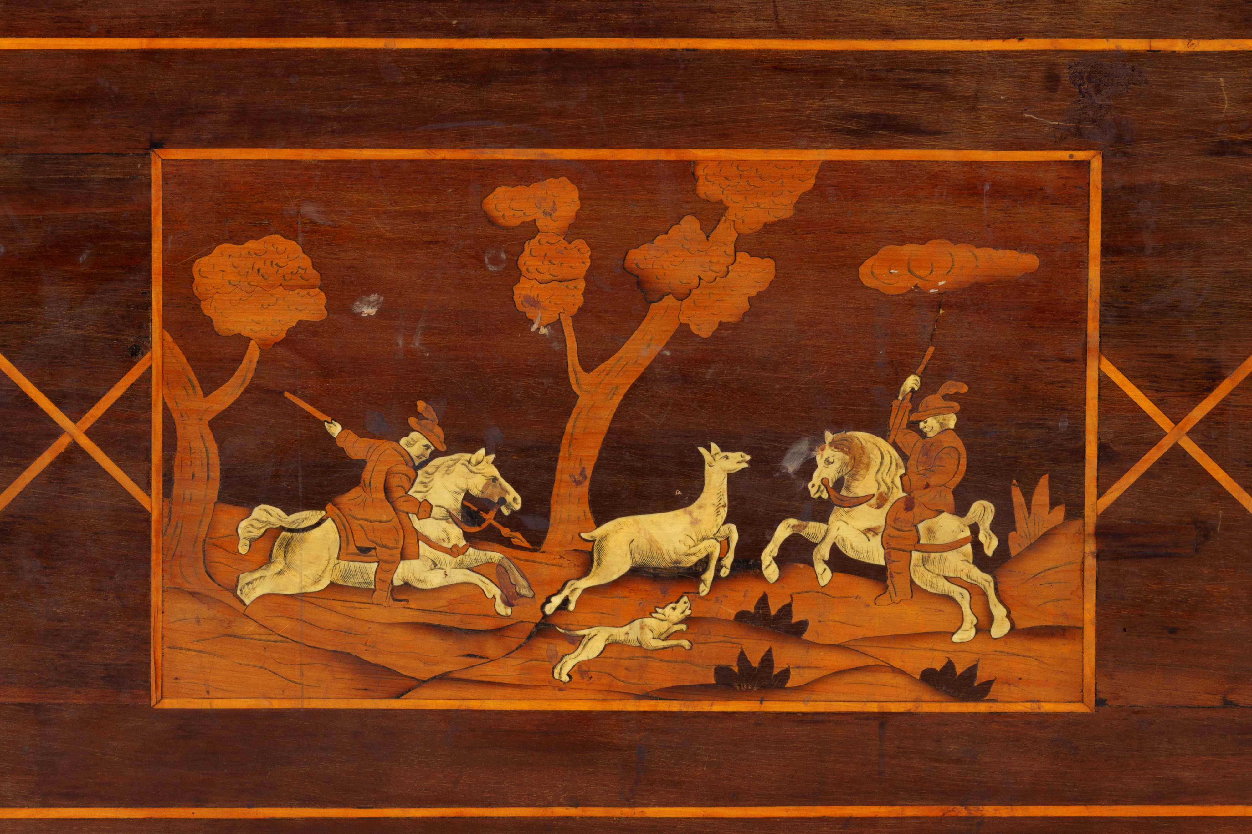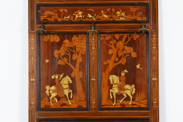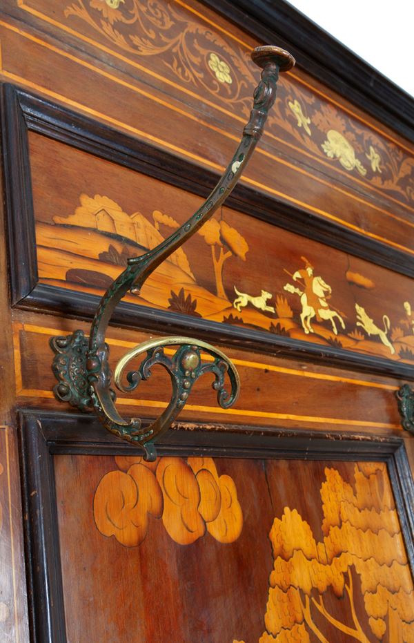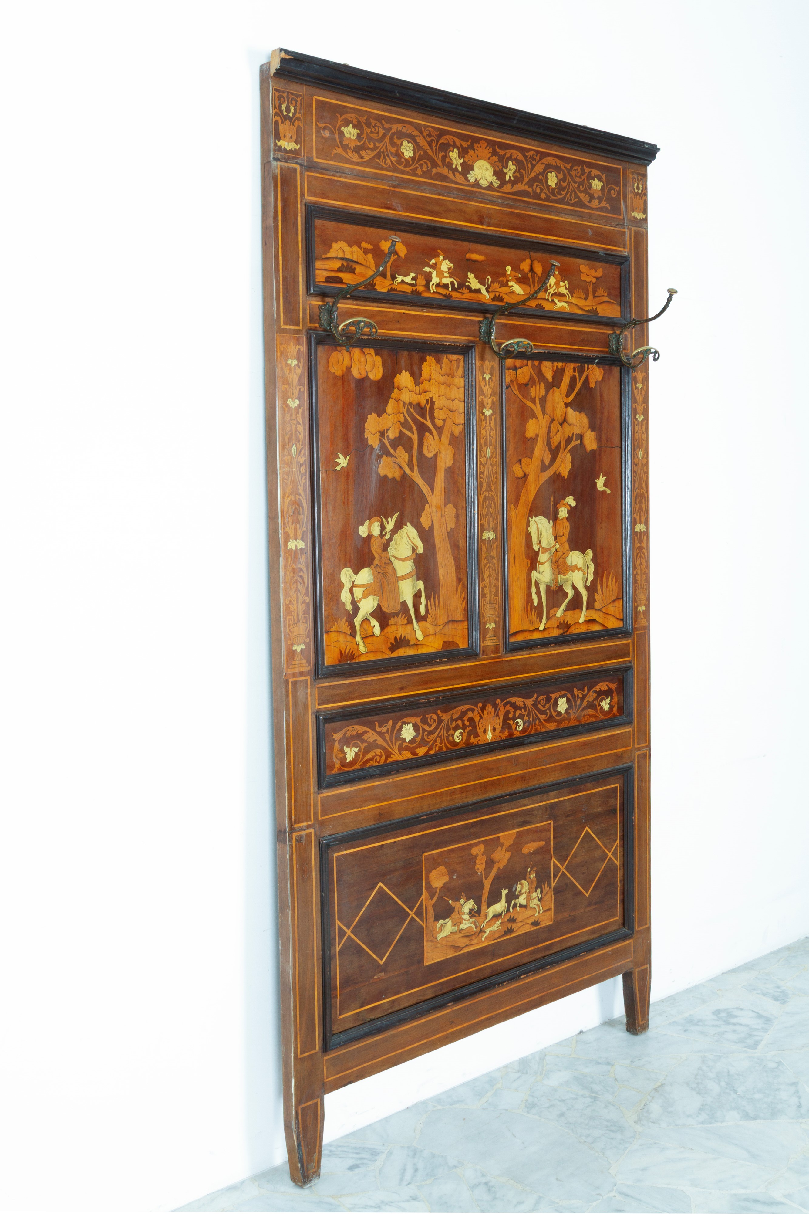 Appendiabiti da muro  in stile Luigi XVI intarsiato in legni vari con applicazioni in metallo dorato. Fine XIX-inizi XX secolo. Difetti.