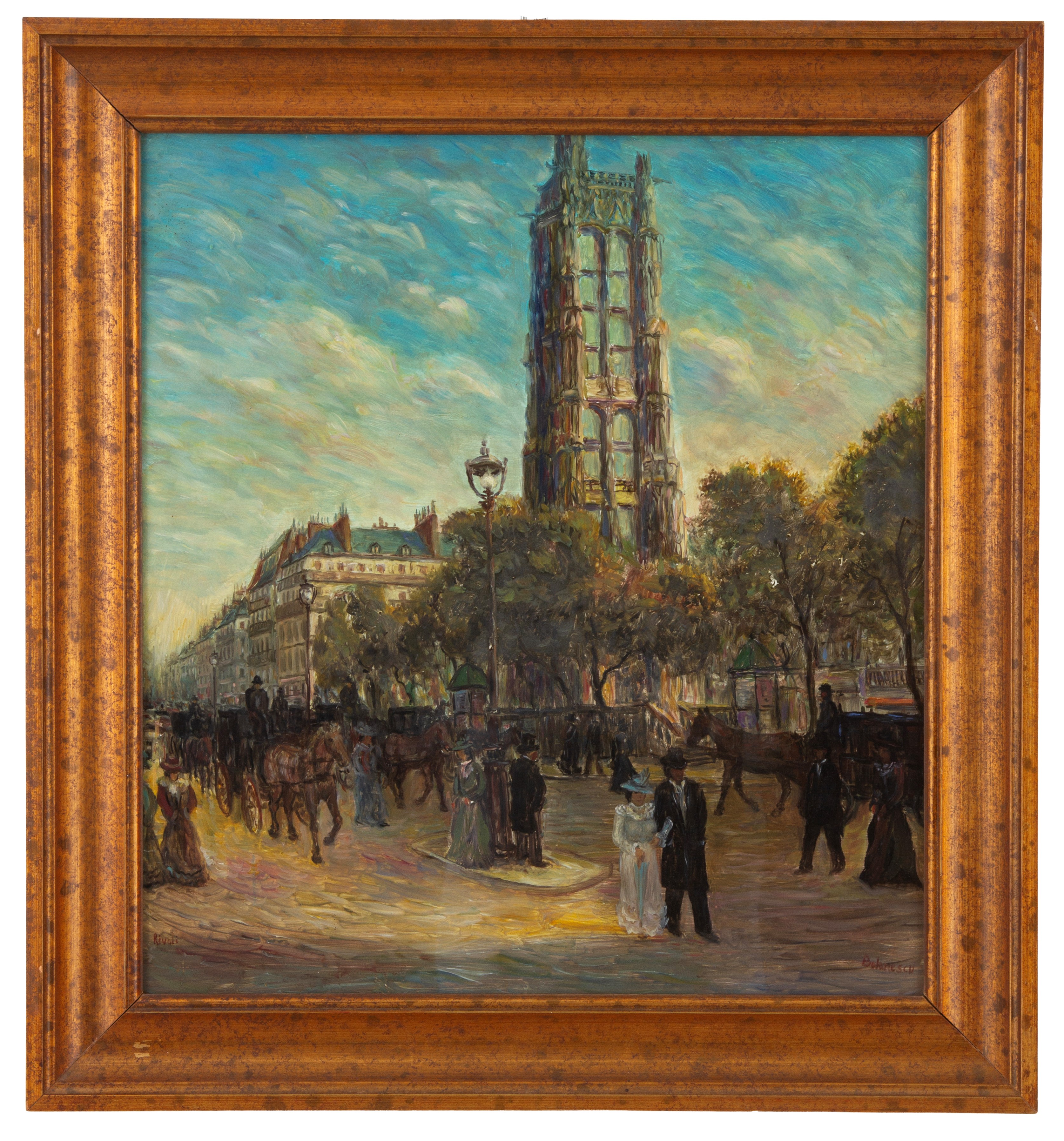 Dipinto olio su cartone raffigurante "VEDUTA DI PARIGI". Intitolato "RIVOLI" in basso a sinistra. Firmato in basso a destra. In cornice.