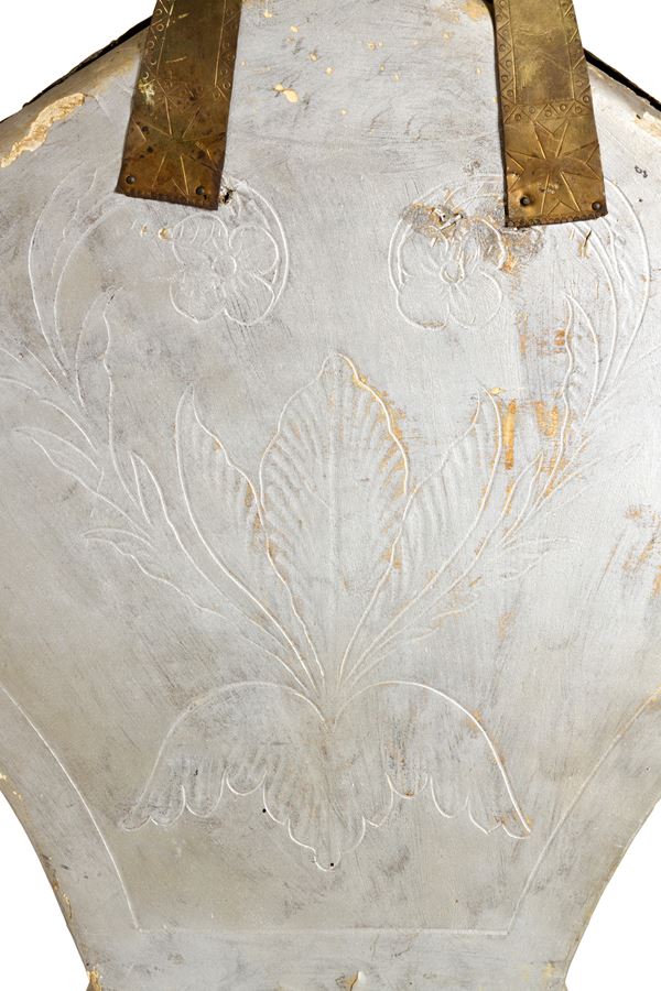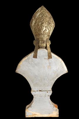 Busto in rame finemente sbalzato, argentato e dorato raffigurante "VESCOVO". XVIII secolo. Lievi difetti.