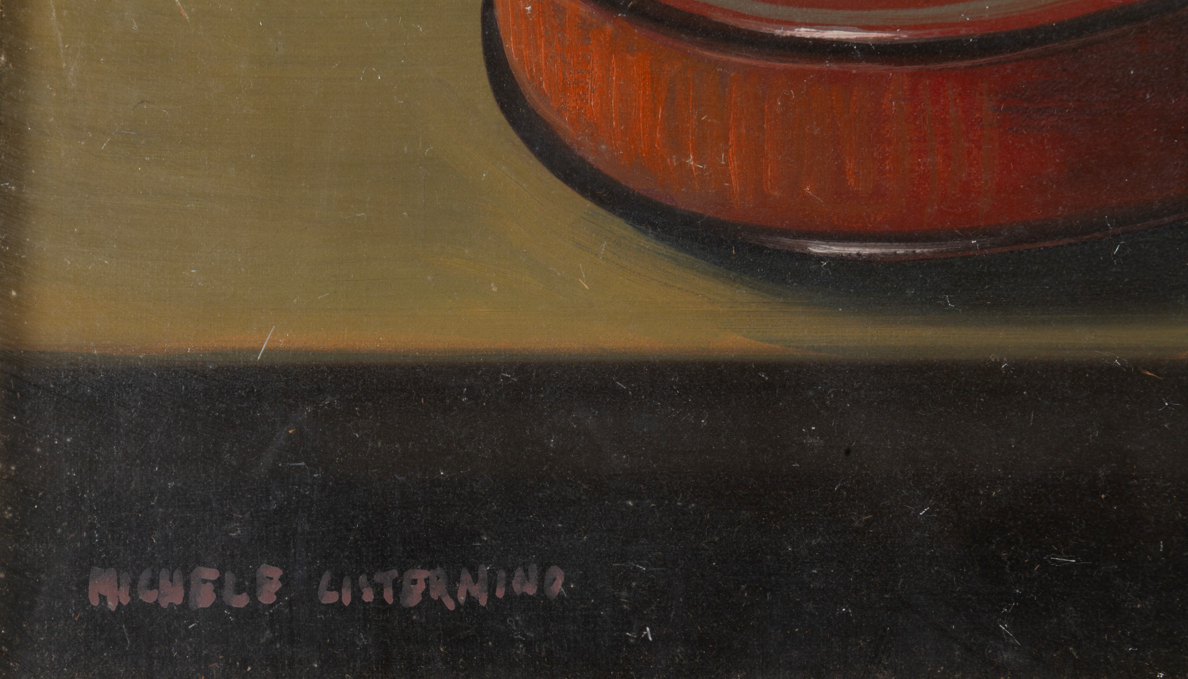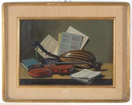 Dipinto olio su tela raffigurante "NATURA MORTA CON STRUMENTI MUSICALI". Firmato in basso a sinistra. In cornice.