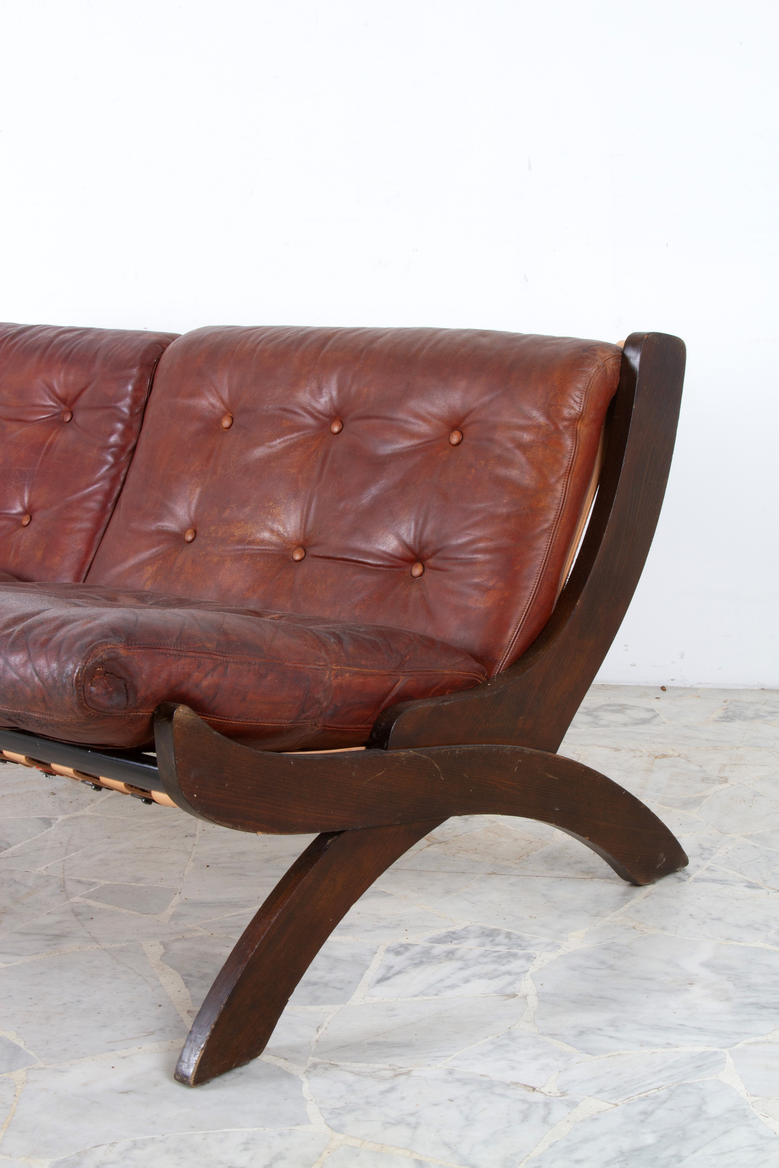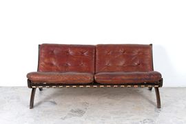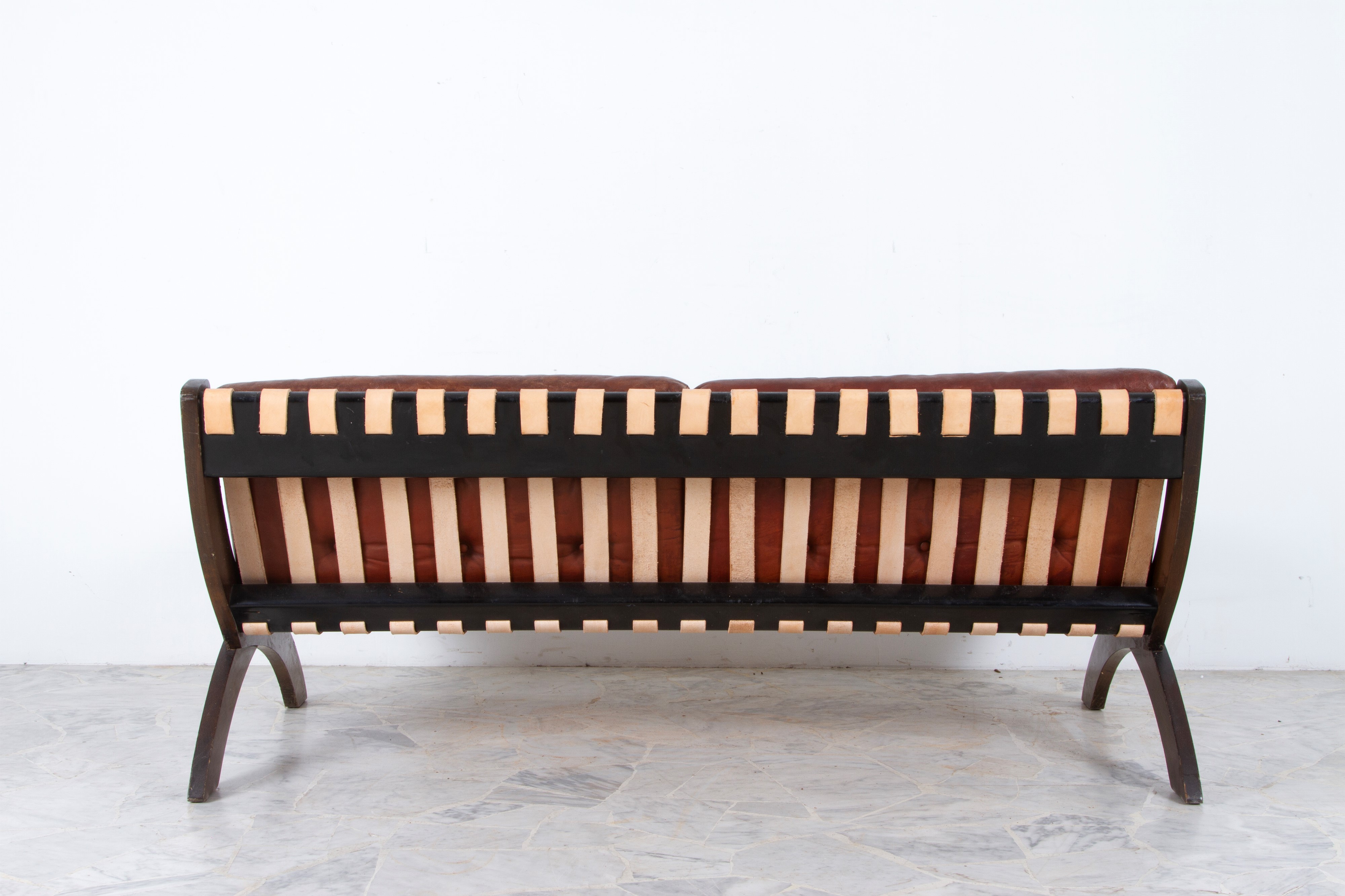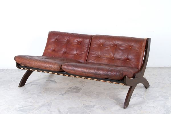 Divano due posti modello CP1 in legno con sedute in pelle marrone. Produzione DE PADOVA. Anni '60.