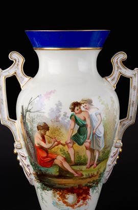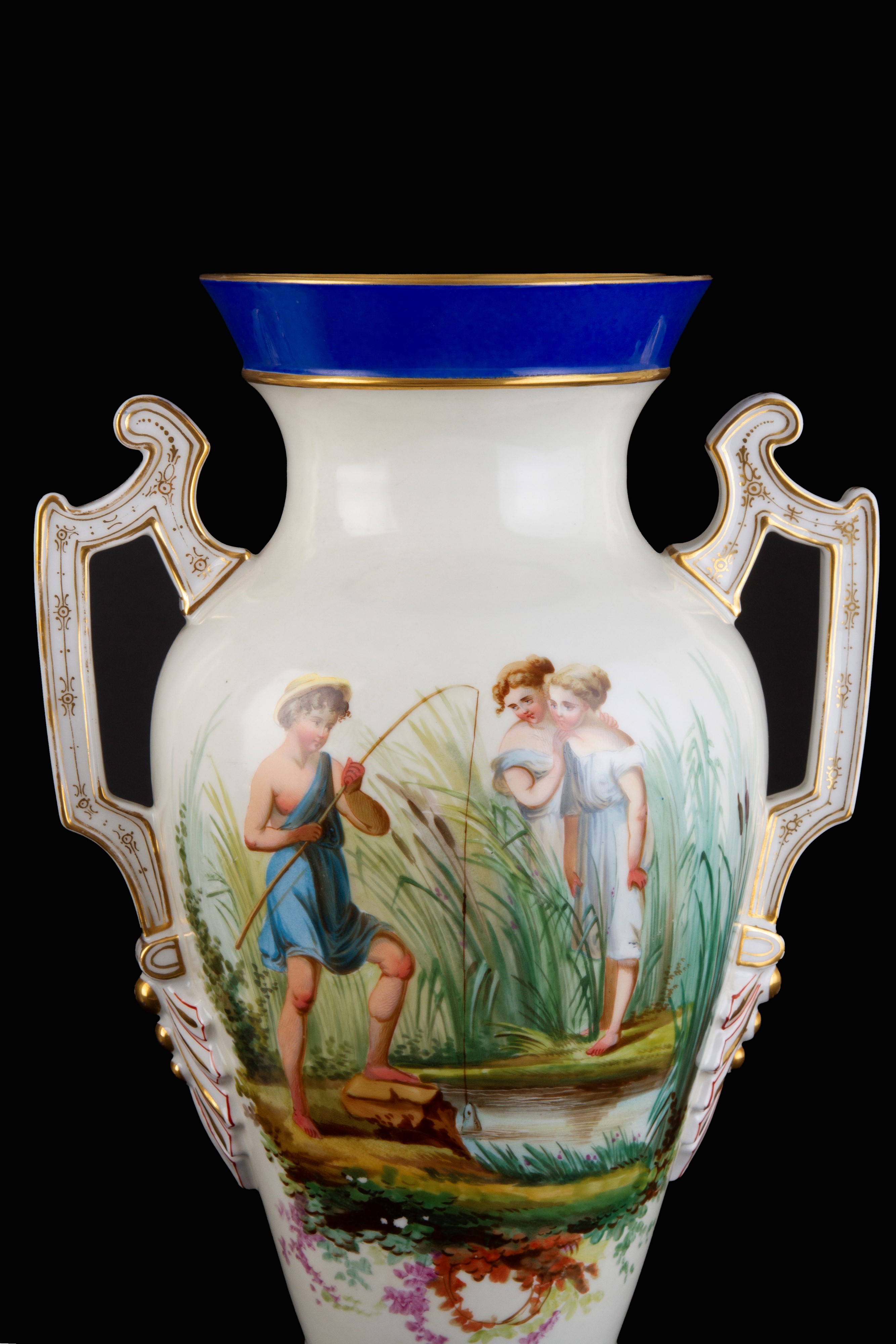Coppia di vasi in porcellana decorato con scene di vita e bambini. Parigi. XIX secolo.