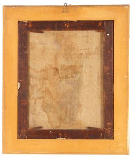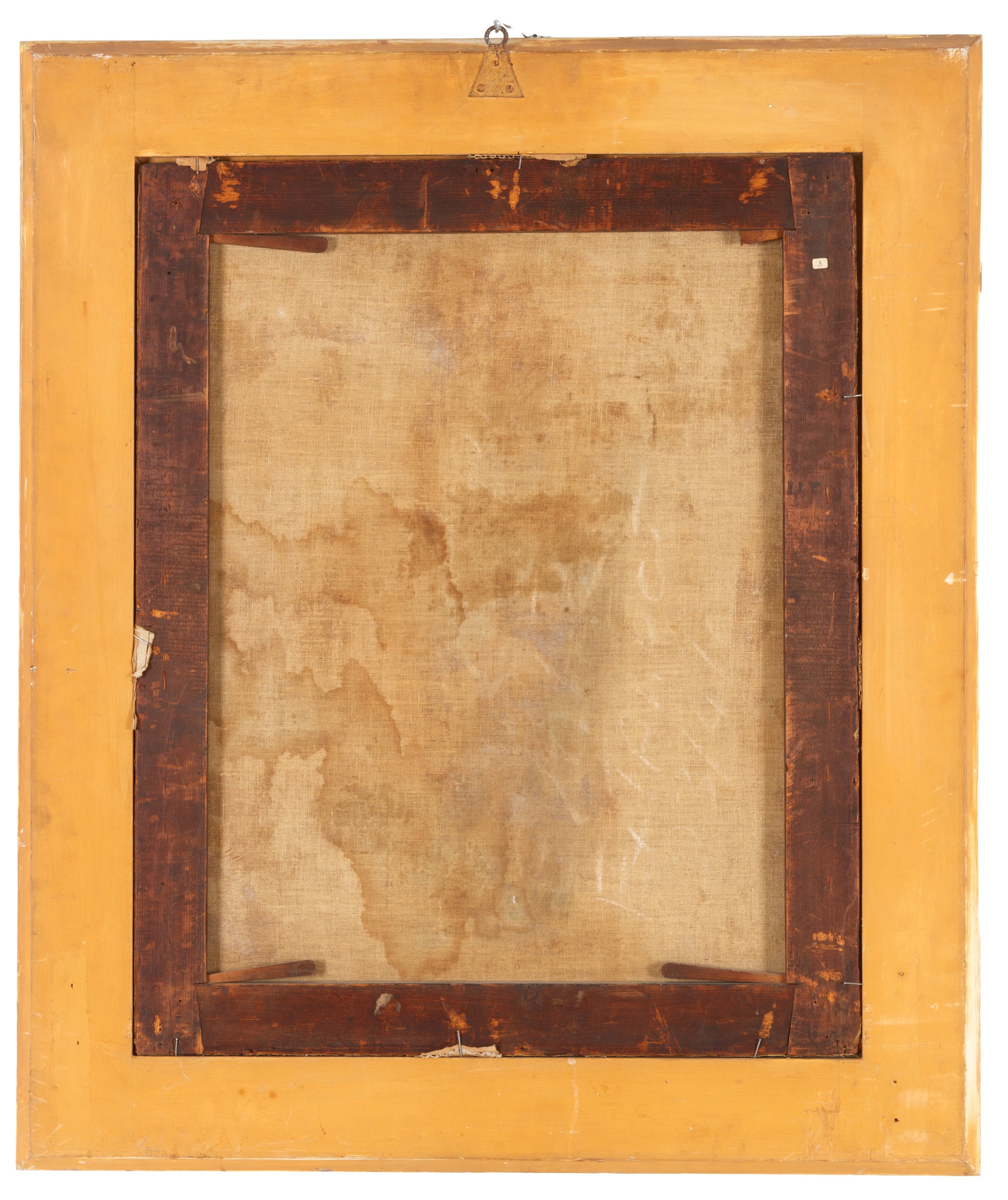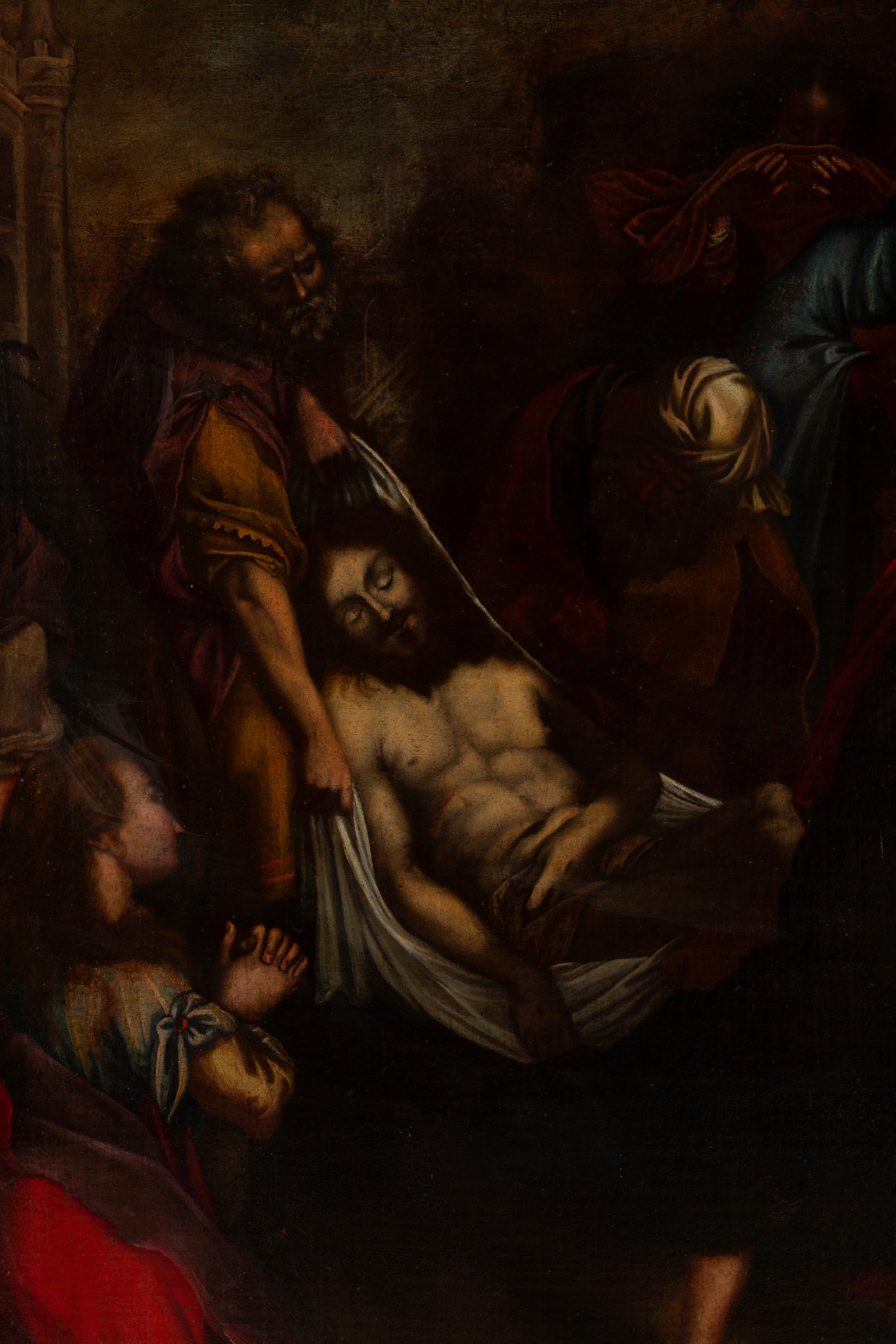 Dipinto olio su tela raffigurante "DEPOSITION". XVII secolo. In cornice. Difetti e restauri. Già rintelato e rintelaiato.