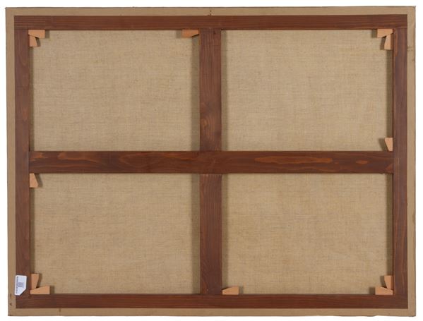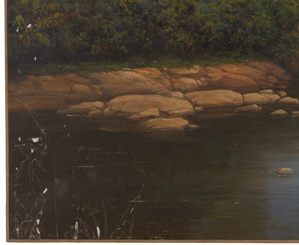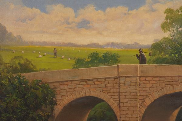 Dipinto olio su tela raffigurante "PAESAGGIO FLUVIALE CON PONTE". Fine XIX secolo. Lievi difetti. Già rintelato e rintelaiato.