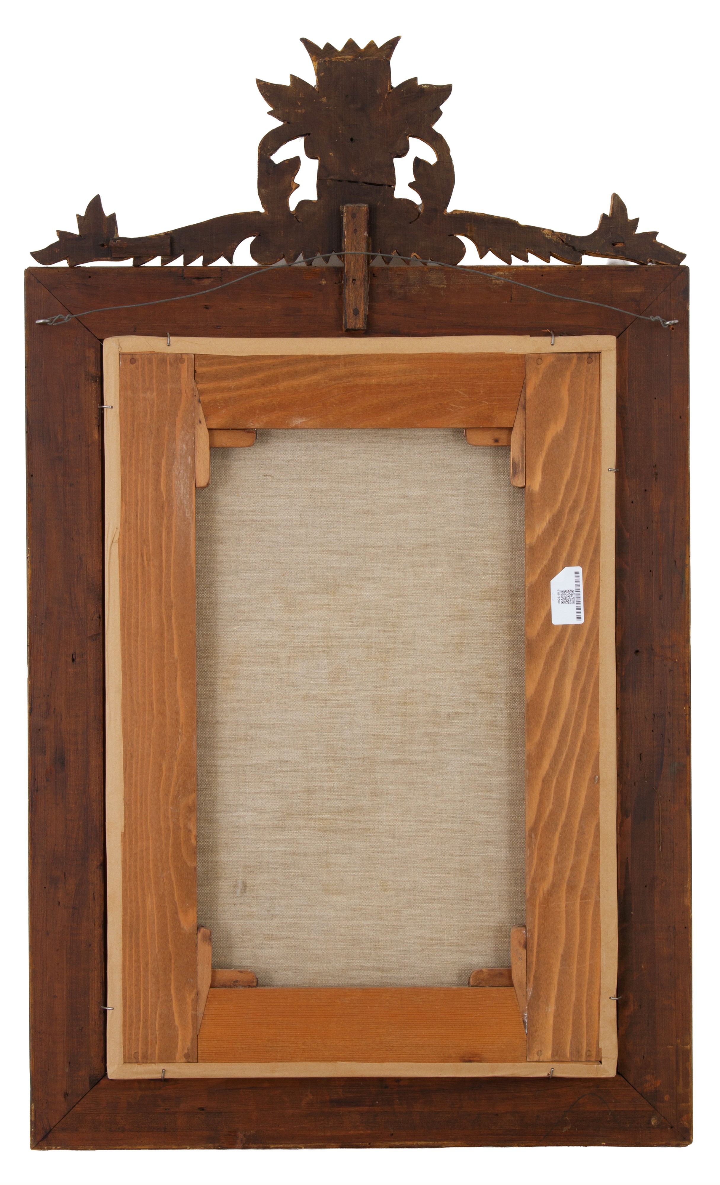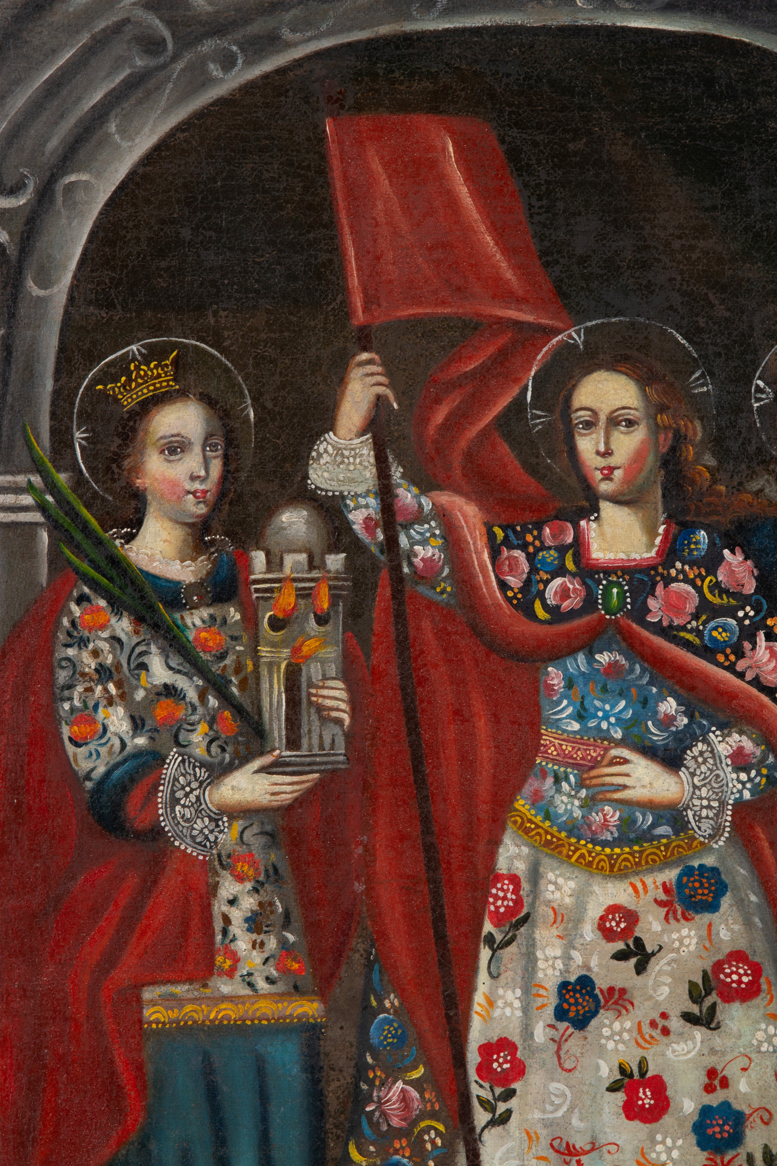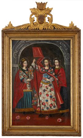 SCUOLA DI CUZCO DEL XVIII SECOLO. Dipinto olio su tela raffigurante "SANTA, SANT'ORSOLA E SANTA BARBARA". In cornice in legno intagliato e dorato con cimasa traforata. Già rintelato e rintelaiato. Restauri.