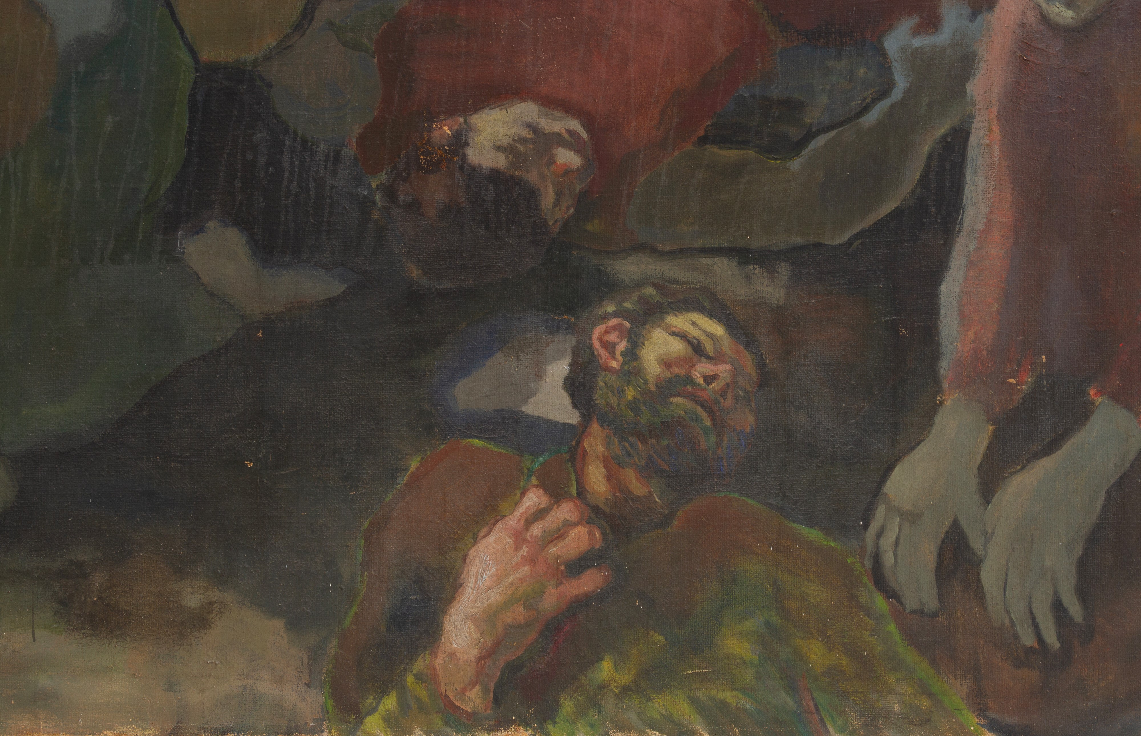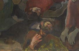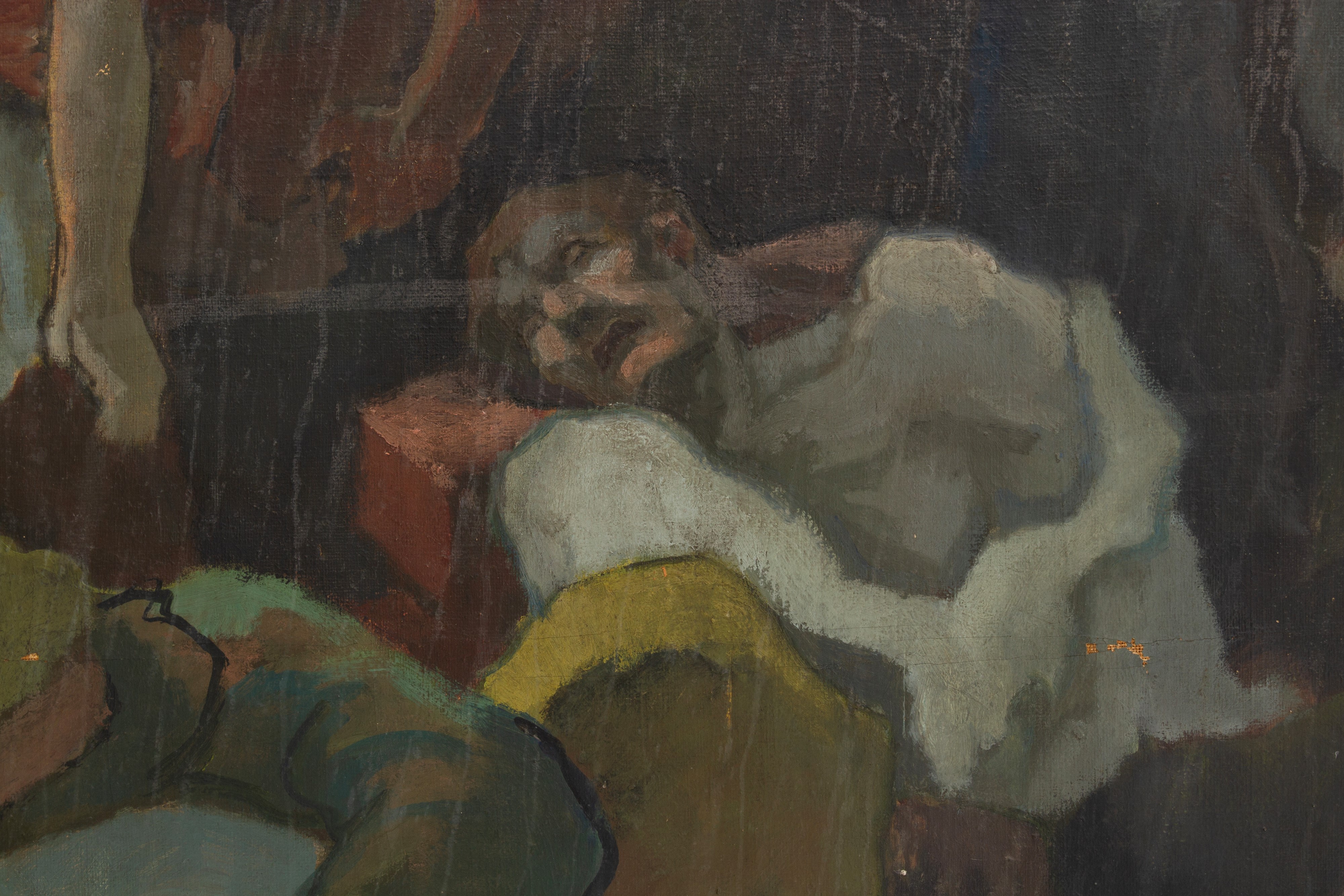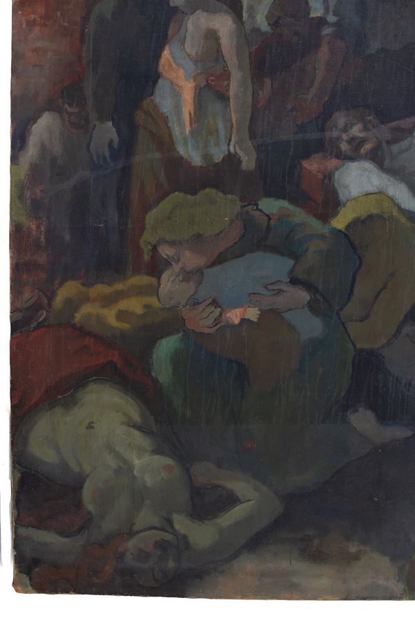 Dipinto olio su tela raffigurante "STRAGE NELLA MINIERA". Russia. Firma non identificata in basso a destra.