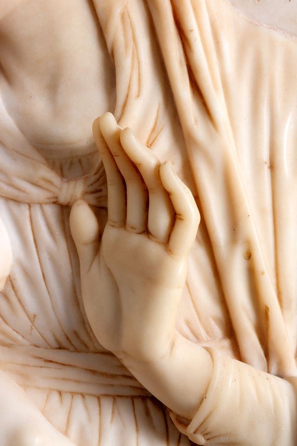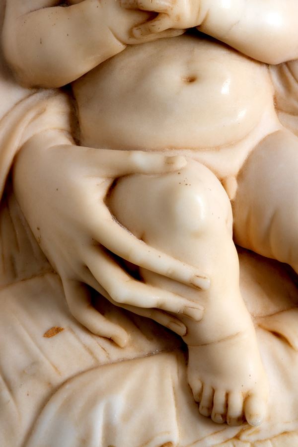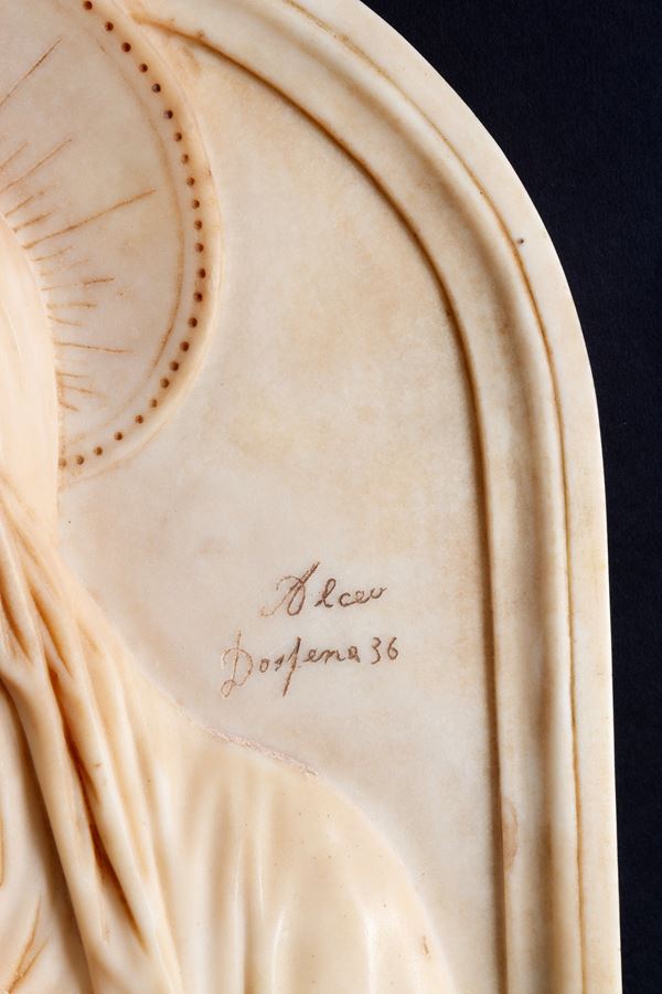 Scultura in marmo raffigurante "MADONNA CON BAMBINO". Firmata e datata '36 in alto a destra.