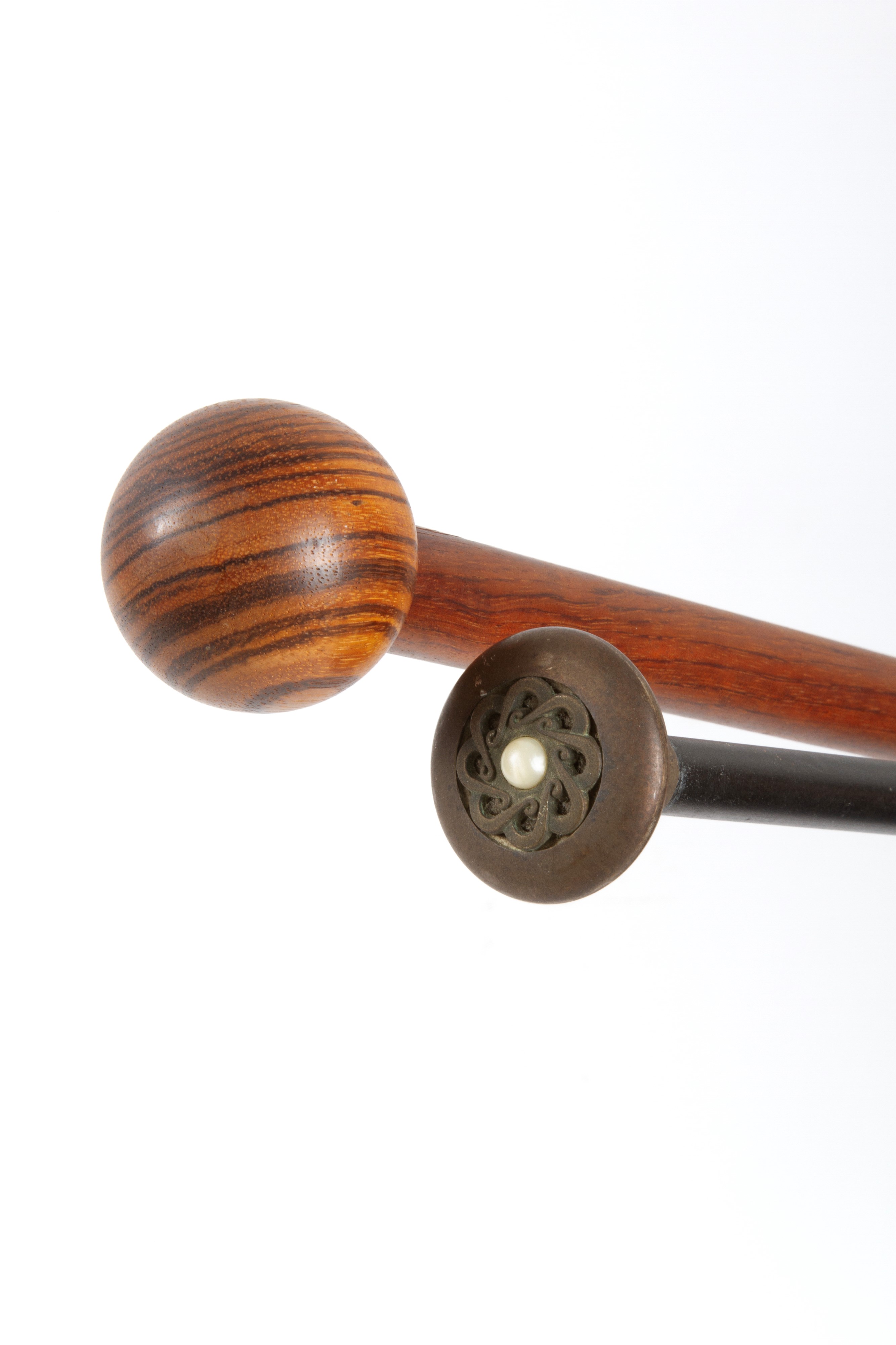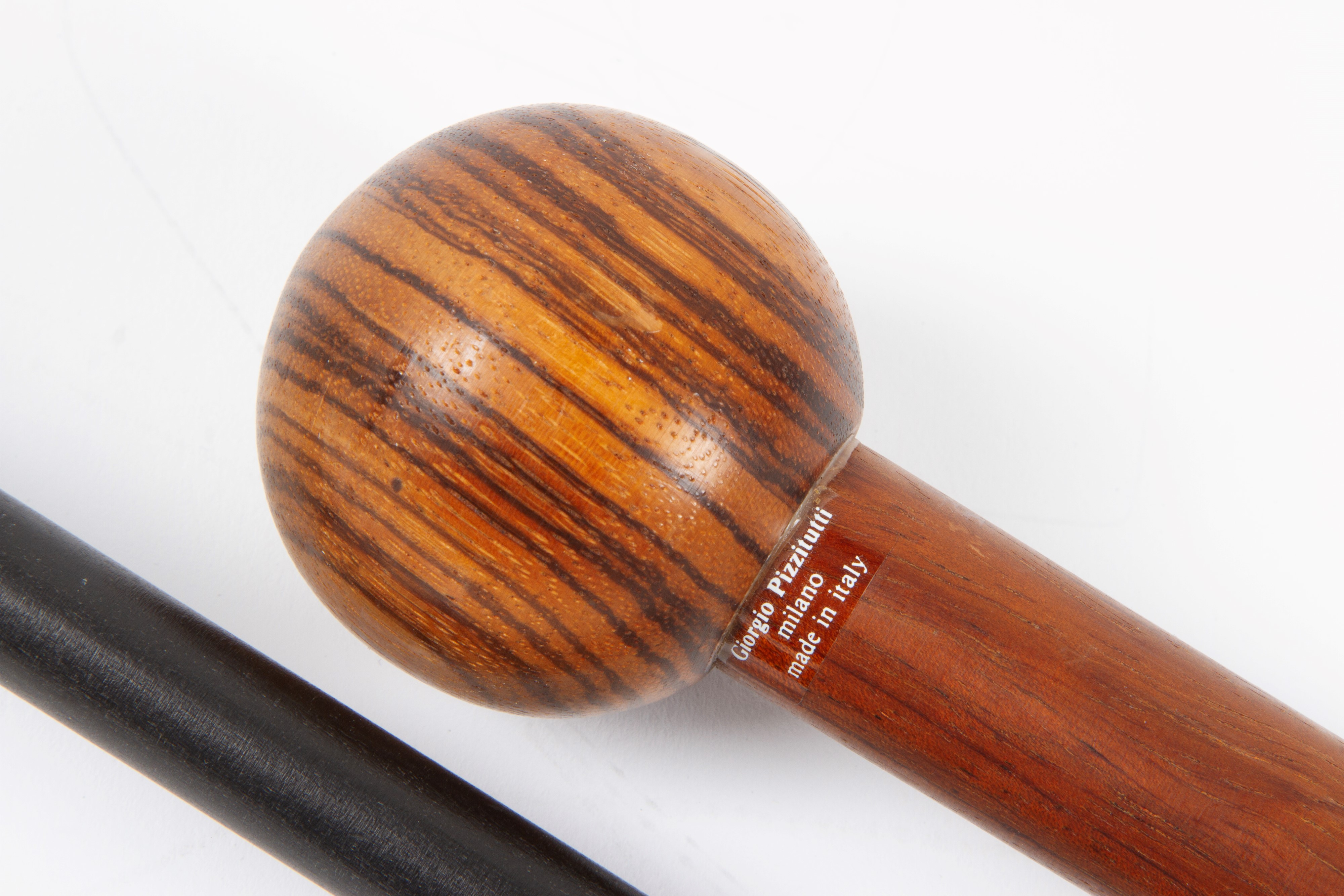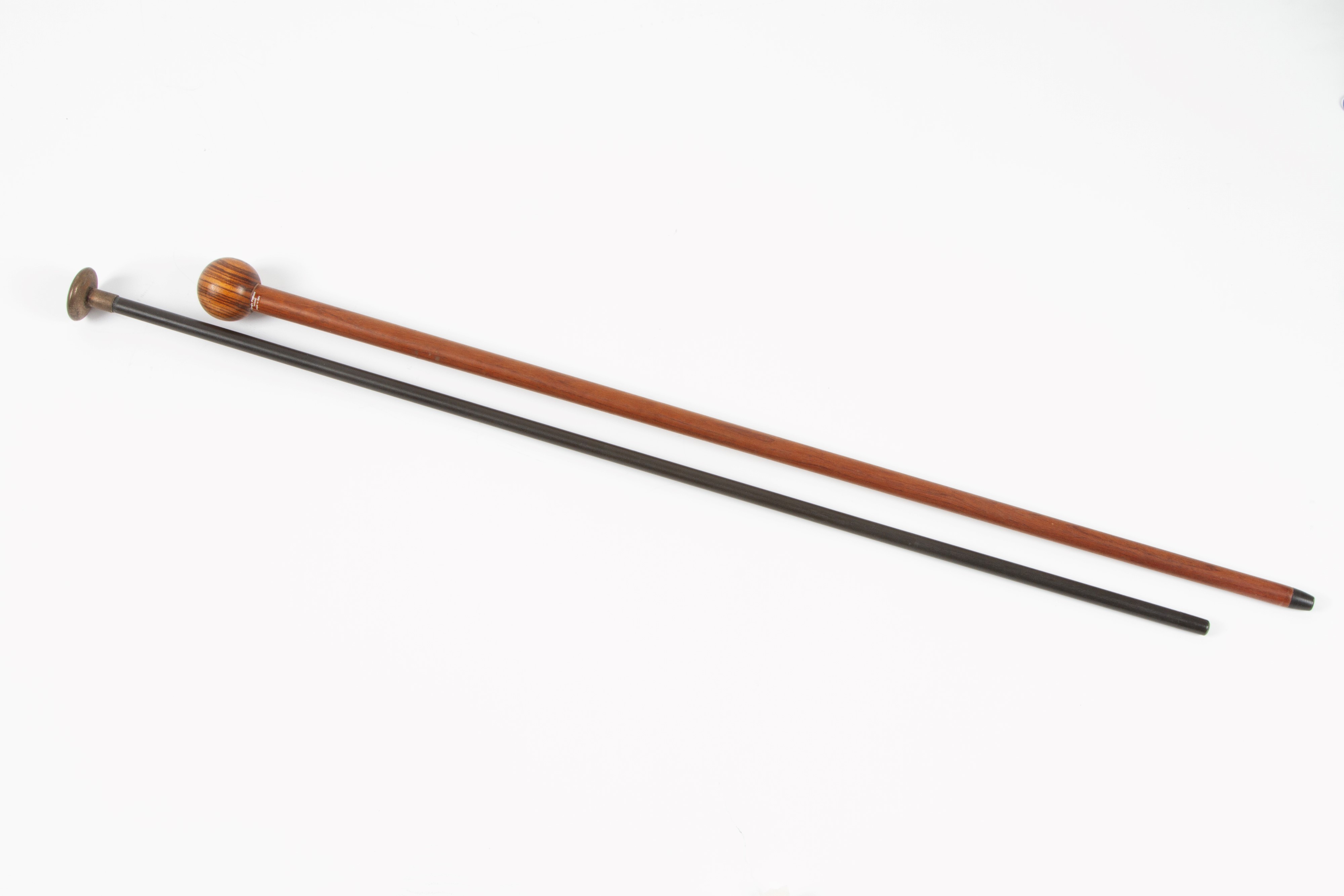 Due bastoni di cui uno in bois de rose con pomolo in bois de violette e uno in ebano con pomolo in metallo. XX secolo. Difetti.
