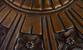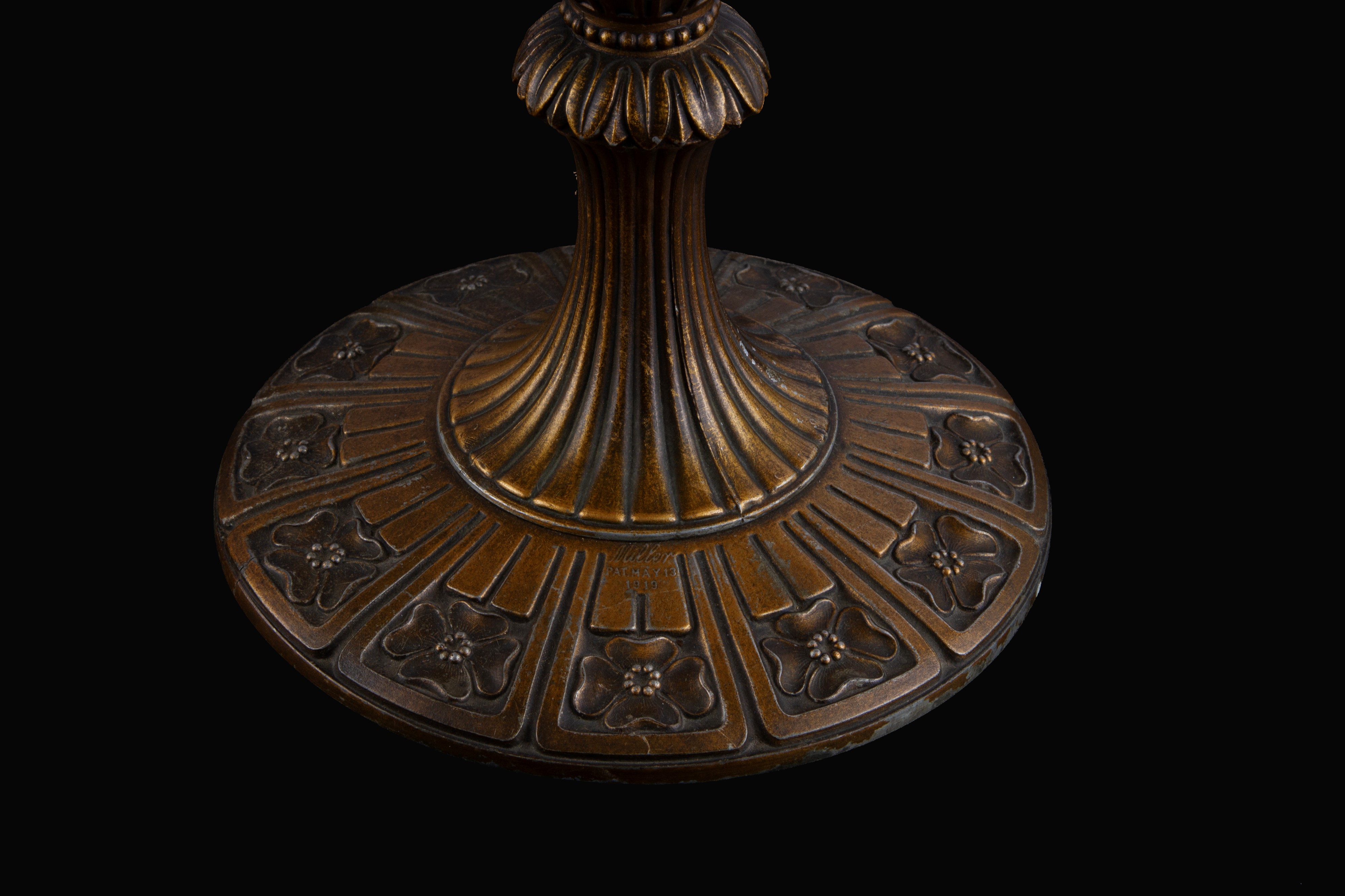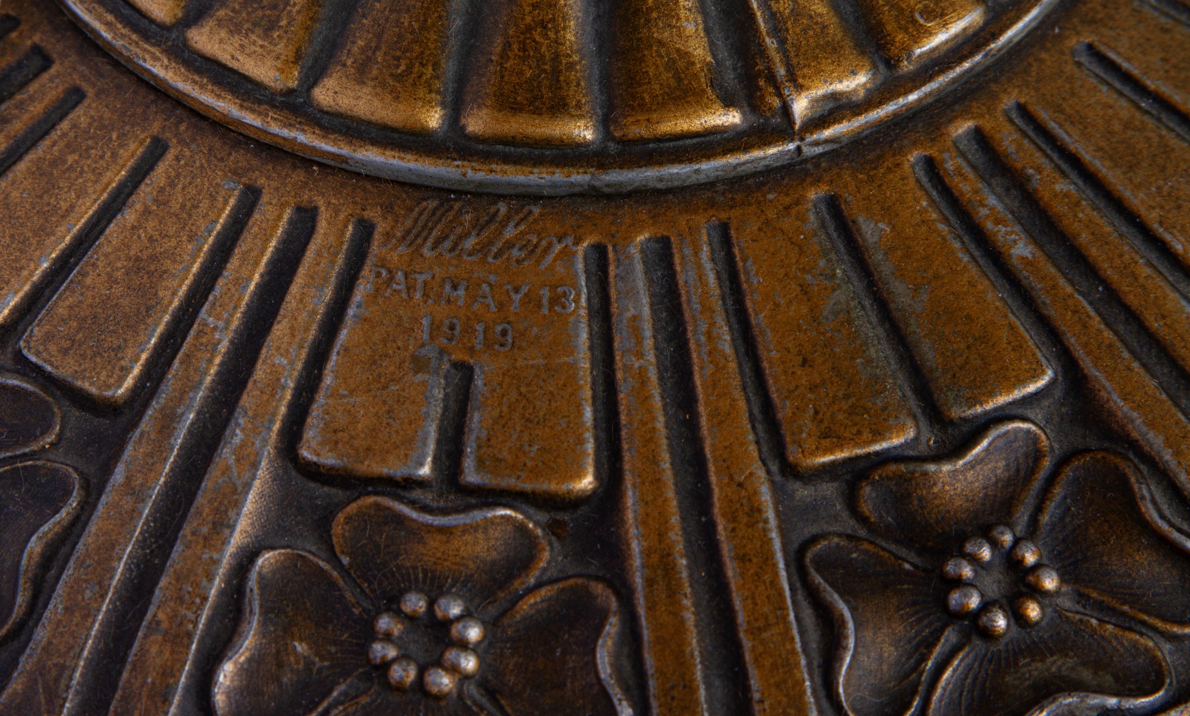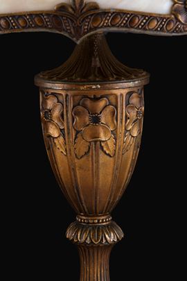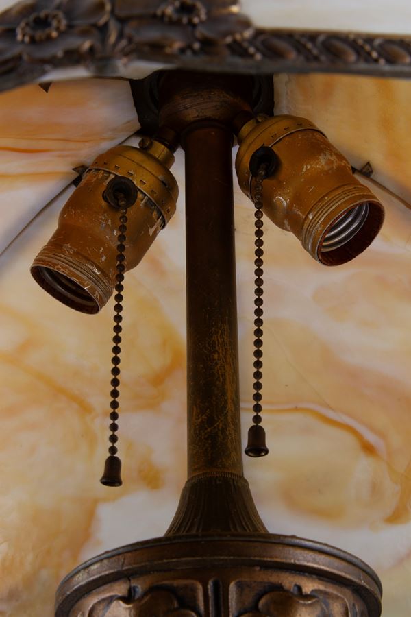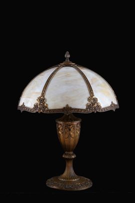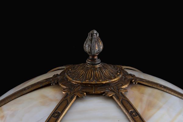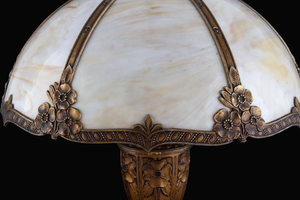 Lampada da tavolo in vetro calcedonio e metallo patinato e dipinto. Marcata MILLER sulla base.
