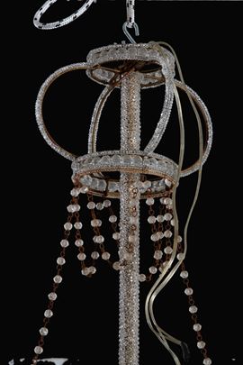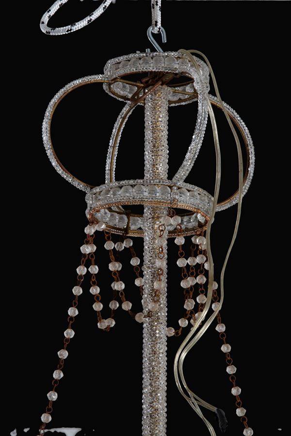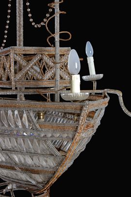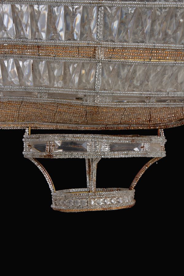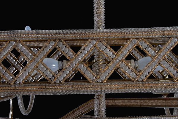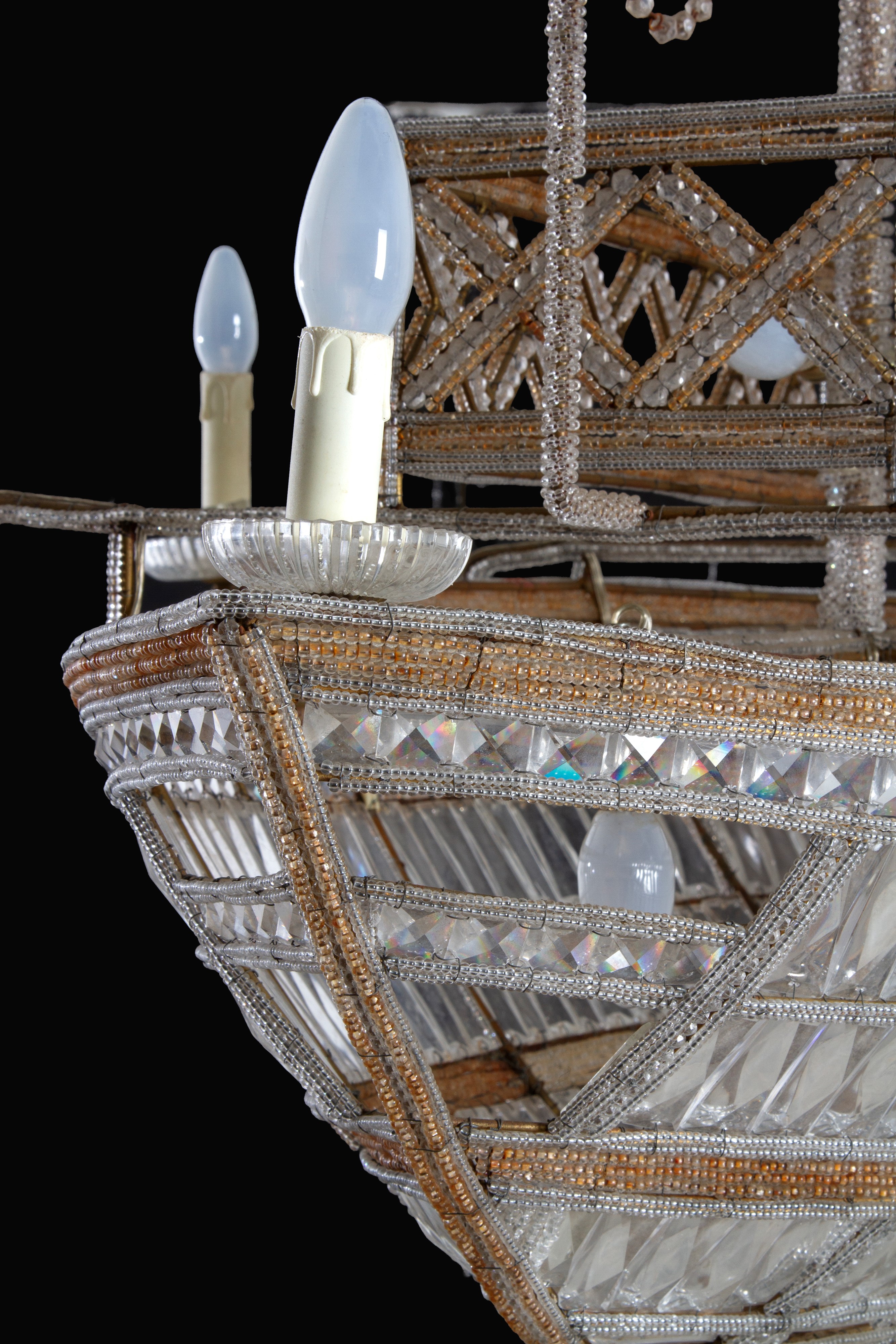 Lampadario dieci luci a forma di barca in ottone con perline e baguette in vetro di Murano. XX secolo. Segni di usura del tempo.
