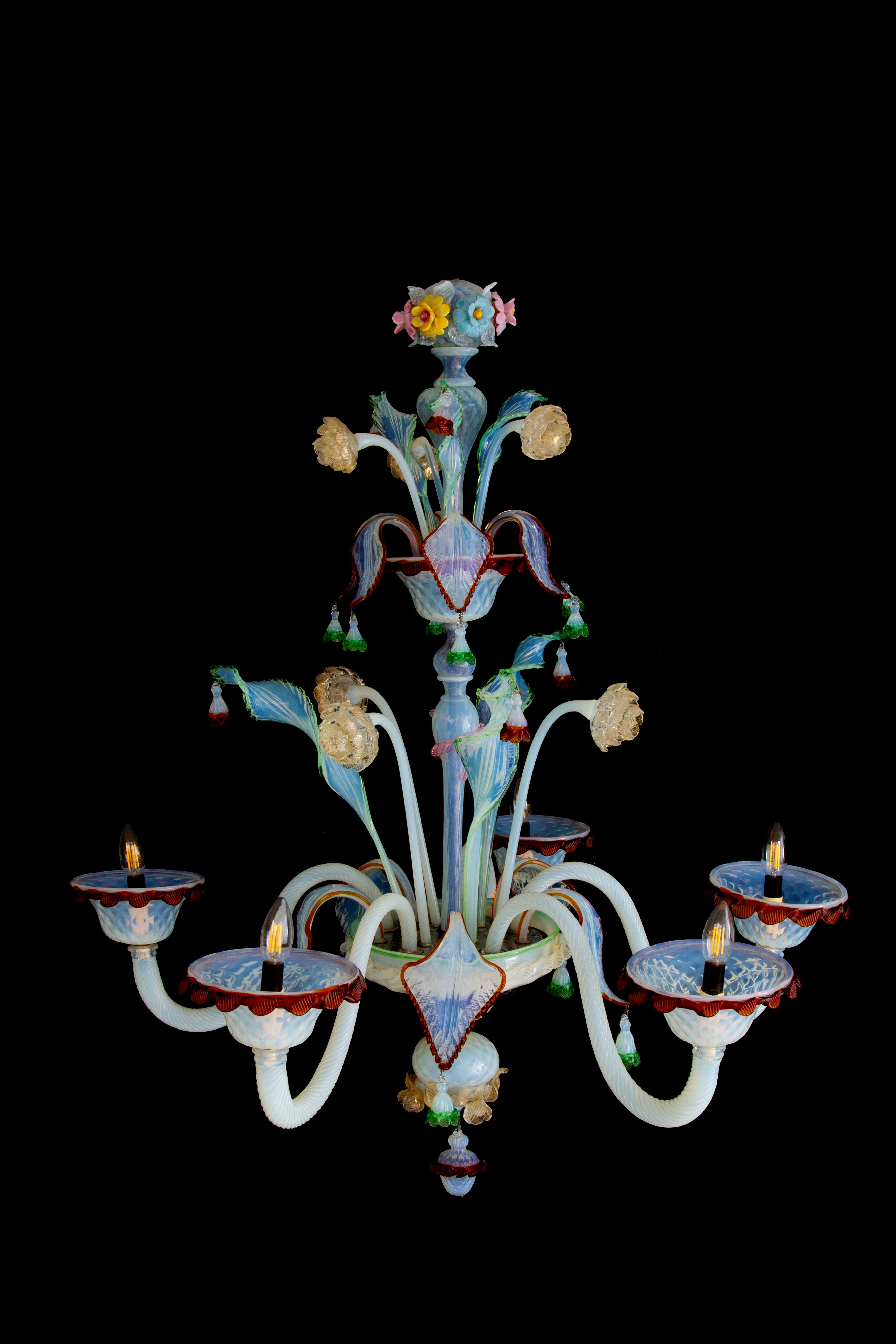 Lampadario cinque luci in vetro lattimo di Murano. Inizi XX secolo.