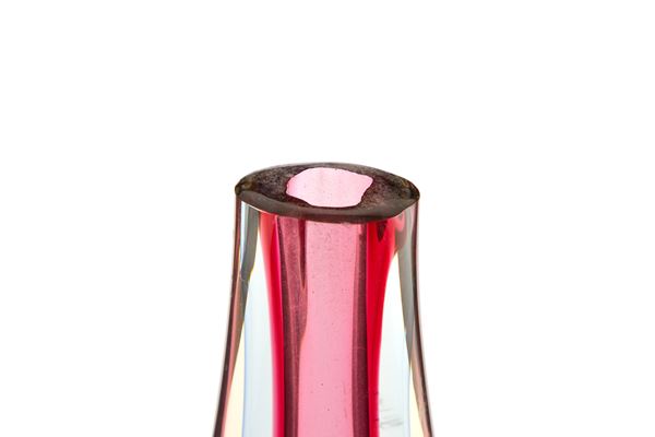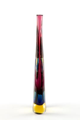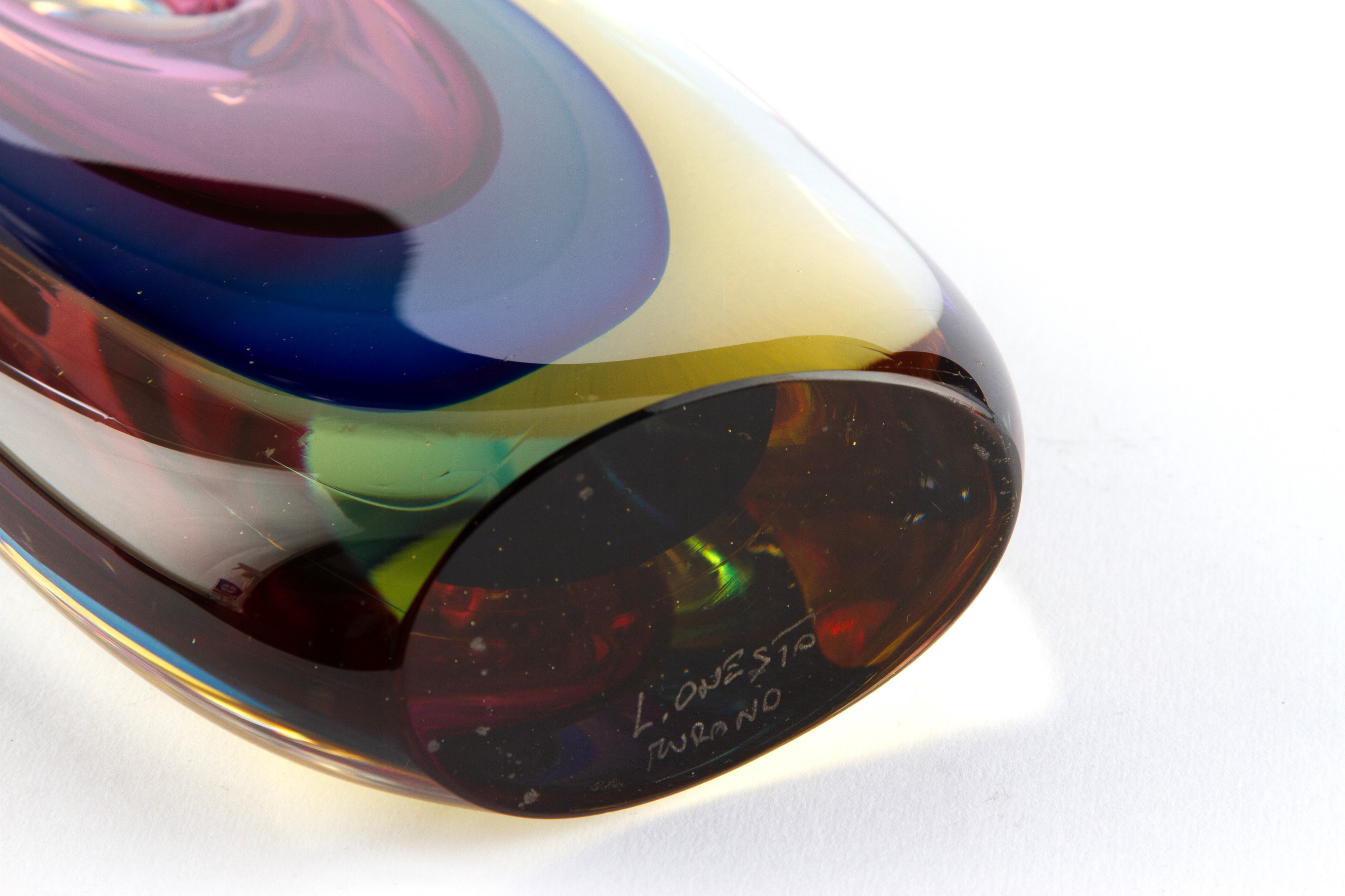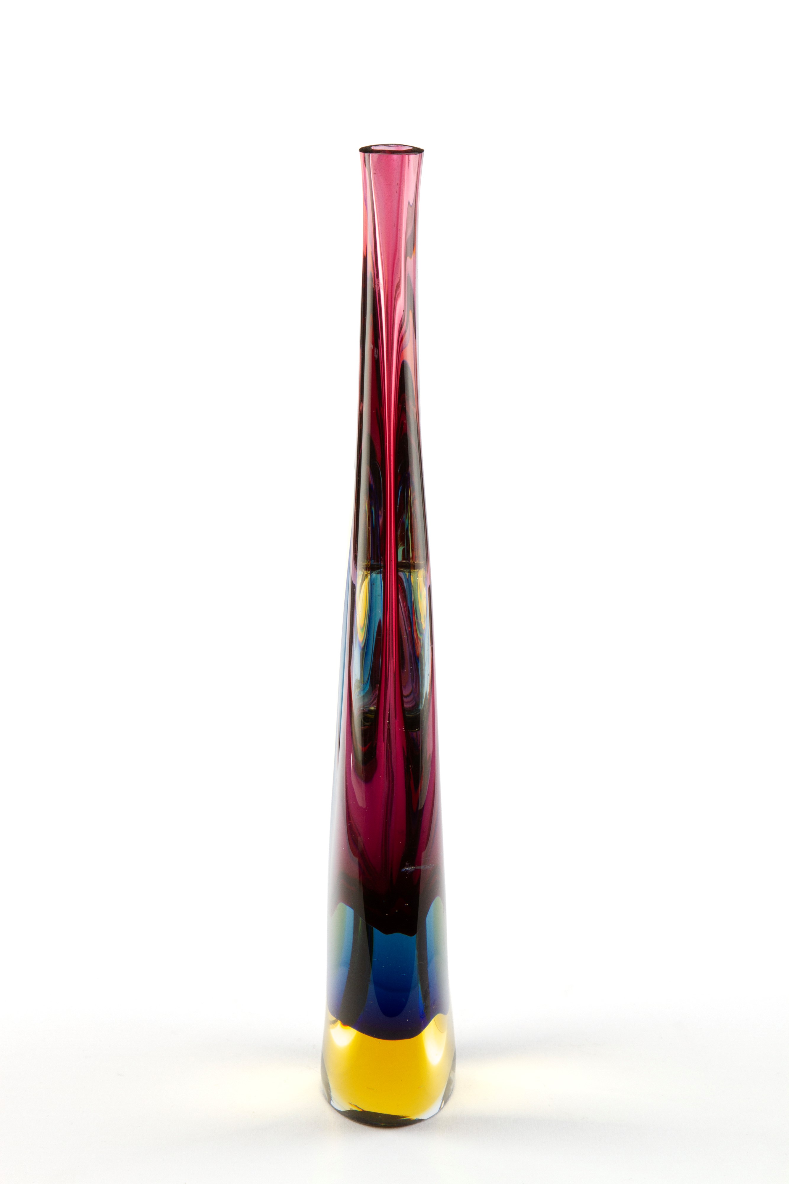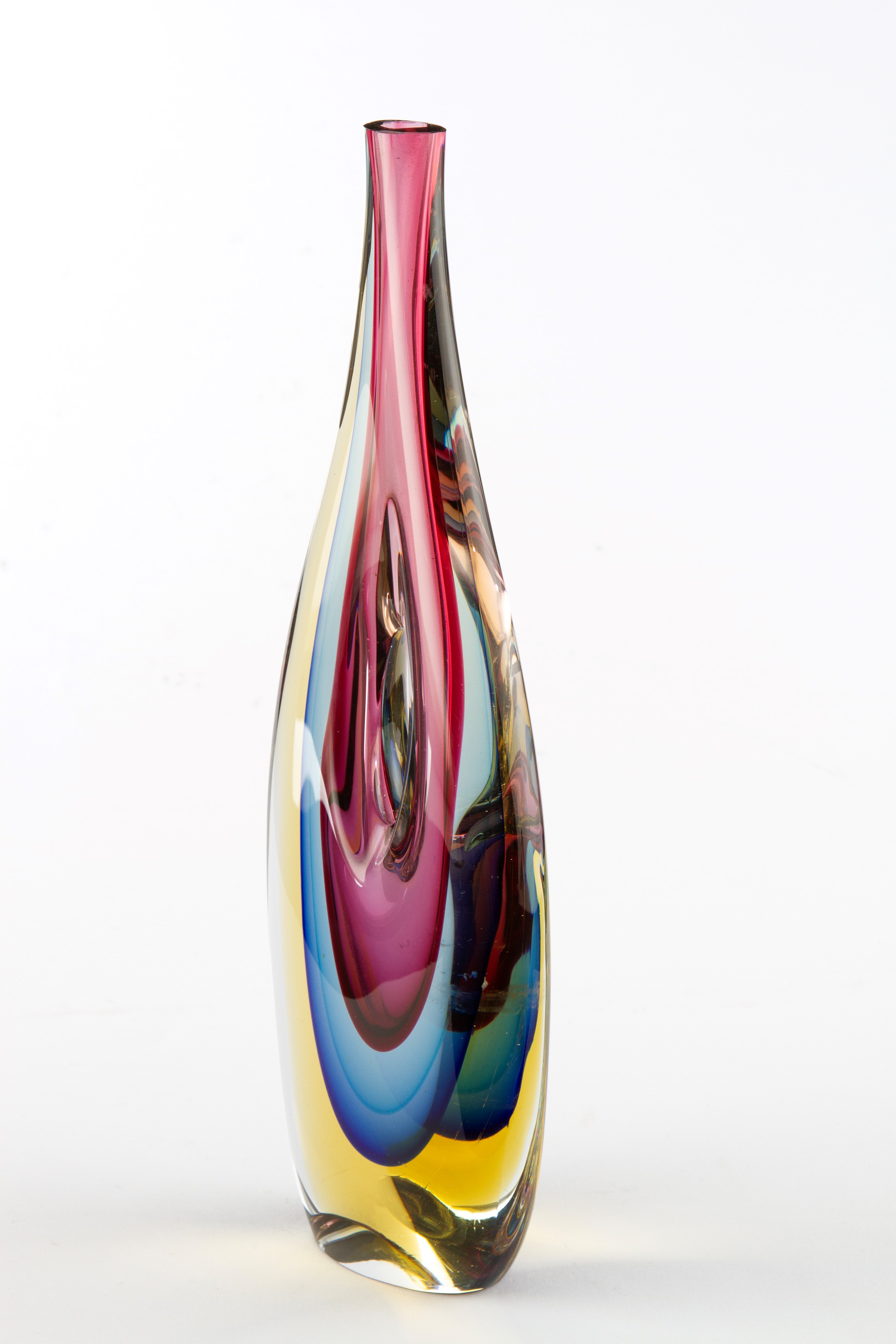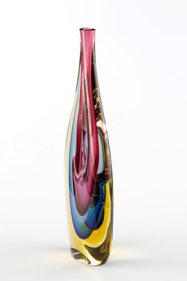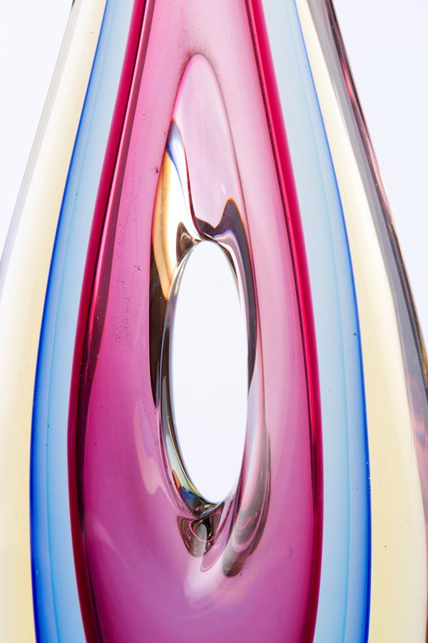 Vaso in vetro di Murano sommerso nei toni del giallo, blu e fucsia con foro al centro. Firmato sul fondo.