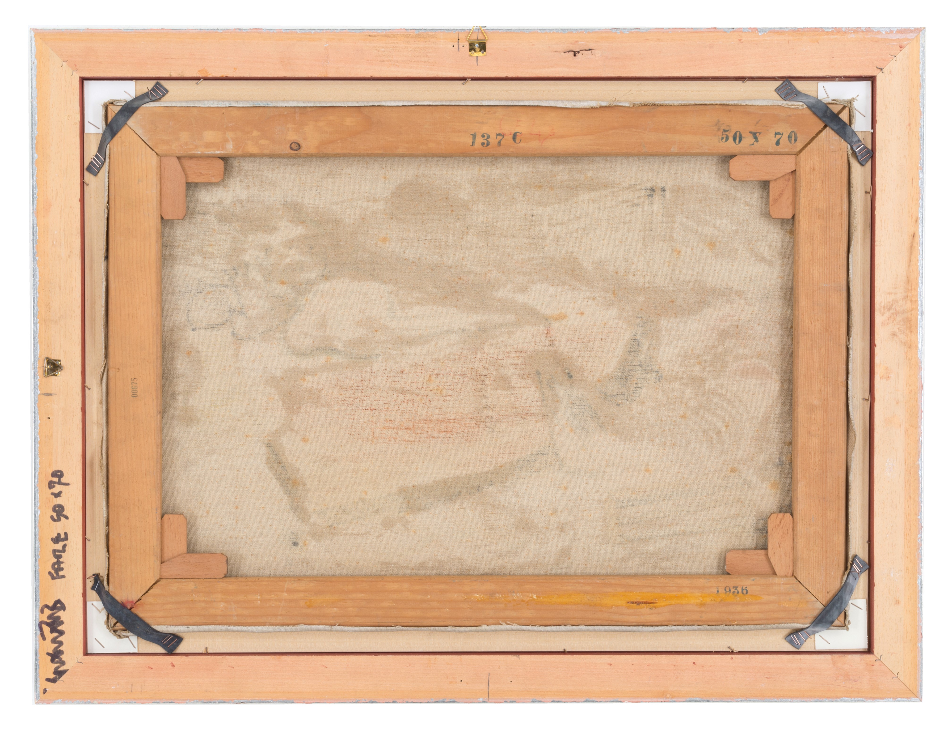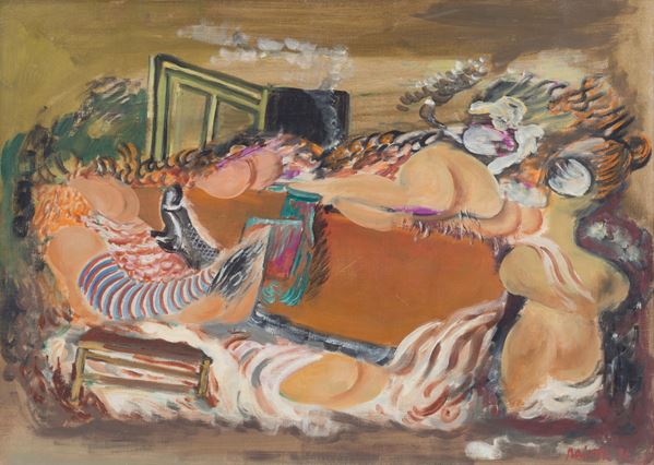 Dipinto olio su tela raffigurante "CORPI E STIVALETTI". Firmato e datato '36 in basso a destra. Timbro 00675 sul retro. In cornice. Numero di archiviazione 2675. Pubblicato nel catalogo generale ragionato dei dipinti di Guido Pajetta; a cura di Enrico Crispolti. Vol. I, p. 162.