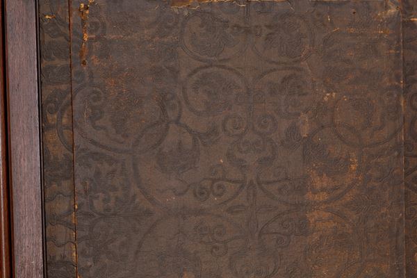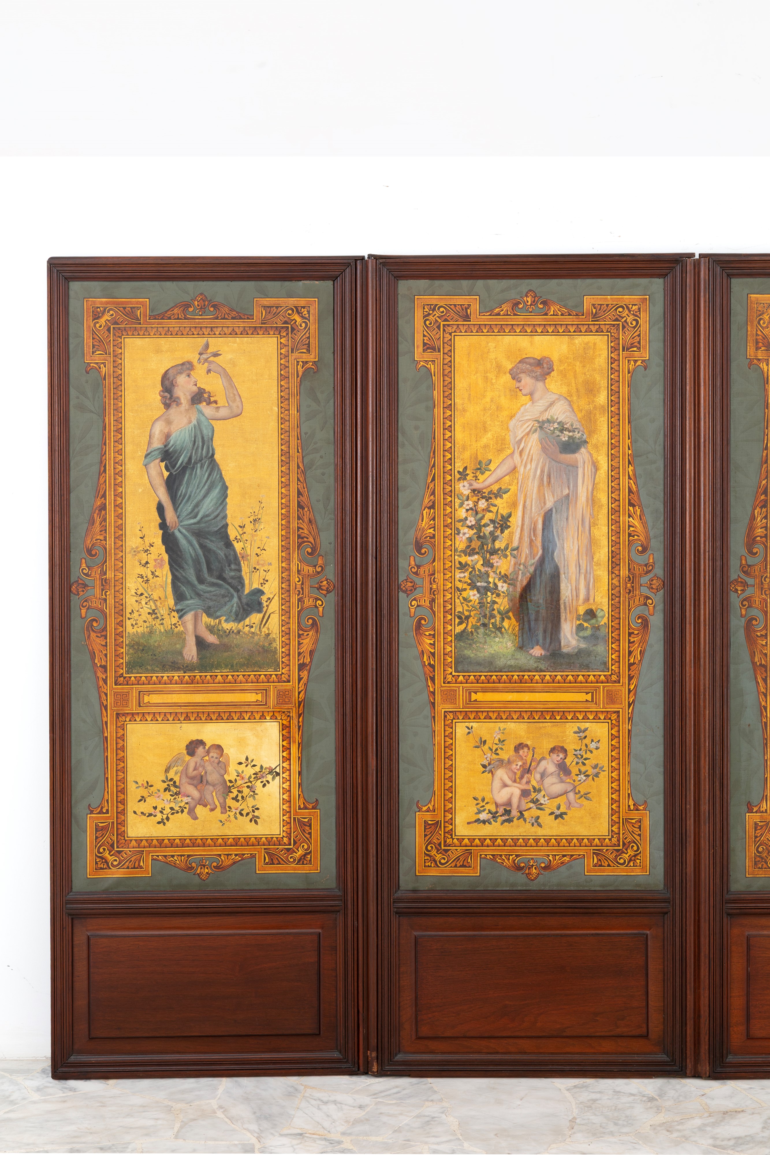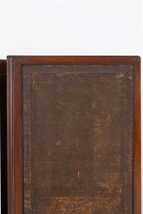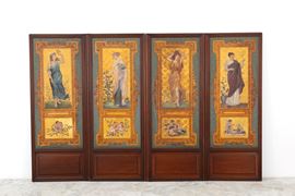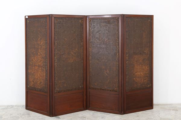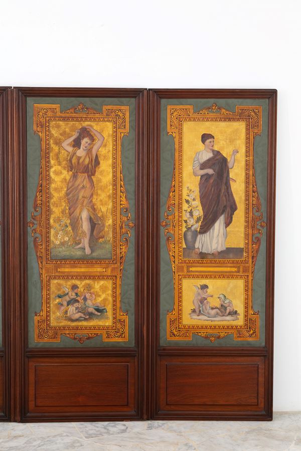 Paravento a quattro ante in legno dipinto con figure femminili e putti entro riserve. Retro rivestito in cuoio impresso. Periodo Liberty. Difetti, rotture sul retro e segni di usura del tempo.