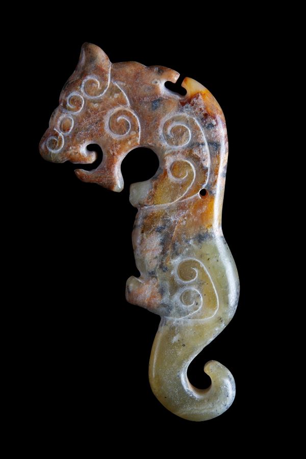 Pendente in giada traforata e incisa a forma di drago. Cina.