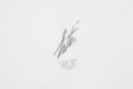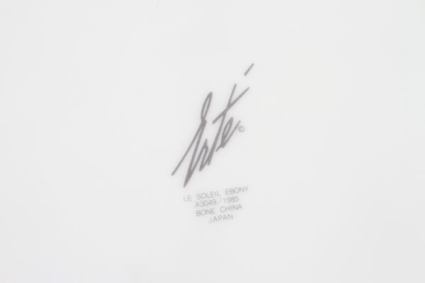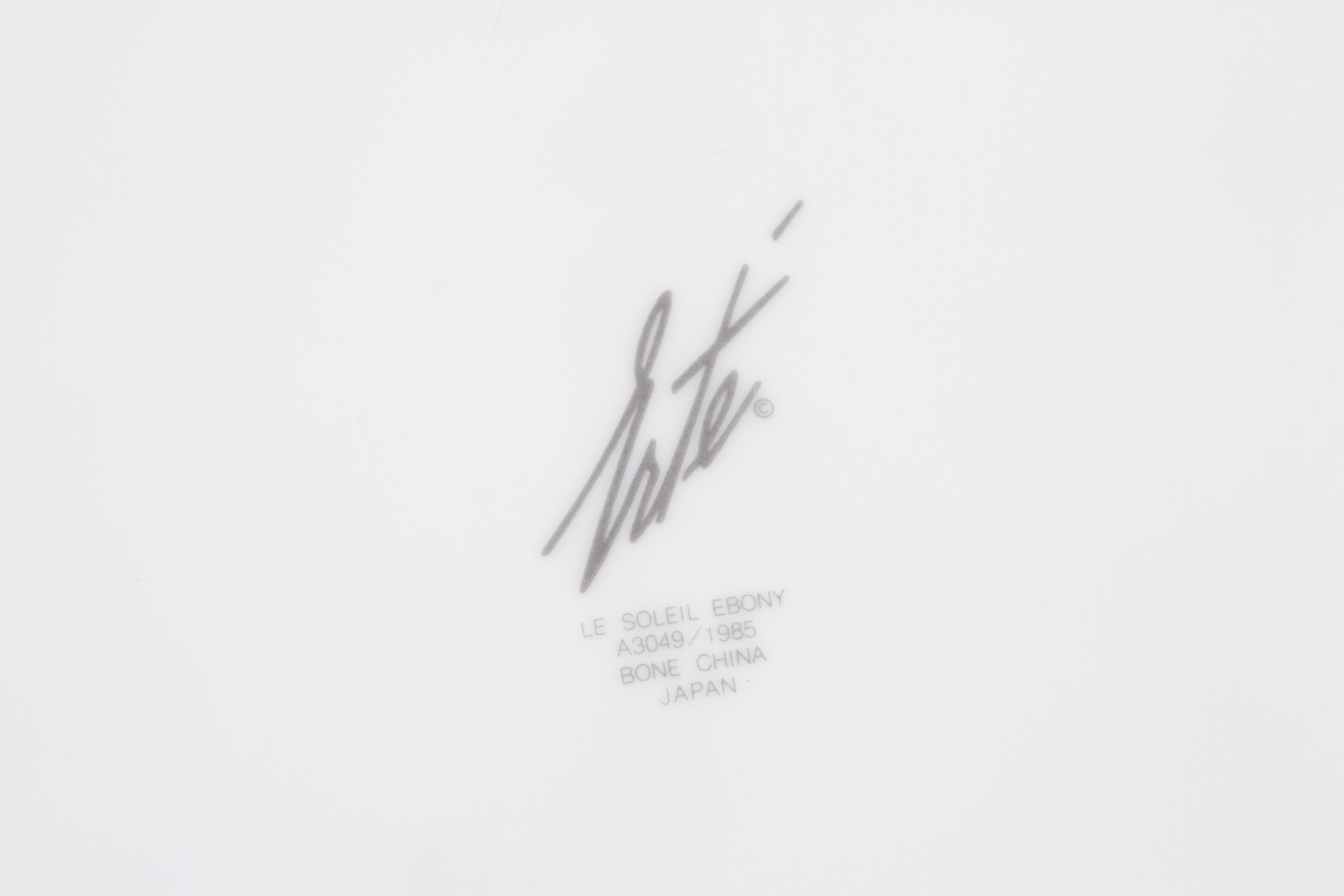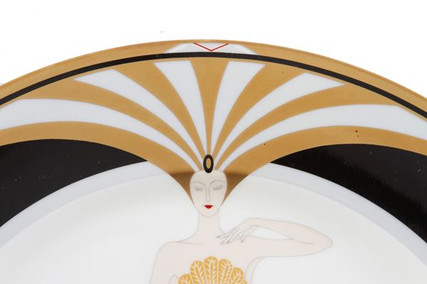 Piatto in porcellana Bone China intitolato "LE SOLEIL EBONY". Manifattura ERTE'. 1985. Marcato e firmato sul retro.