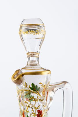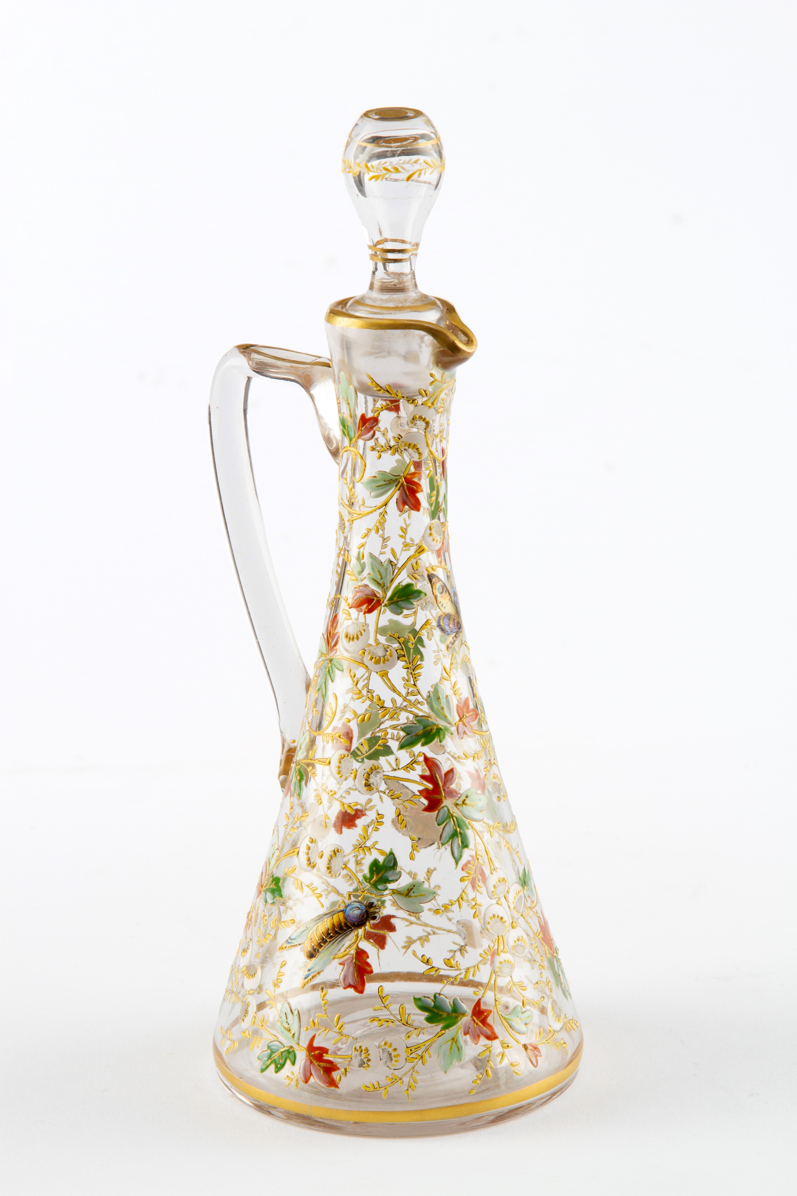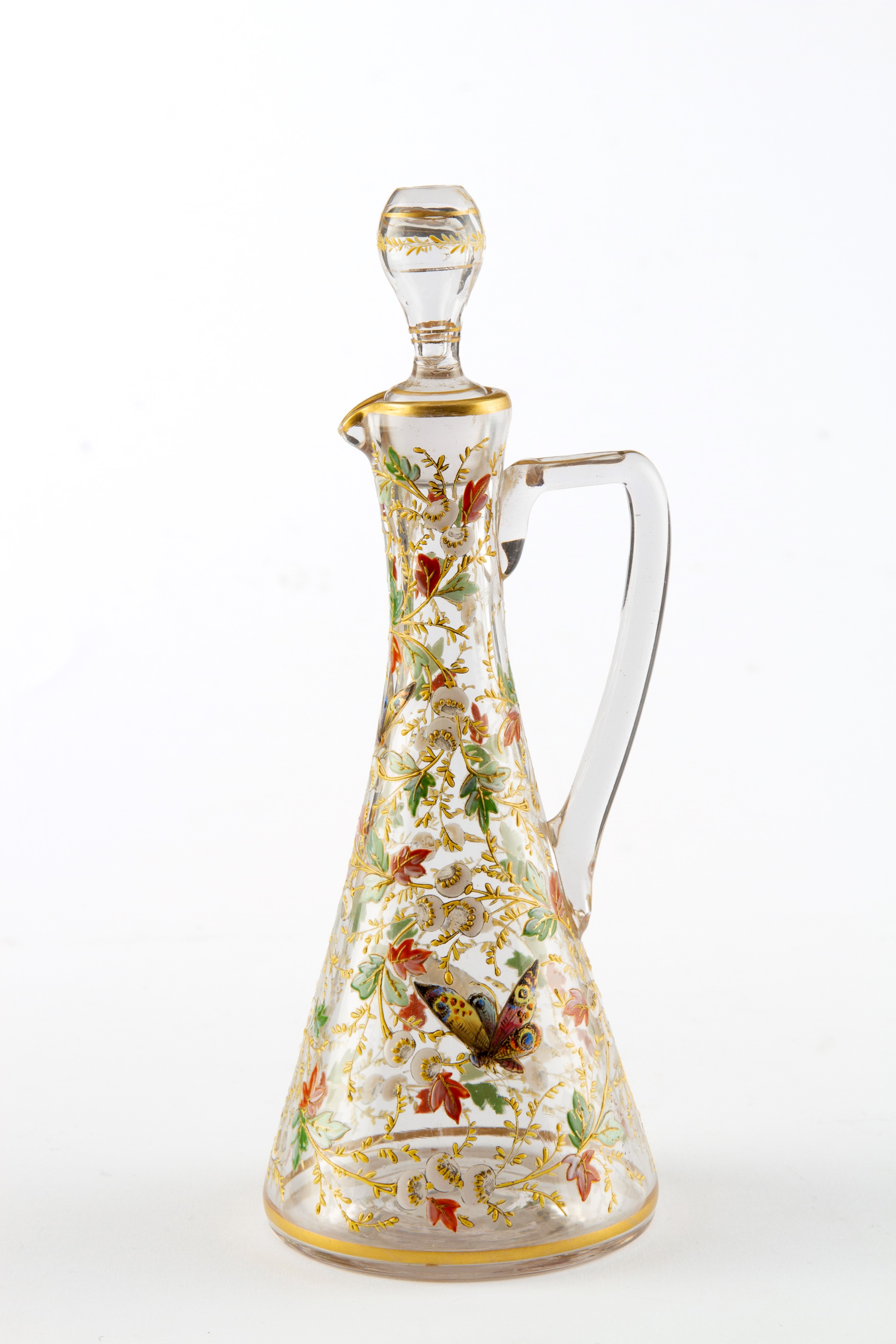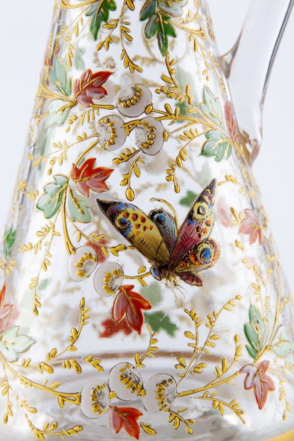 Piccola brocca in vetro con decoro floreale e farfalle. Francia. XIX secolo.