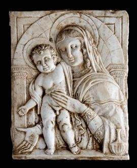 Placca in marmo raffigurante "MADONNA CON BAMBINO". XX secolo. Lievi difetti.