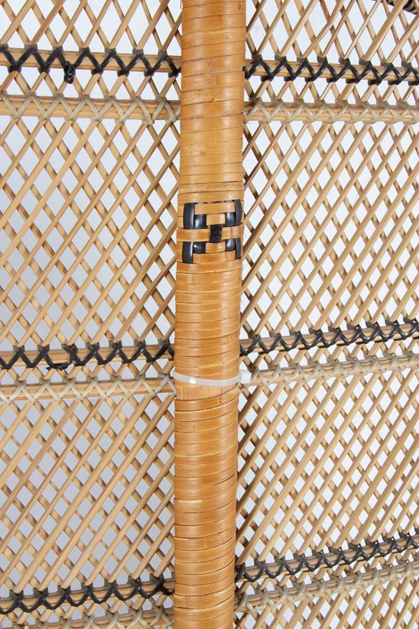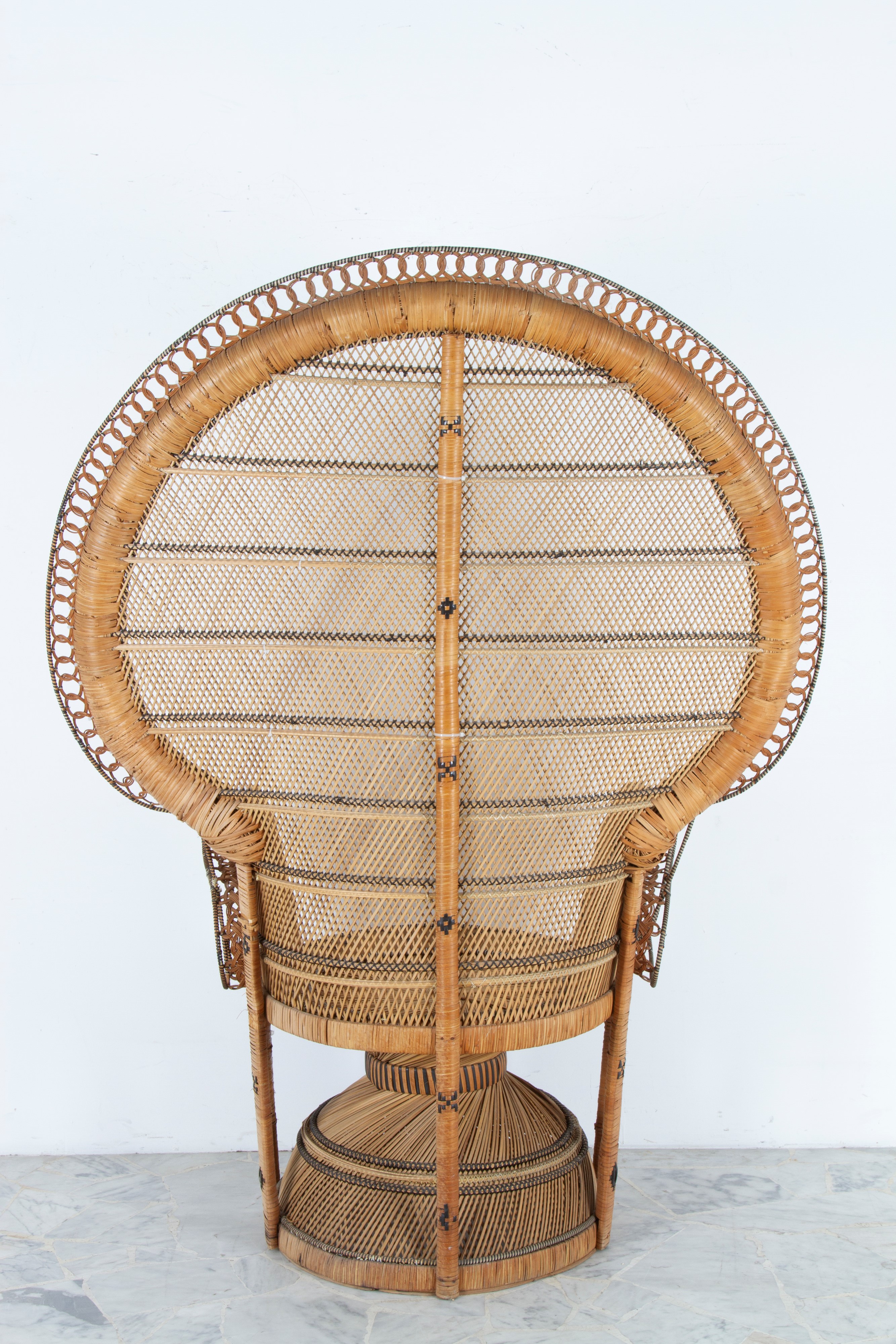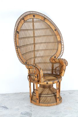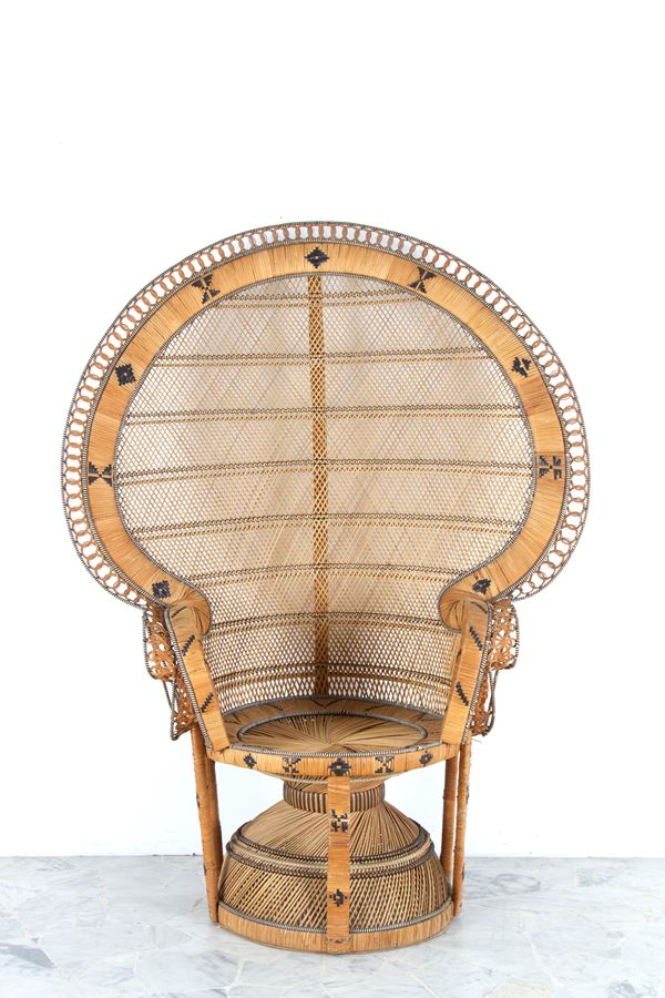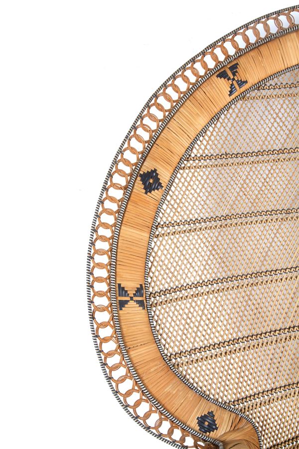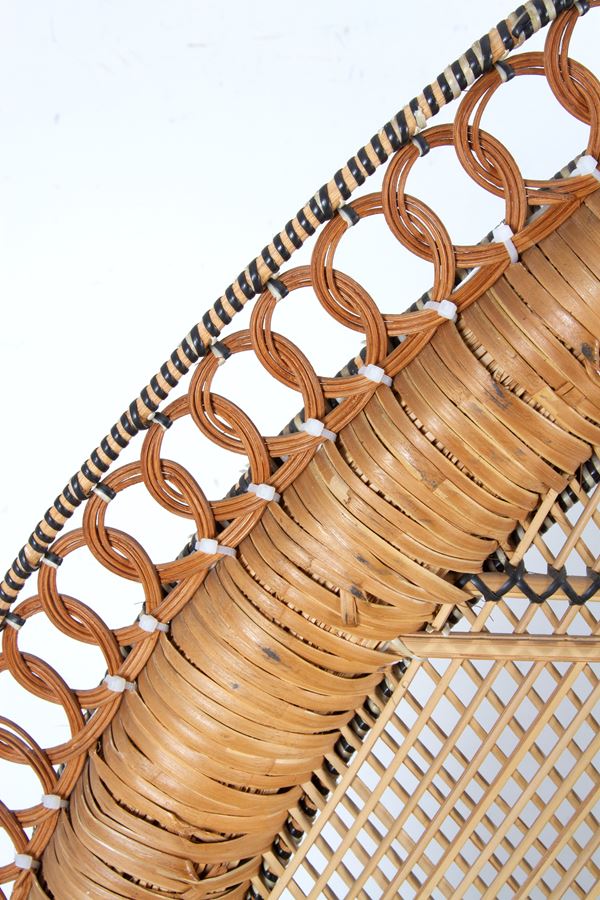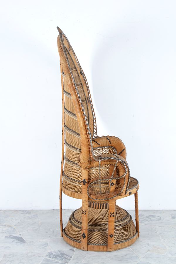 Poltrona stile Emmanuelle Pavone in vimini e rattan. Anni '70. Lievi difetti e segni di usura del tempo
