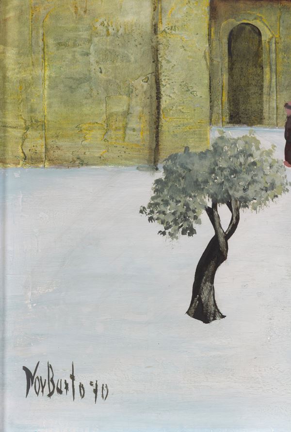 Dipinto tempera su tavoletta raffigurante "PAESAGGIO INNEVATO CON FRATI". Firmato e datato '70 in basso a sinistra.