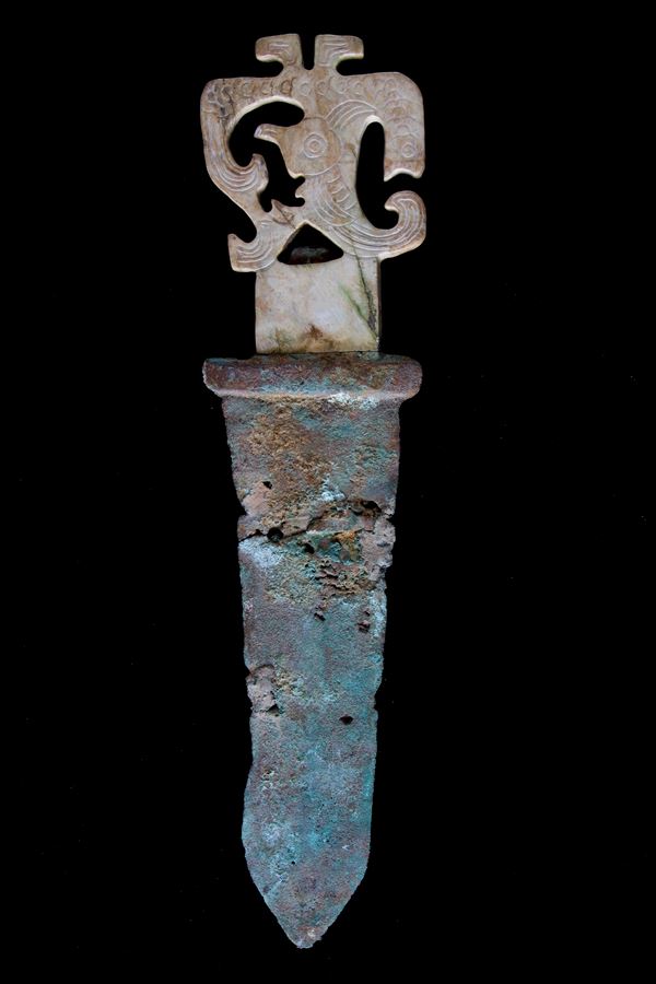 Pugnale con impugnatura in giada traforata e intagliata e lama metallica. Cina.