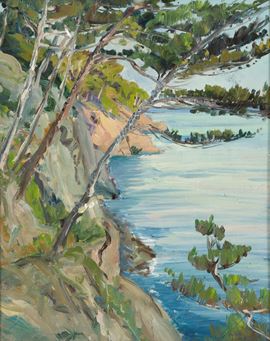 Dipinto olio su tavoletta raffigurante "PAESAGGIO COSTIERO". In cornice.