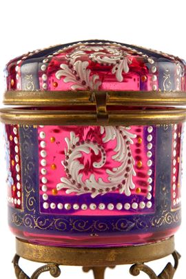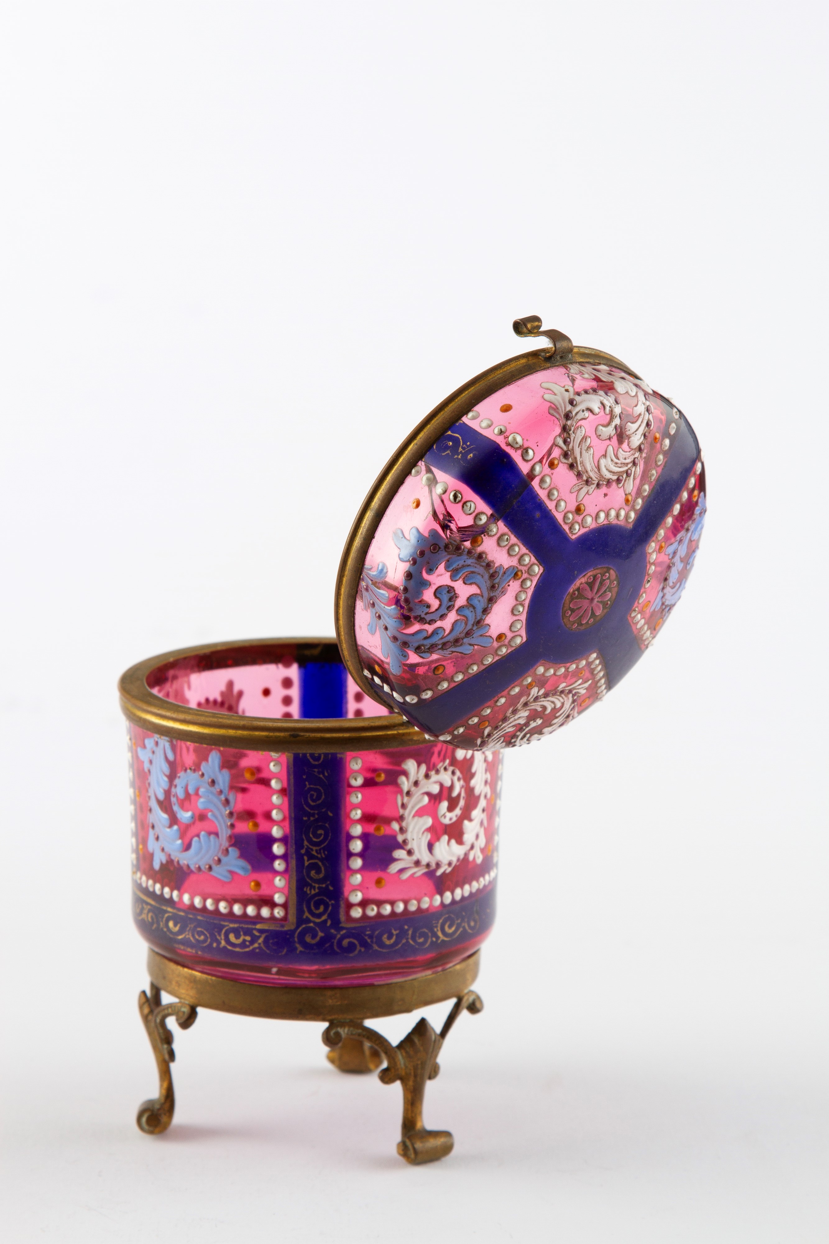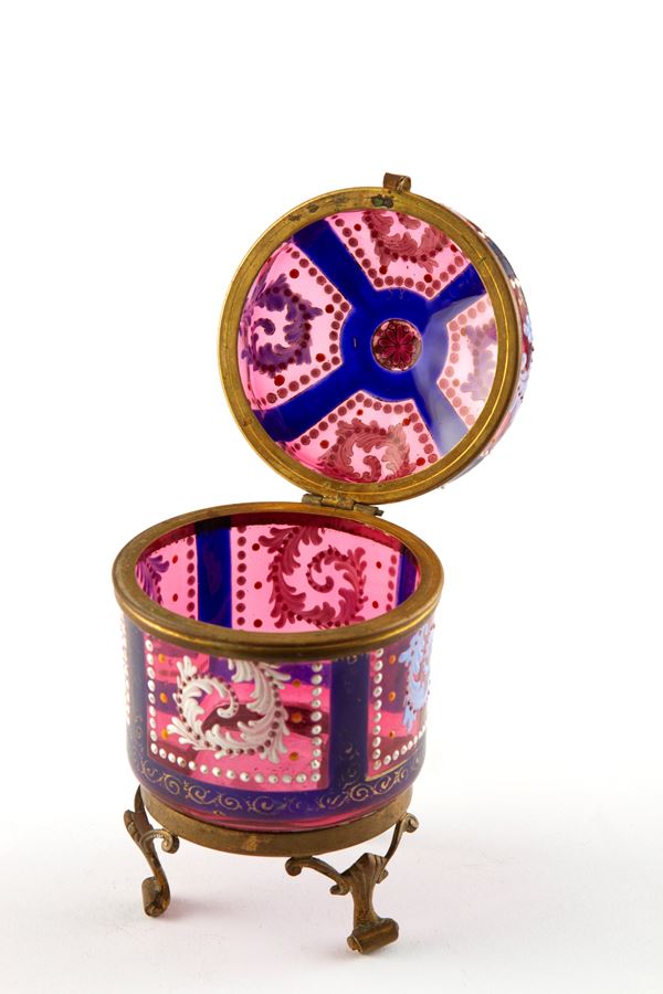 Scatola in vetro rosa con decori a smalto e base in finiture in bronzo. XX secolo.