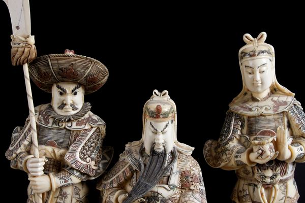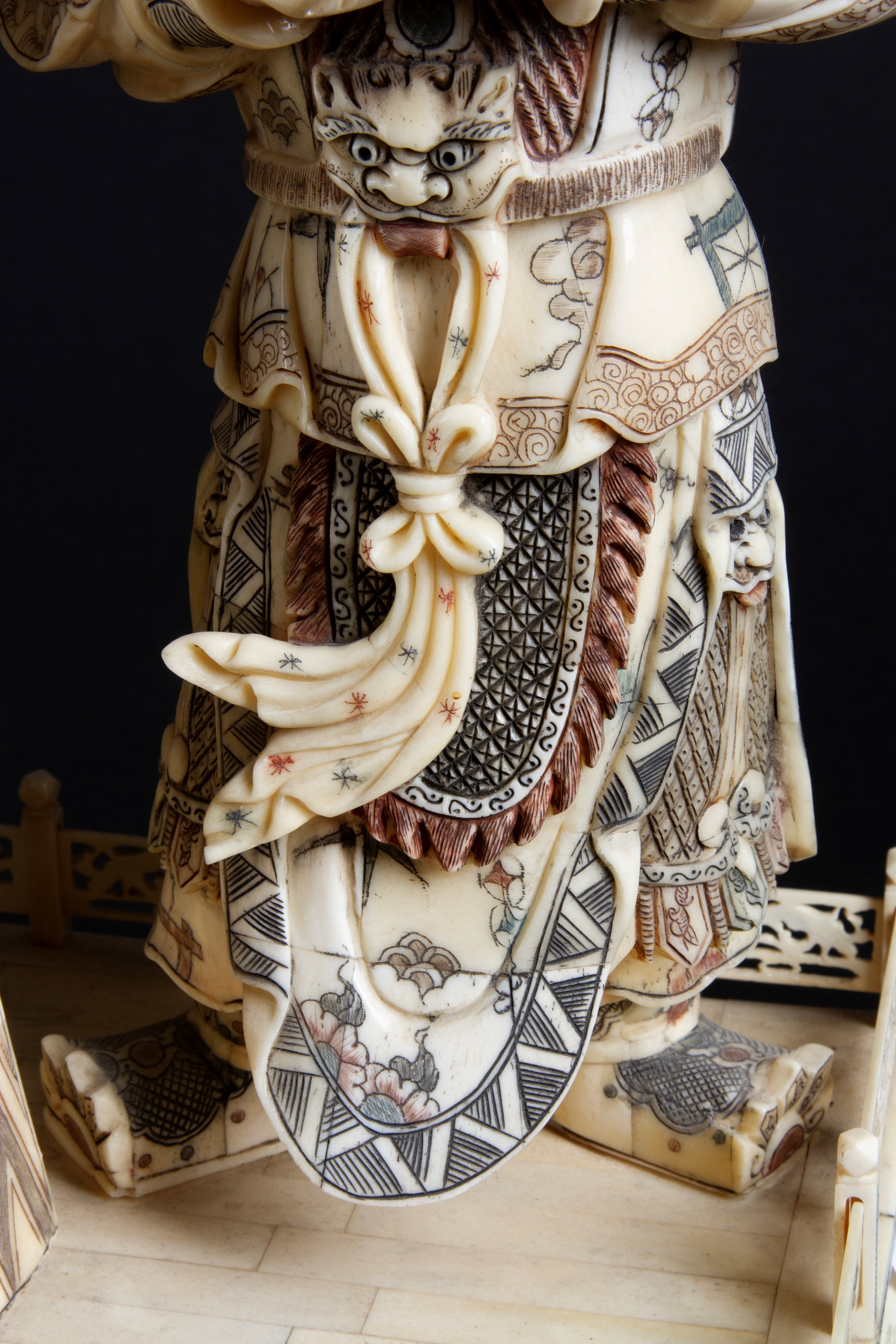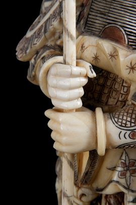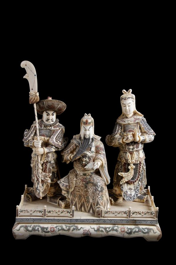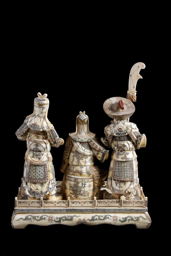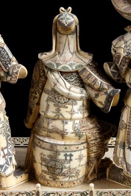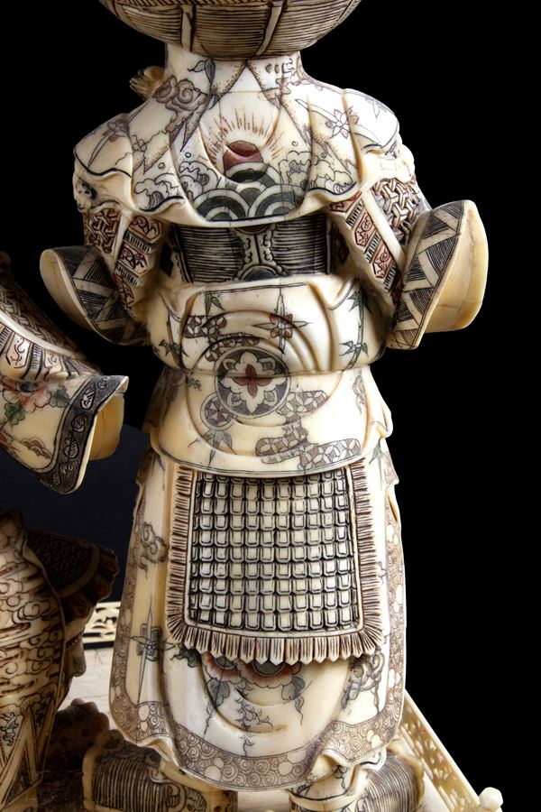 Scultura in osso intagliato e dipinto raffigurante "SCENA DI CORTE". Fine XIX secolo.
