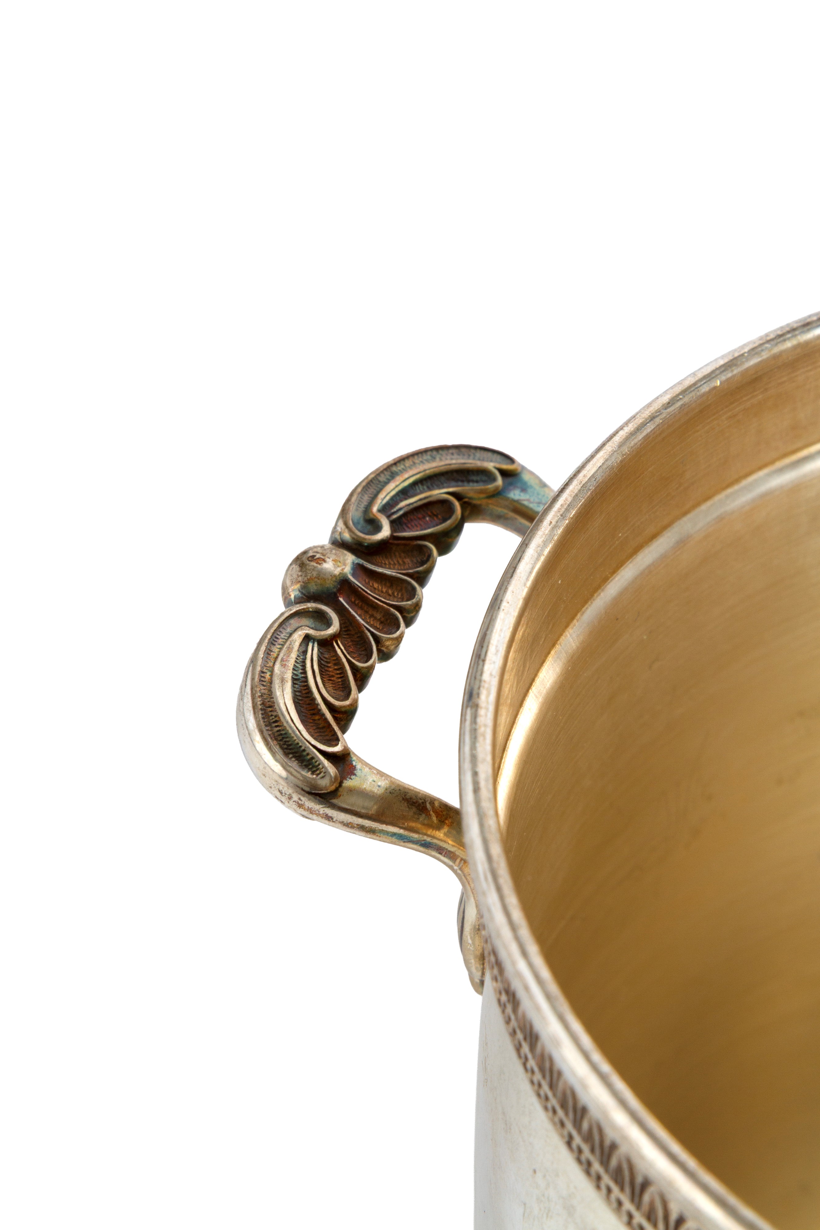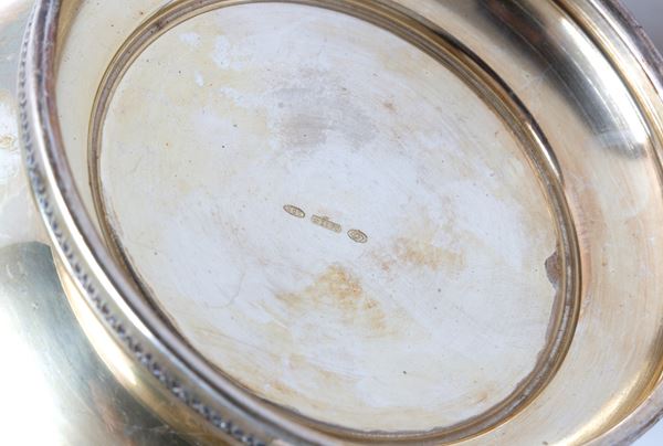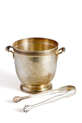Secchiello portaghiaccio in argento 800 con pinza, gr. 450 ca. complessivi. Punzoni sul fondo. XX secolo.