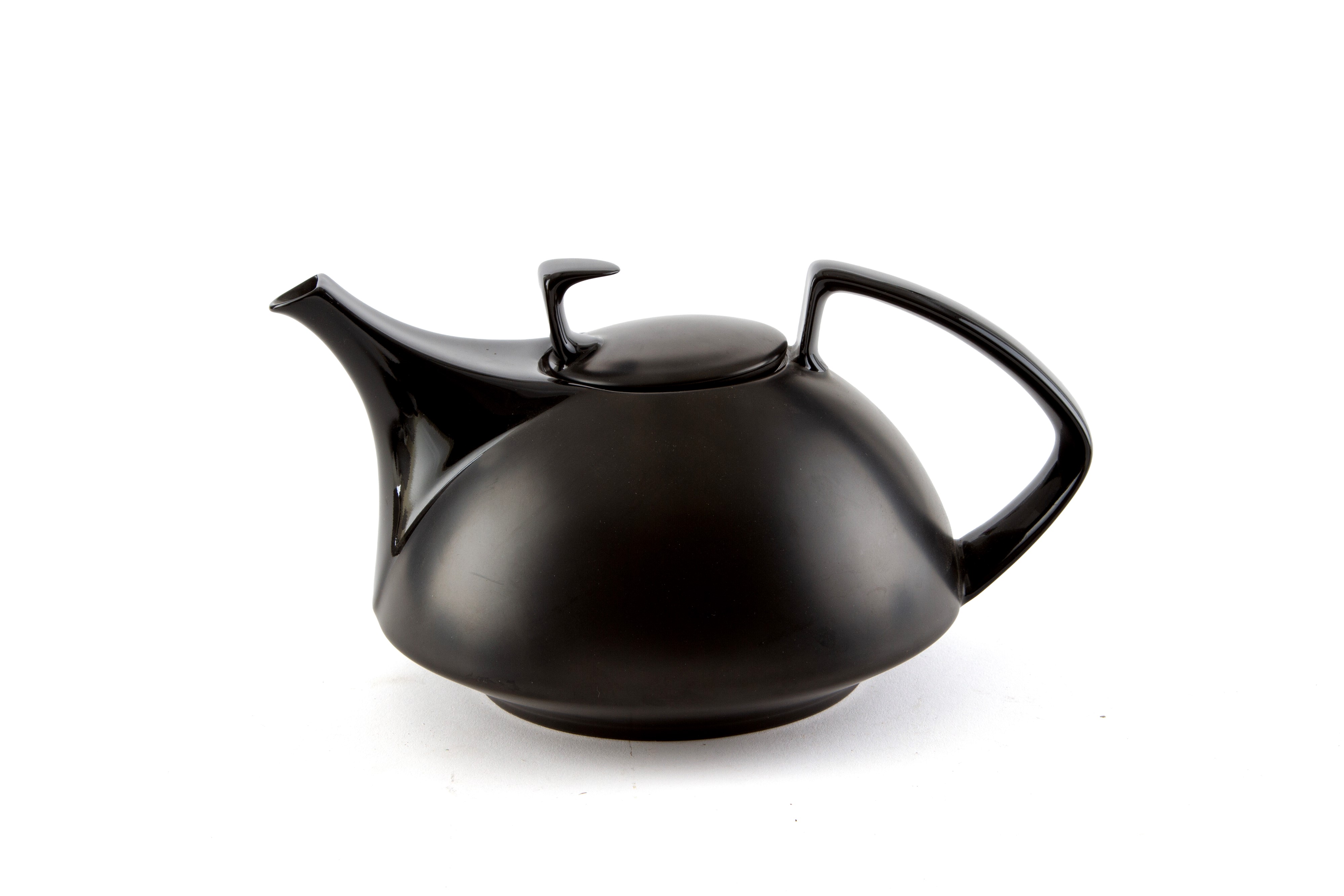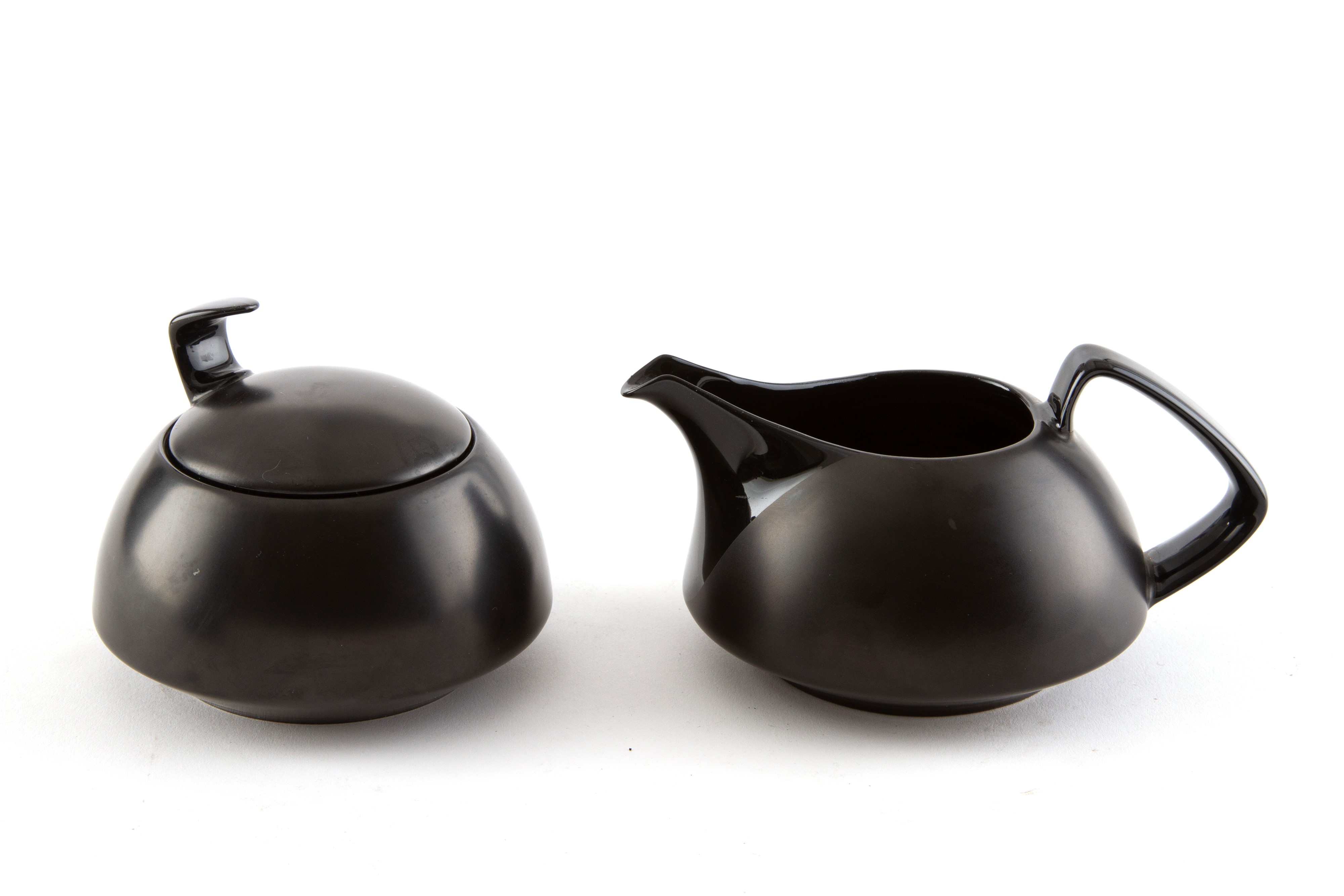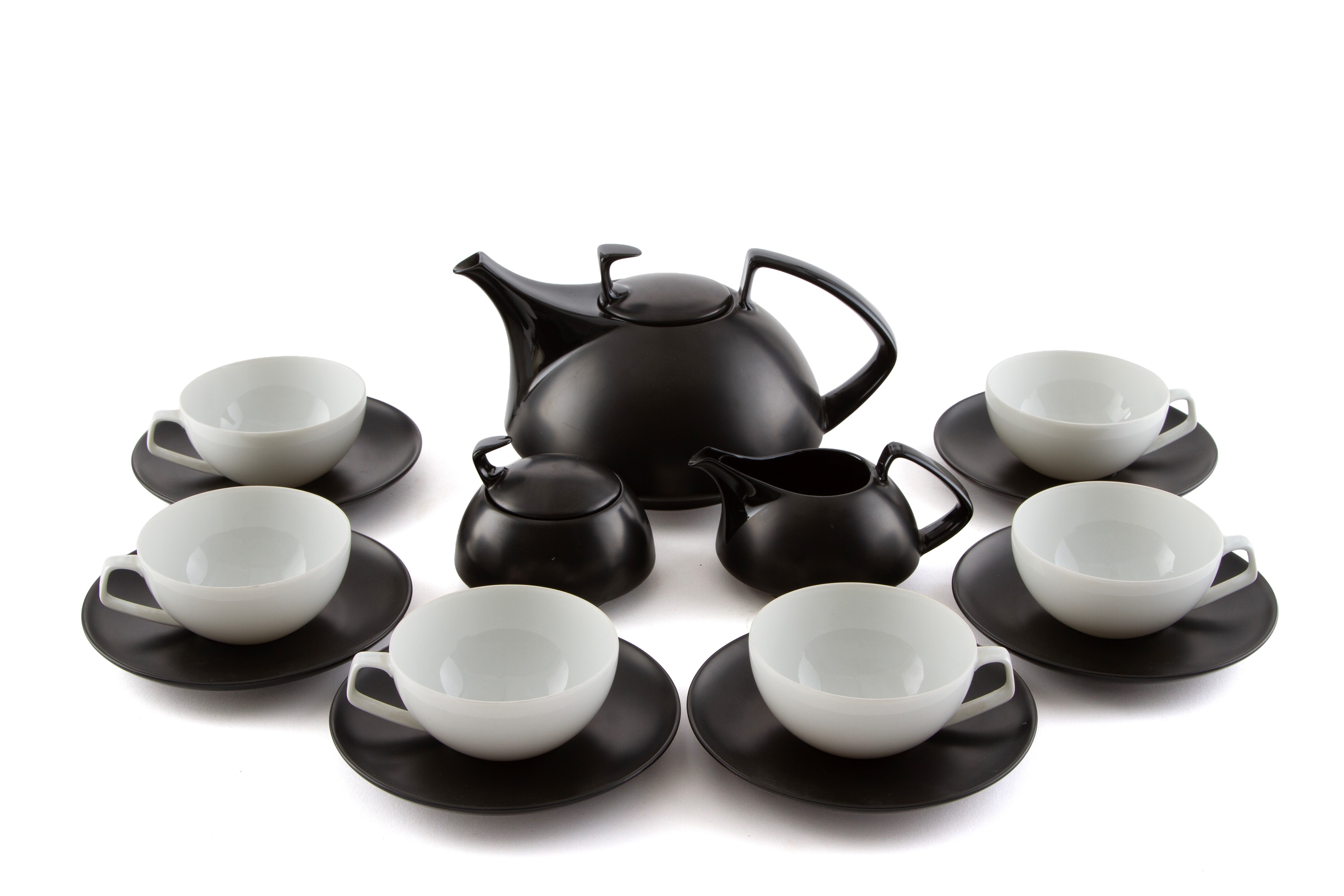 Servizio da tè da sei in porcellana bianca e nera composto da teiera, zuccheriera, lattiera e sei tazze con piattino. Manifattura ROSENTHAL TAC. Marcato sul fondo.