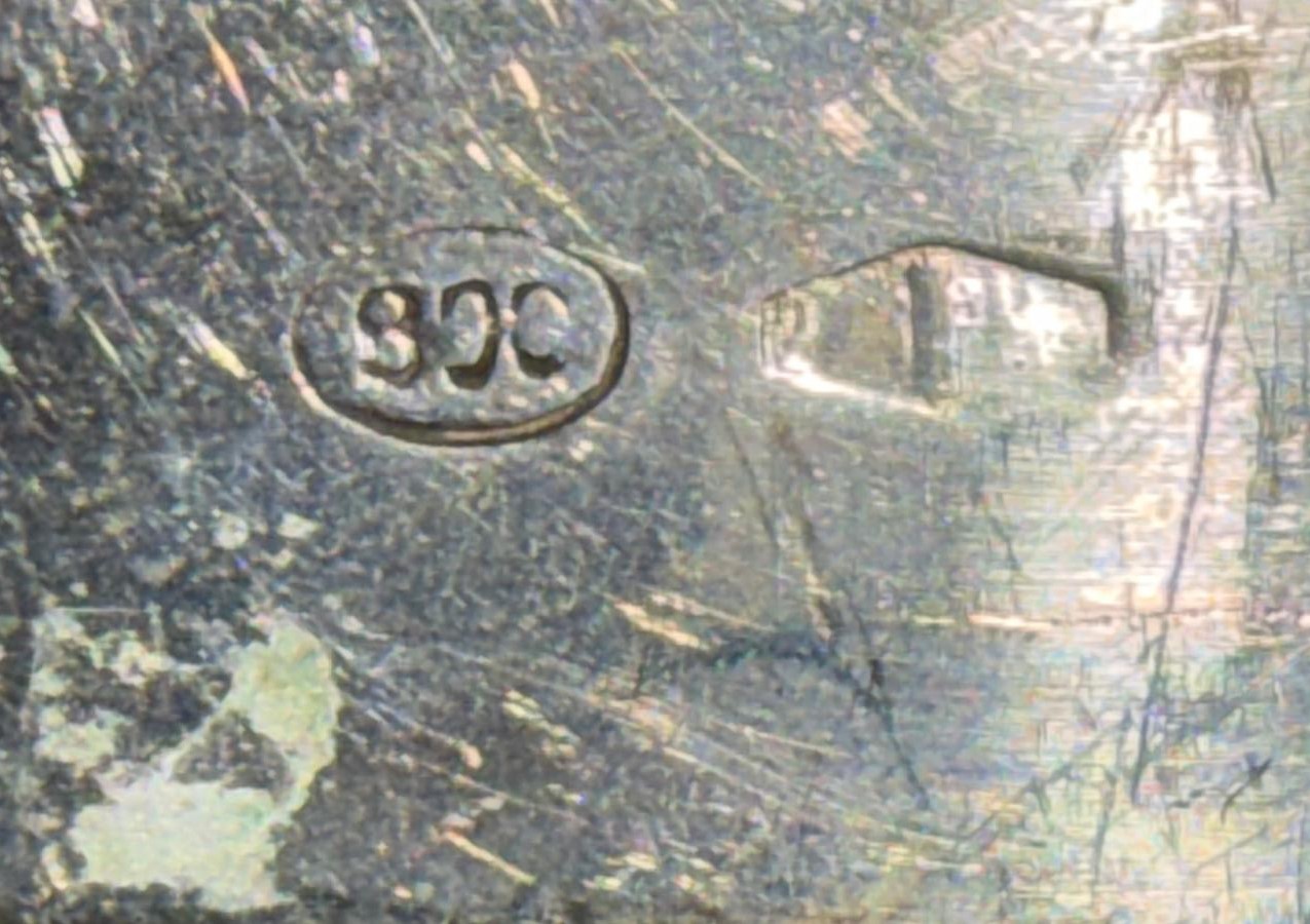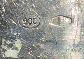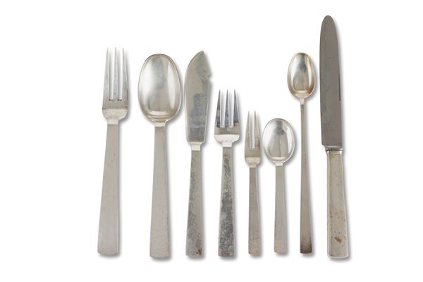 Servizio di posate in argento 800, composto da dodici forchette, dodici coltelli, dodici coltelli da pesce, dodici forchette da dolce, dodici cucchiai, undici cucchiaini, dieci cucchiai da gelato, sei forchettine per salumi, gr. 4.700 ca. complessivi (considerando un terzo del peso dei coltelli). Argentiere CAPUTO. XX secolo.