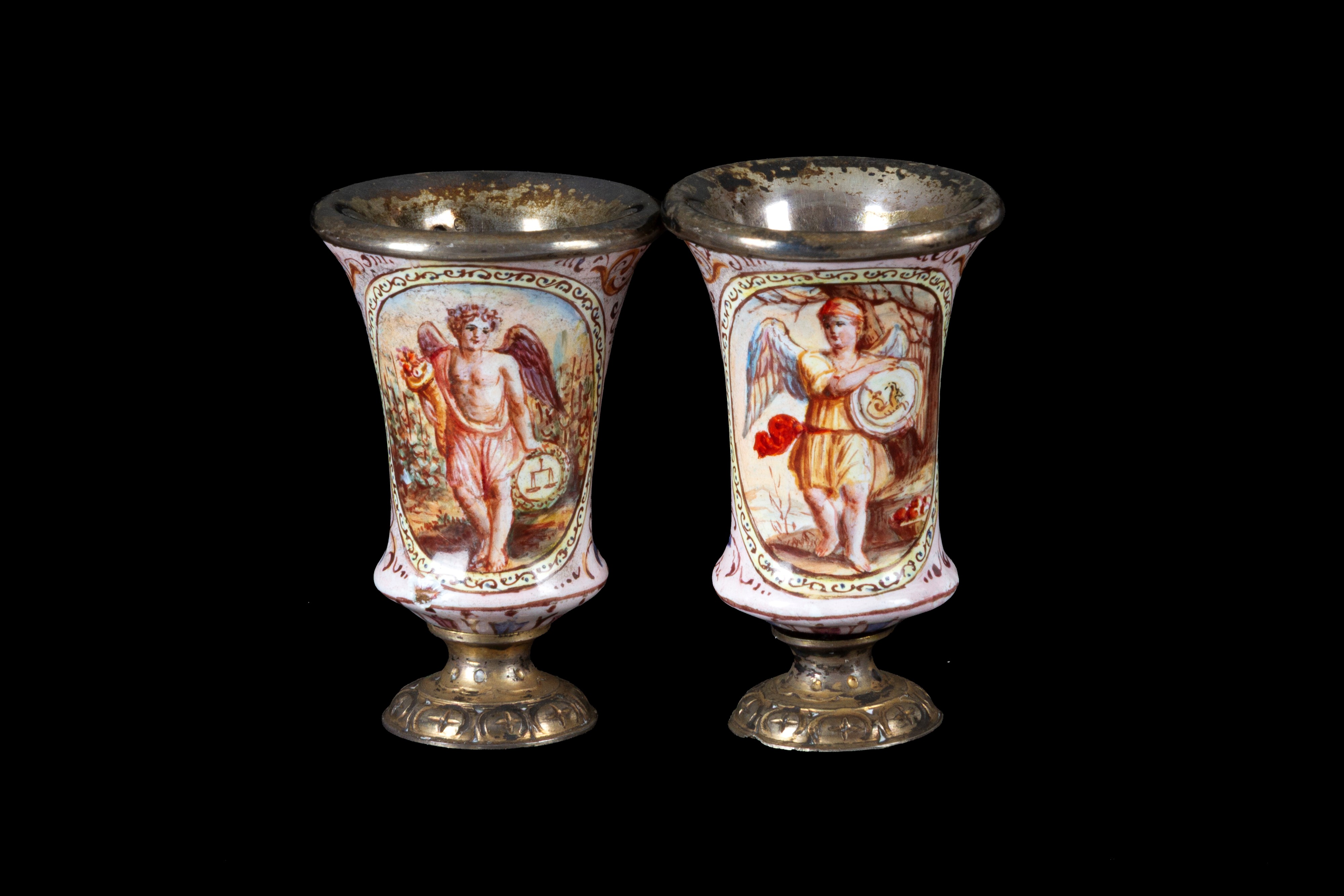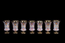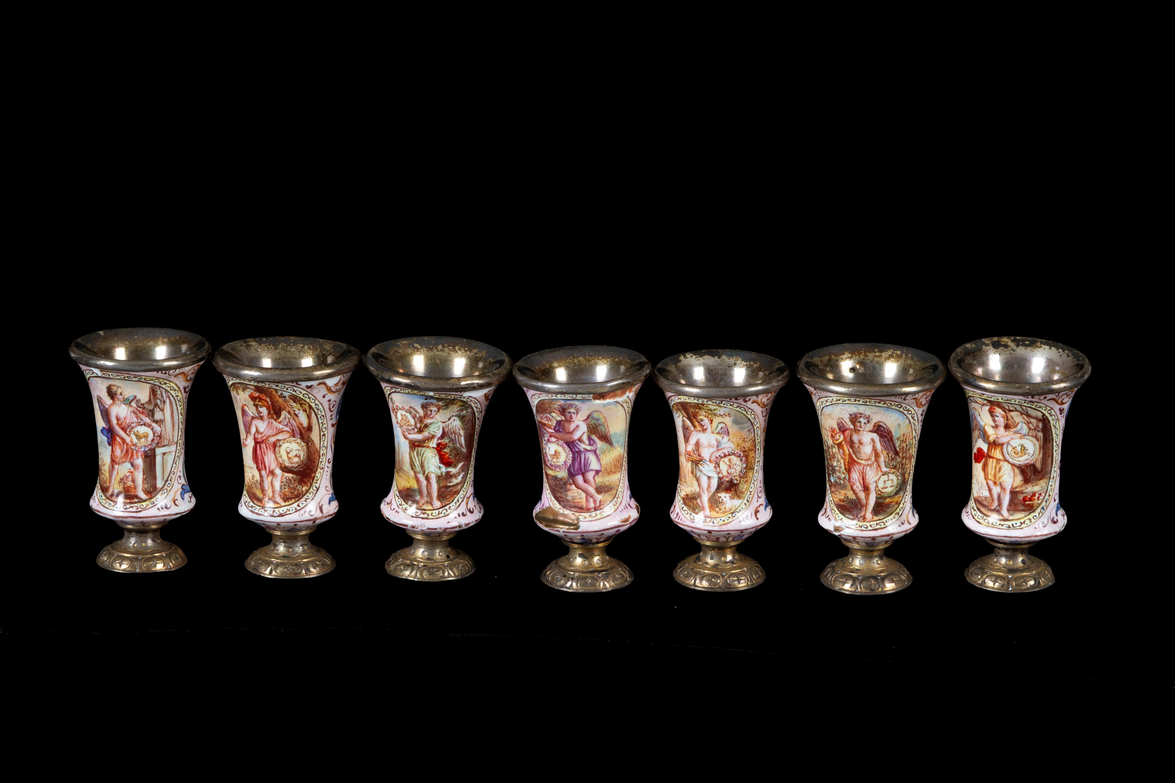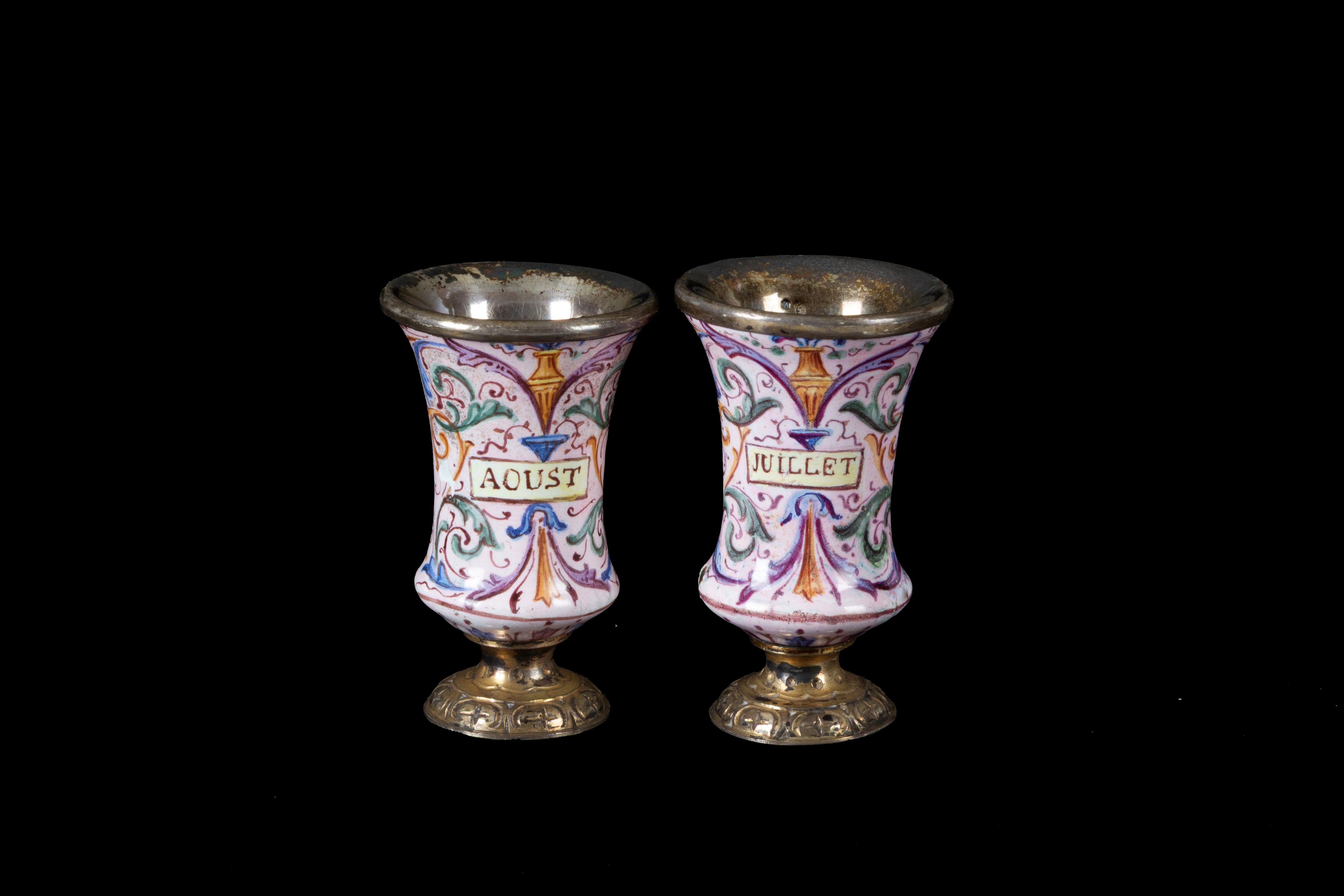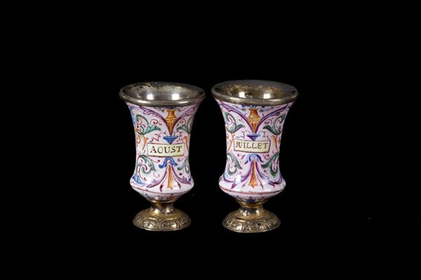 Sette modellini di calici in argento dipinti con mesi dell'anno. Francia. XIX secolo. Lievi difetti.