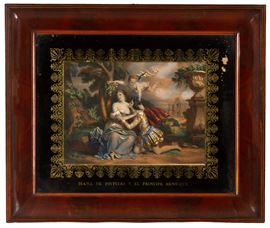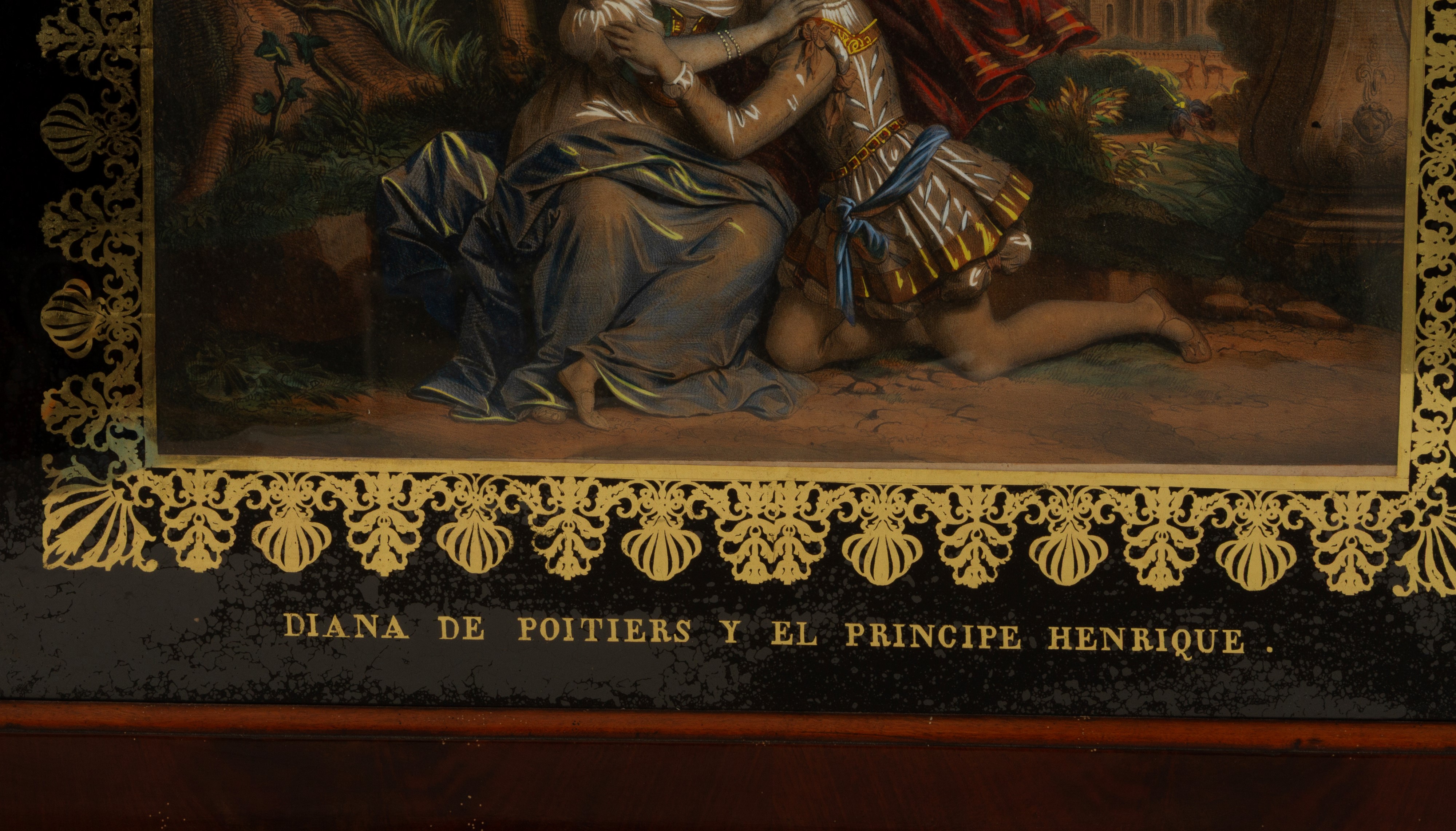Stampa acquarellata intitolata "DIANA DE POITIERS Y EL PRINCIPE ENRIQUE". XIX secolo. In elegante cornice in legno lastronato. Difetti.