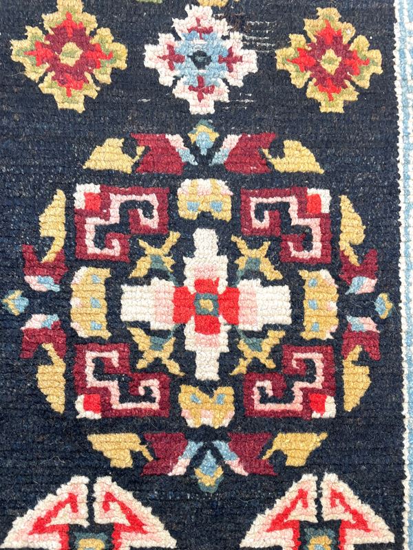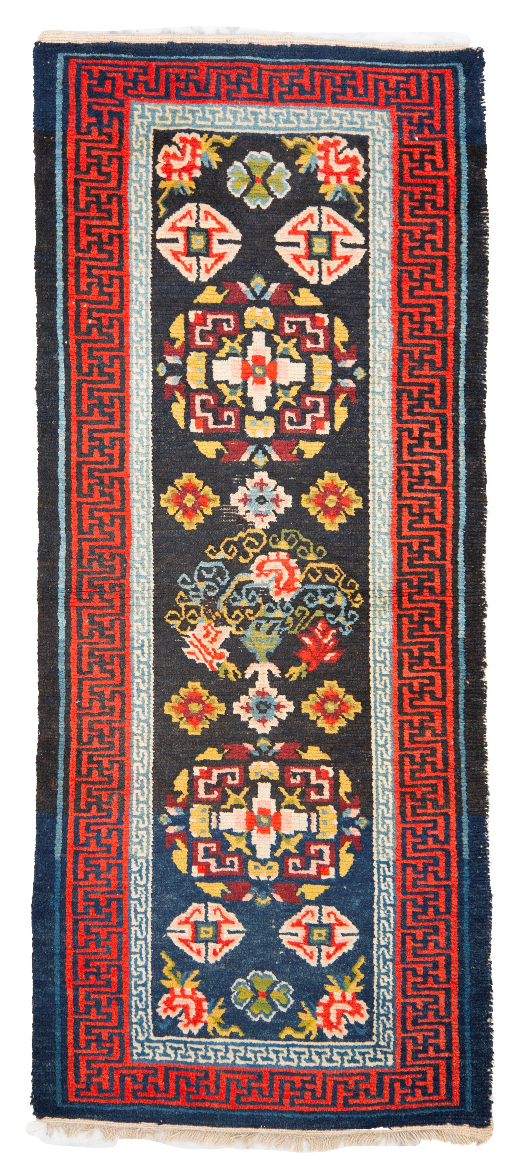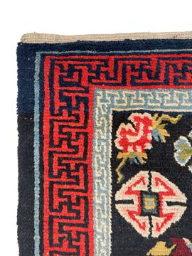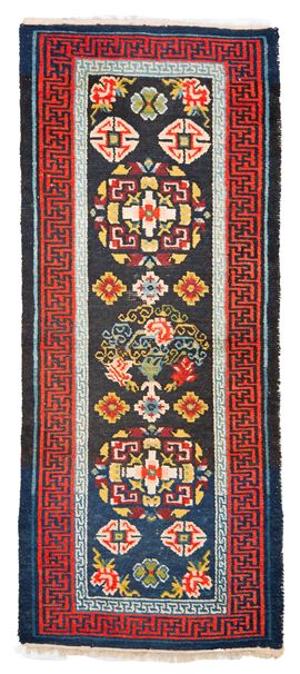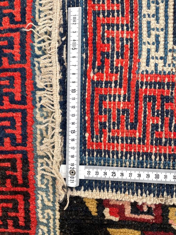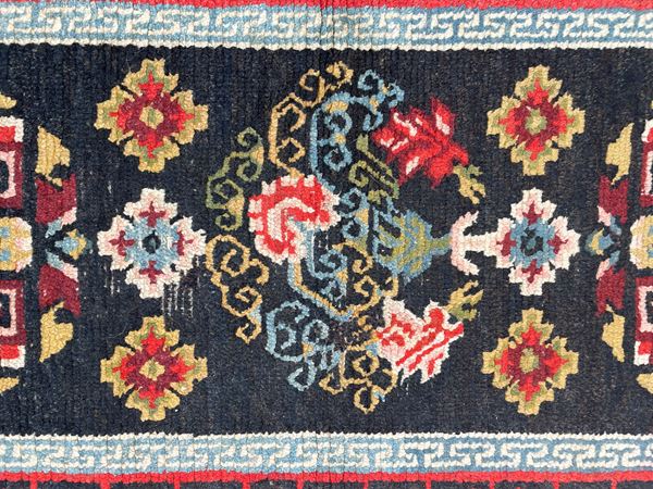Tappeto Khaden. Tibet. Circa 1900. Ottimo stato di conservazione. Testate originali, piccolissimo punto sul campo basso di vello.