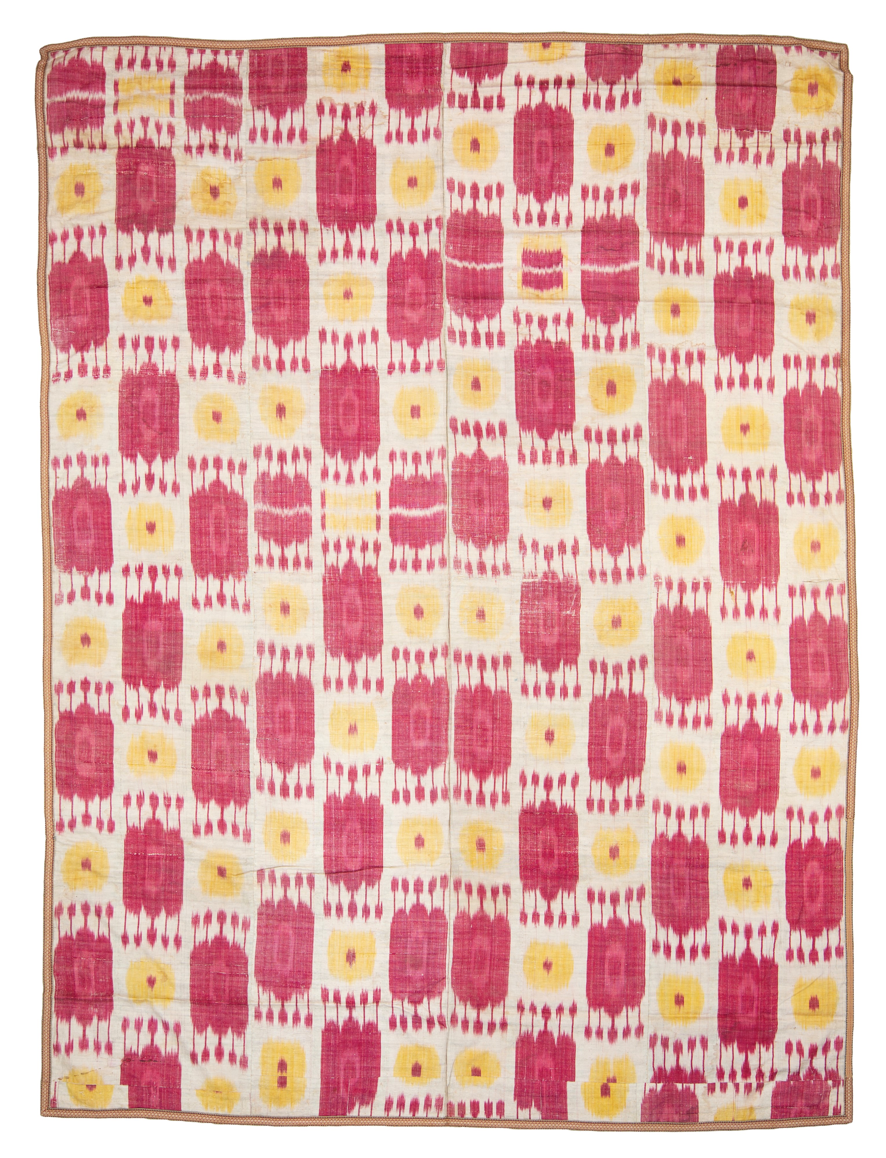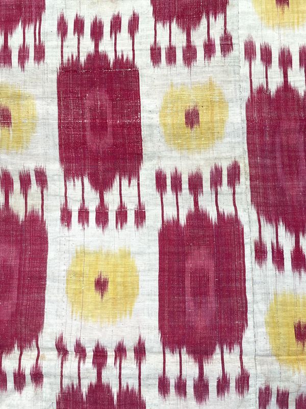 Tessuto Ikat disegno a melograni in seta. Uzbekistan. Inizi XX secolo. Ottimo stato di conservazione.