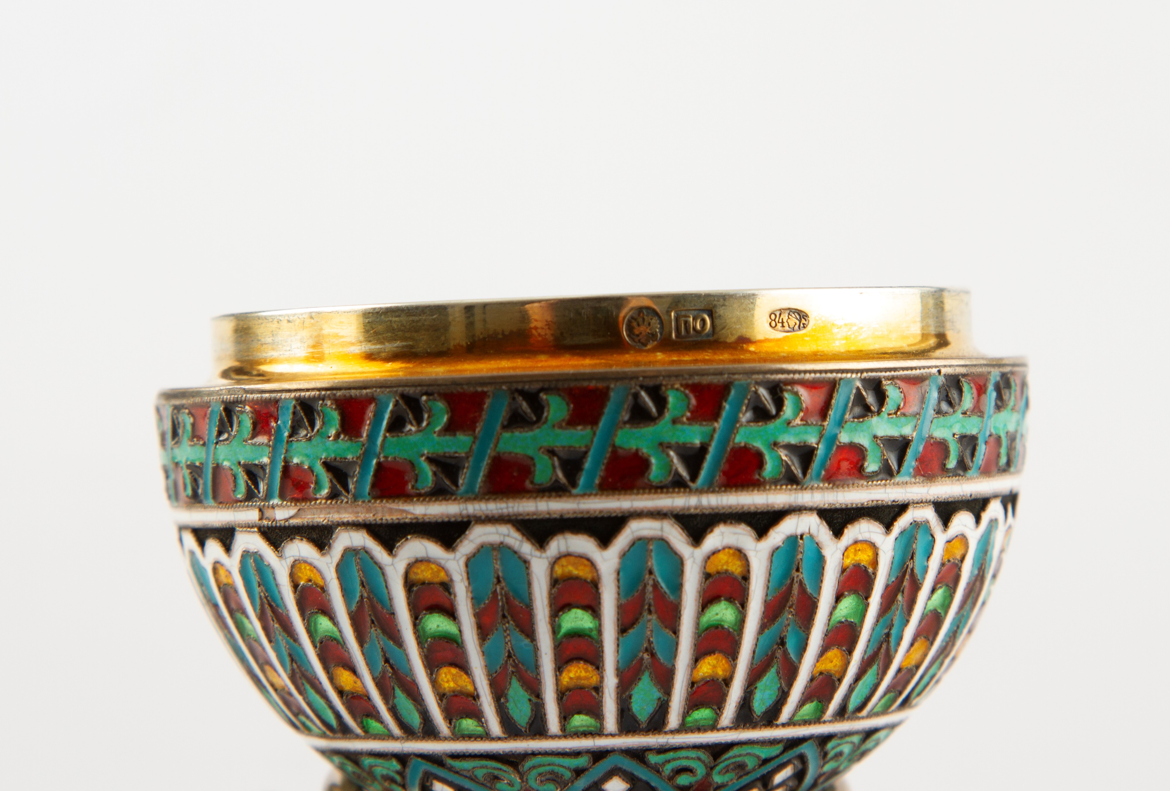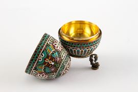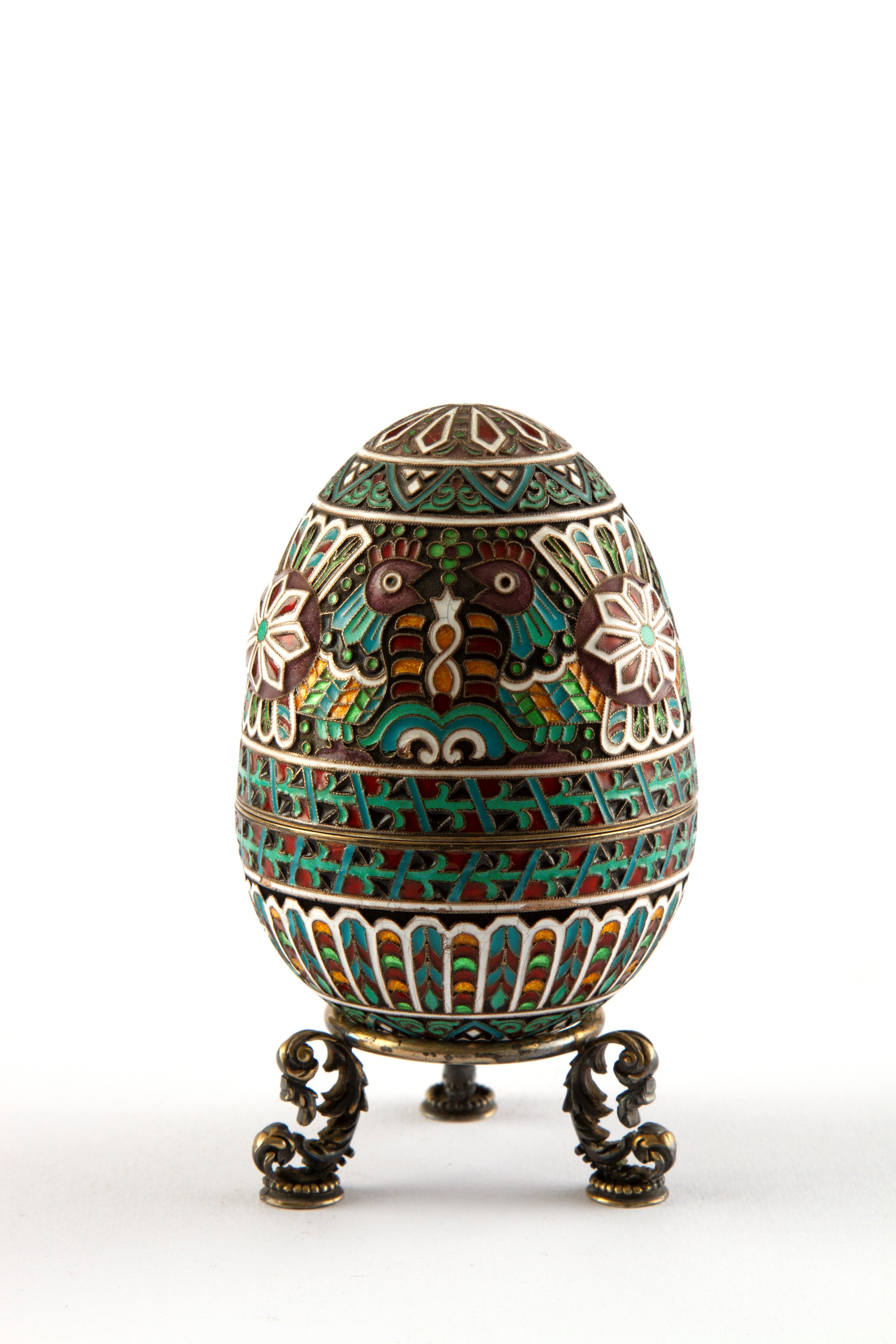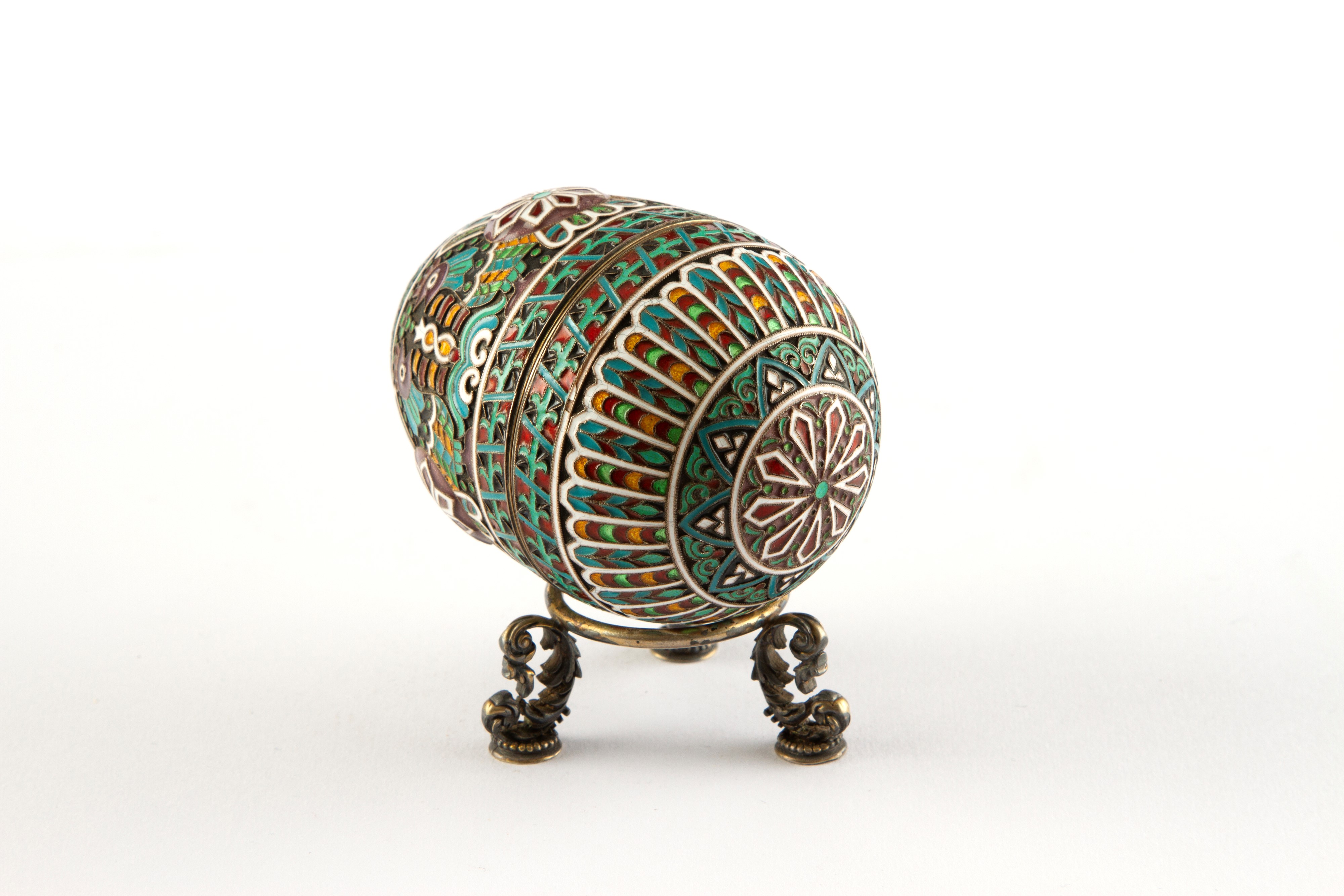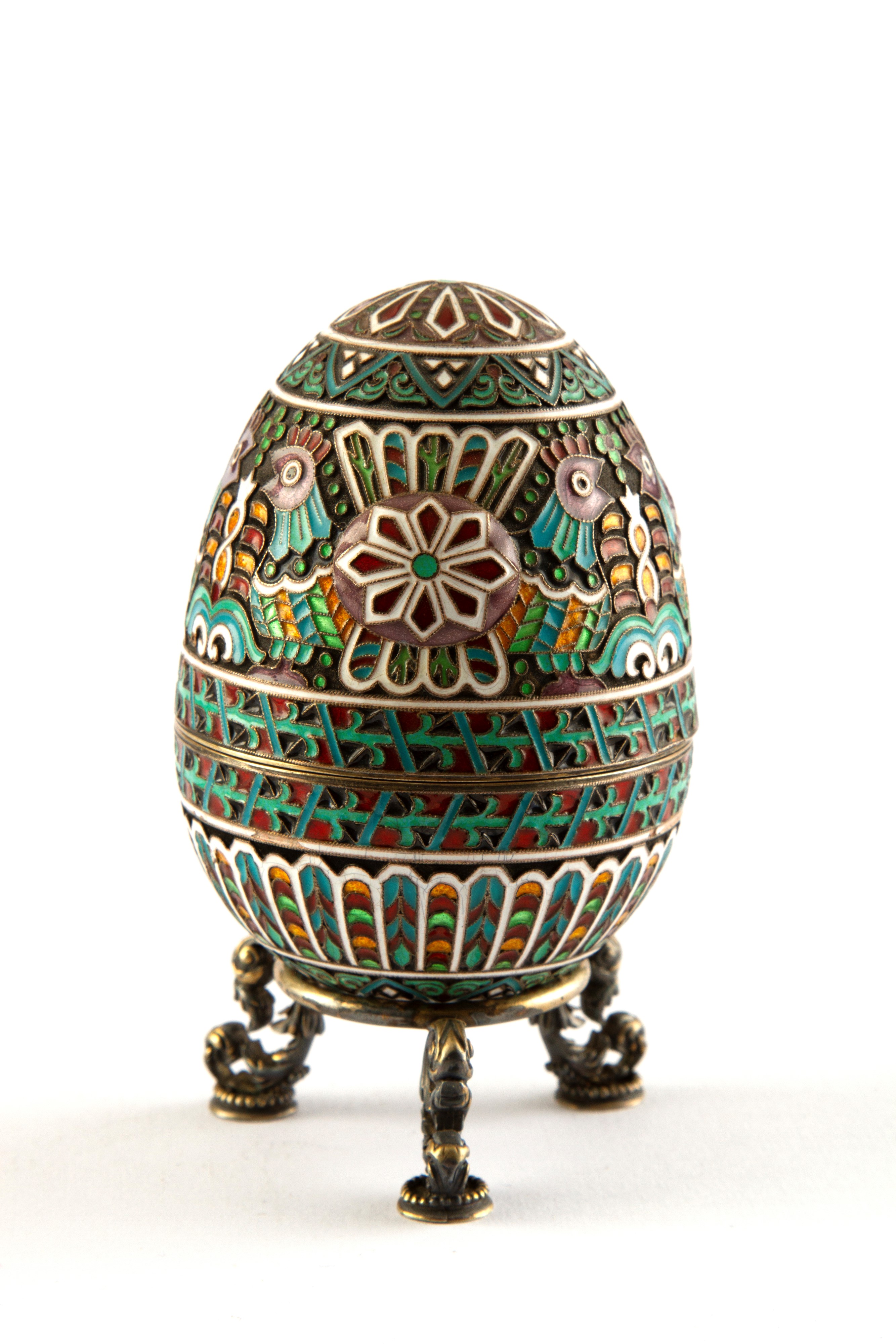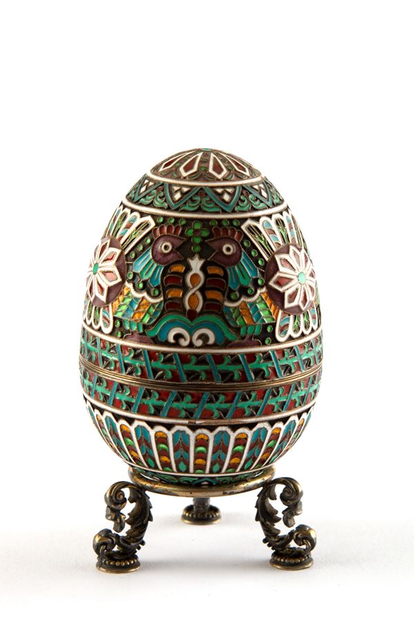 Uovo apribile in argento e smalti. Base tripode in argento. Con punzoni all'interno e sulla base. Russia. XX secolo.
