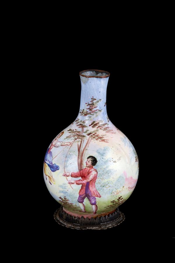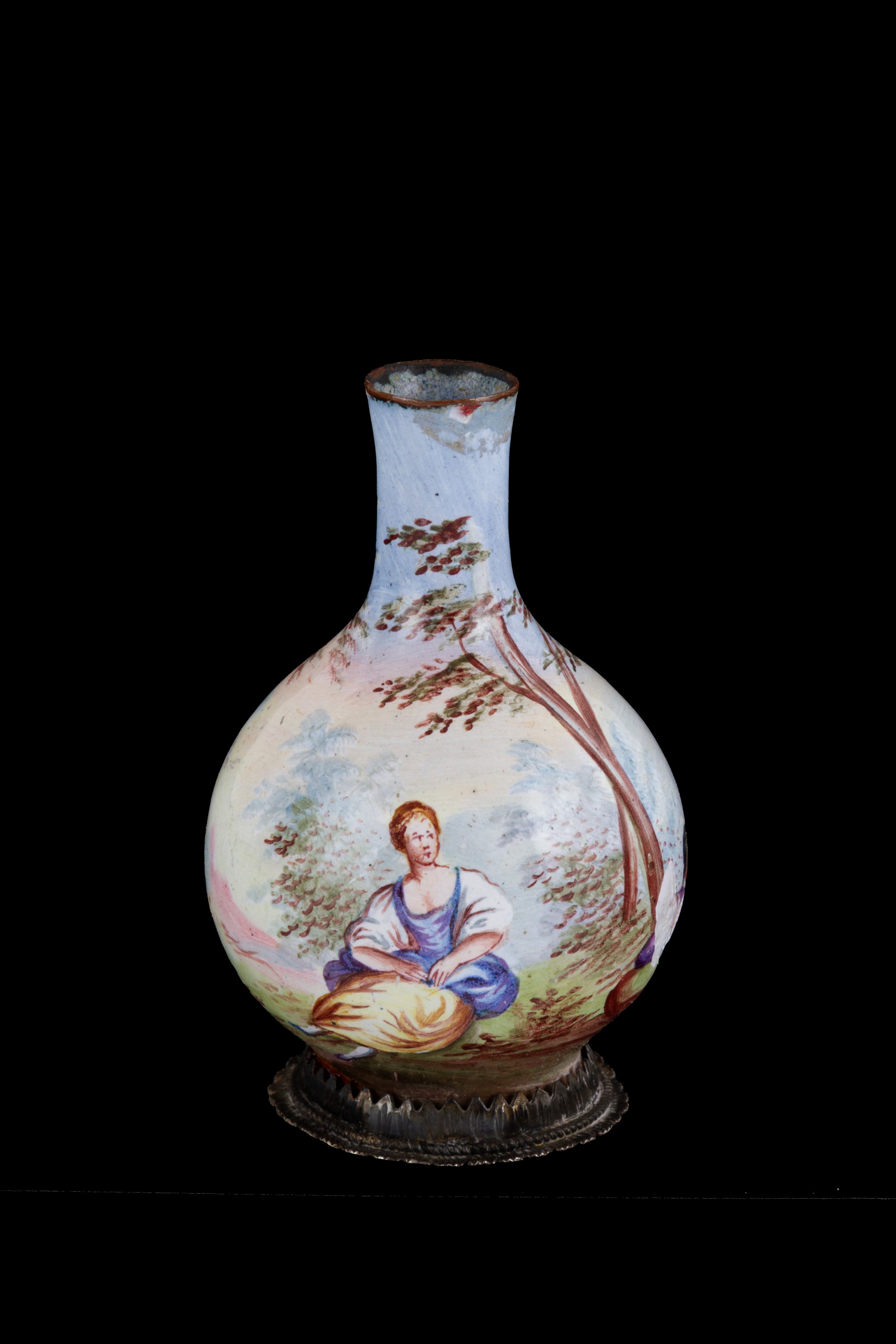Vasetto in ceramica dipinta con finiture in argento cesellato. XIX secolo. Lievi difetti.