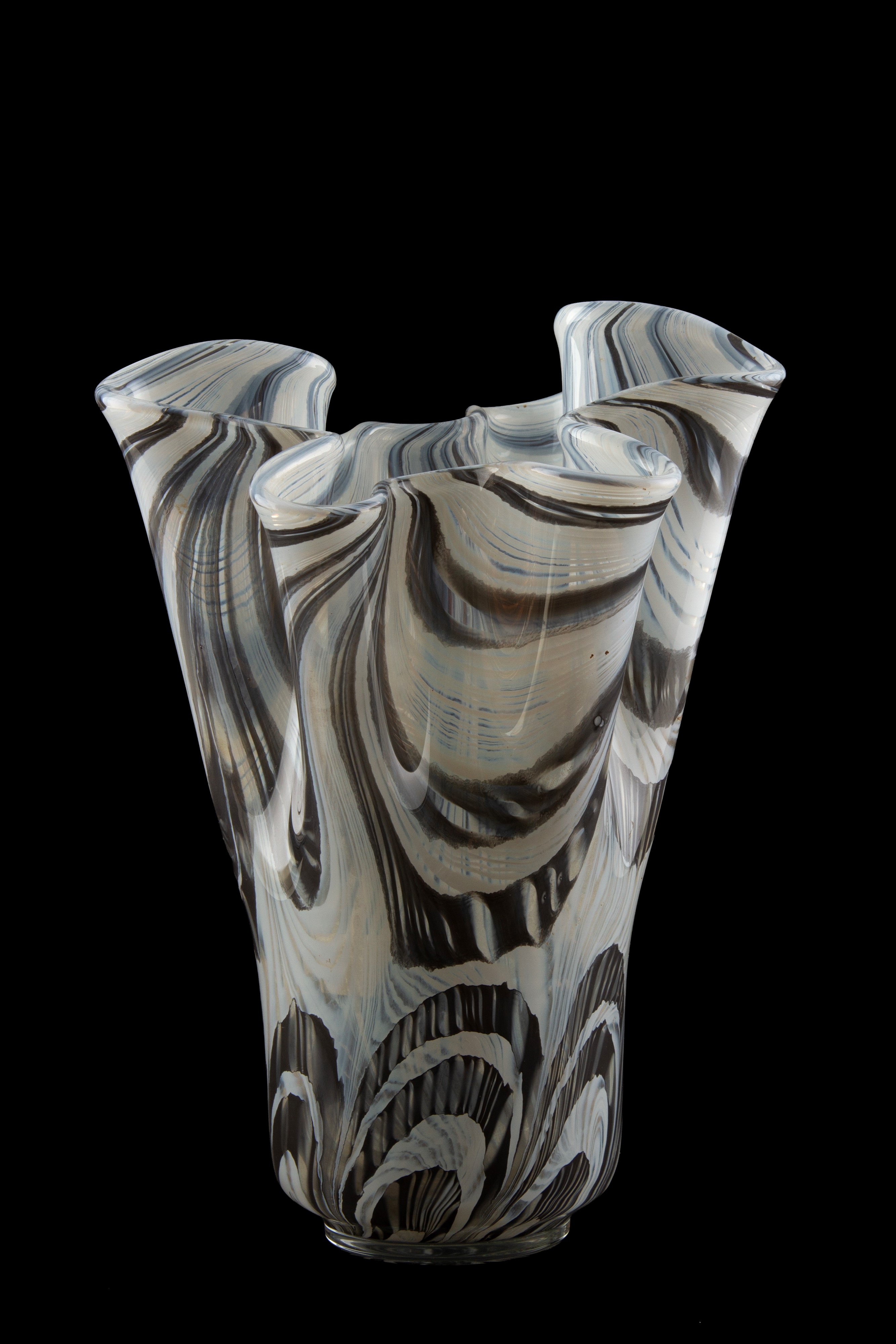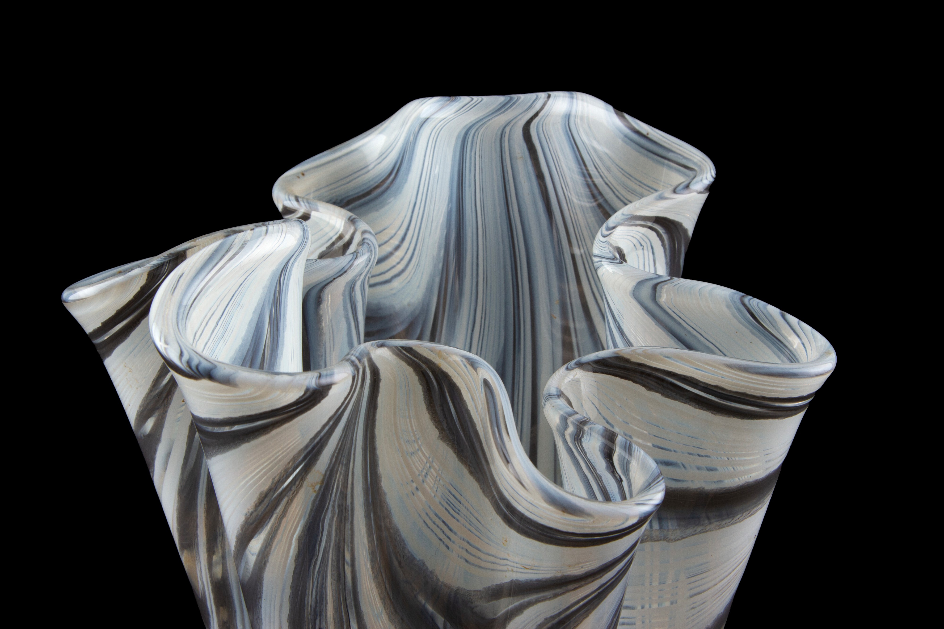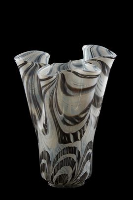 Vaso a fazzoletto in vetro nei toni del grigio e del bianco.