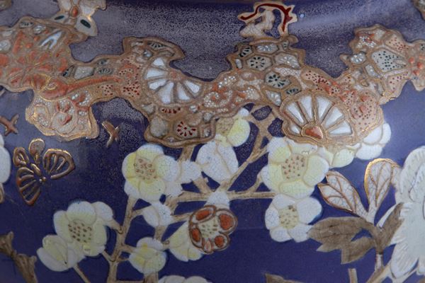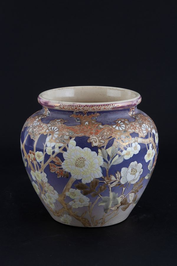 Vaso in ceramica decorata a motivi floreali con farfalle. XX secolo. Difetti e rotture.