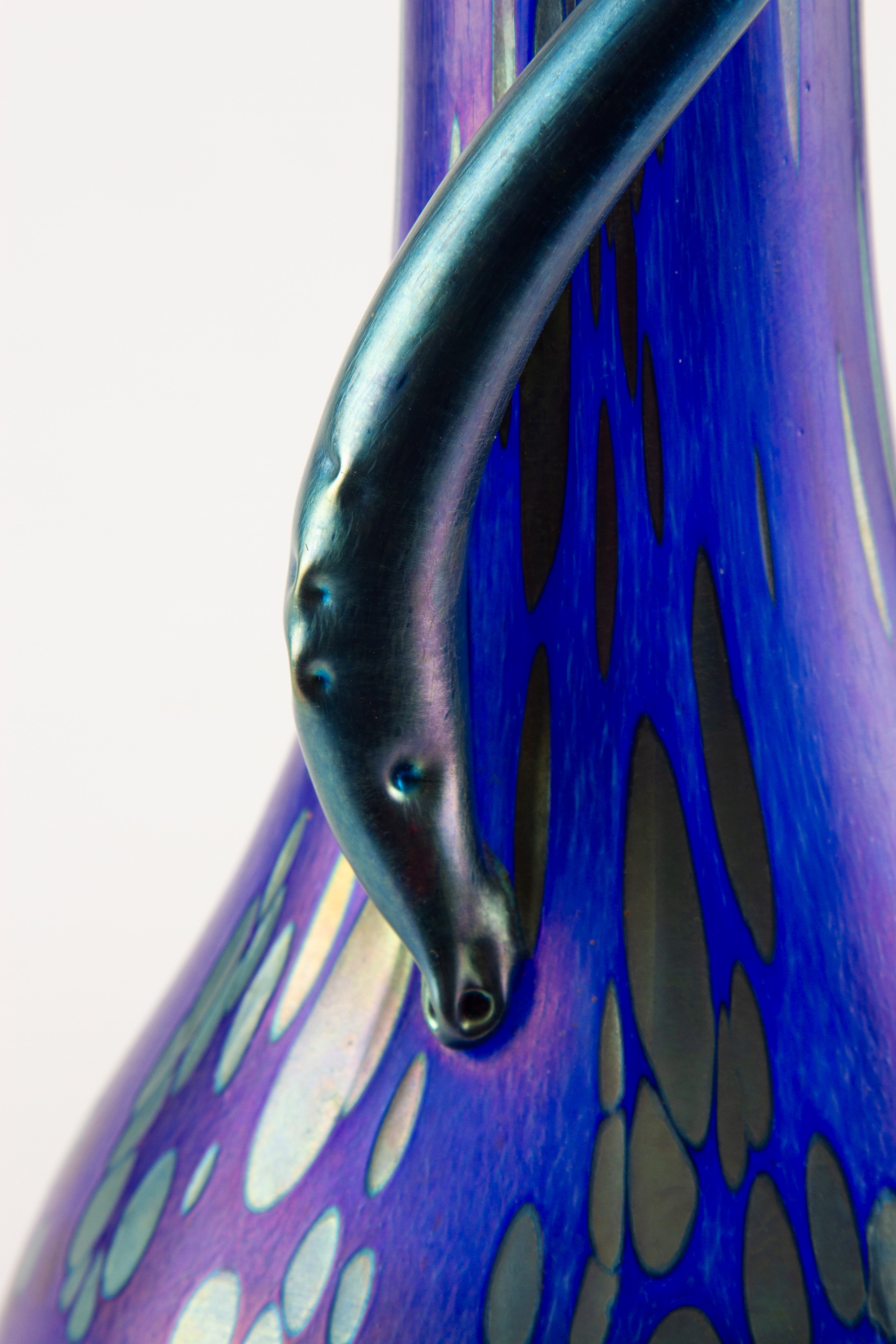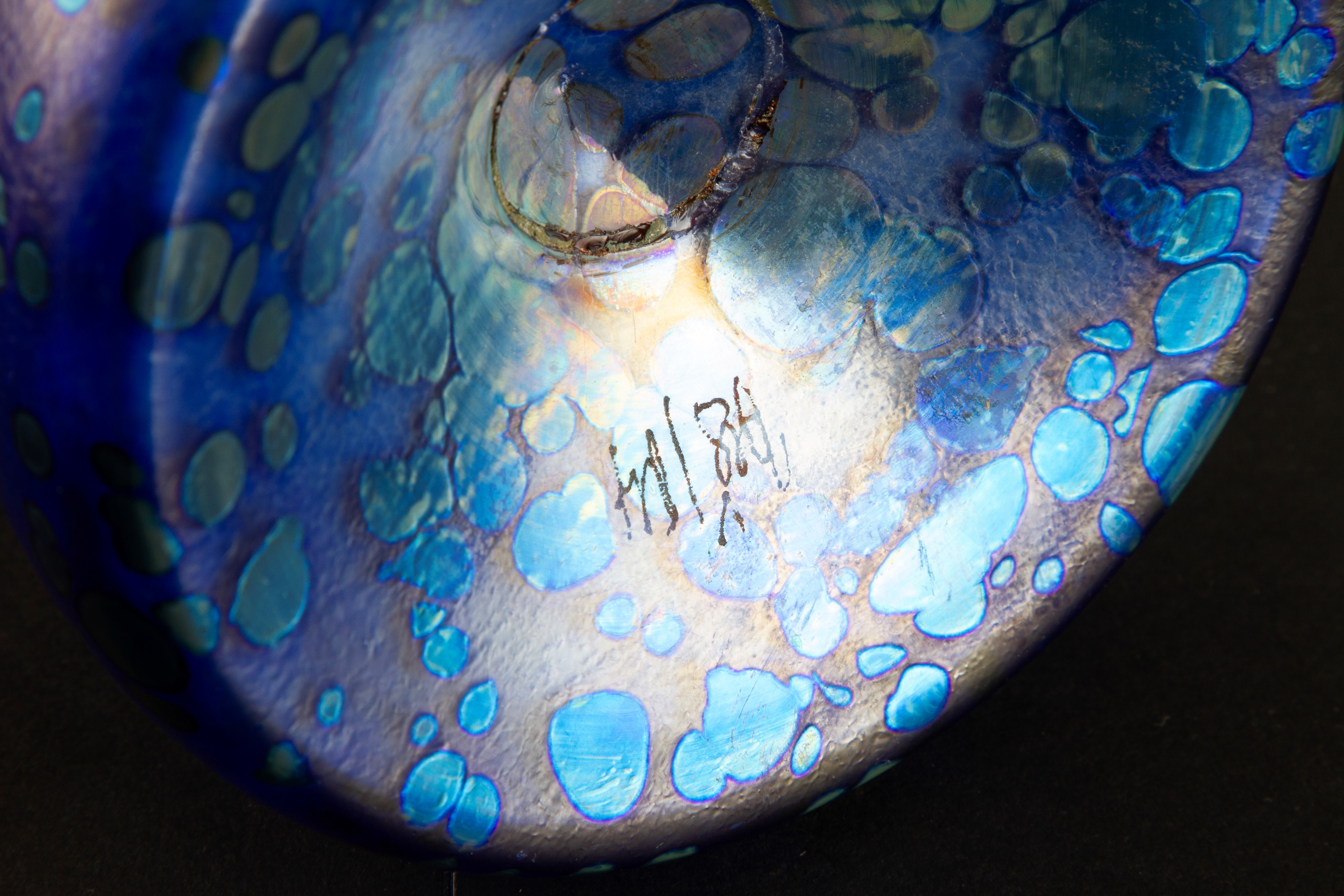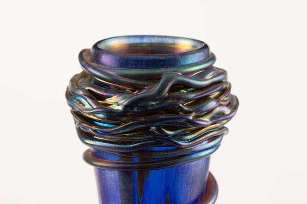 Vaso in vetro iridescente blu e azzurro. Manifattura LOETZ (Attr.). Siglato sotto la base.