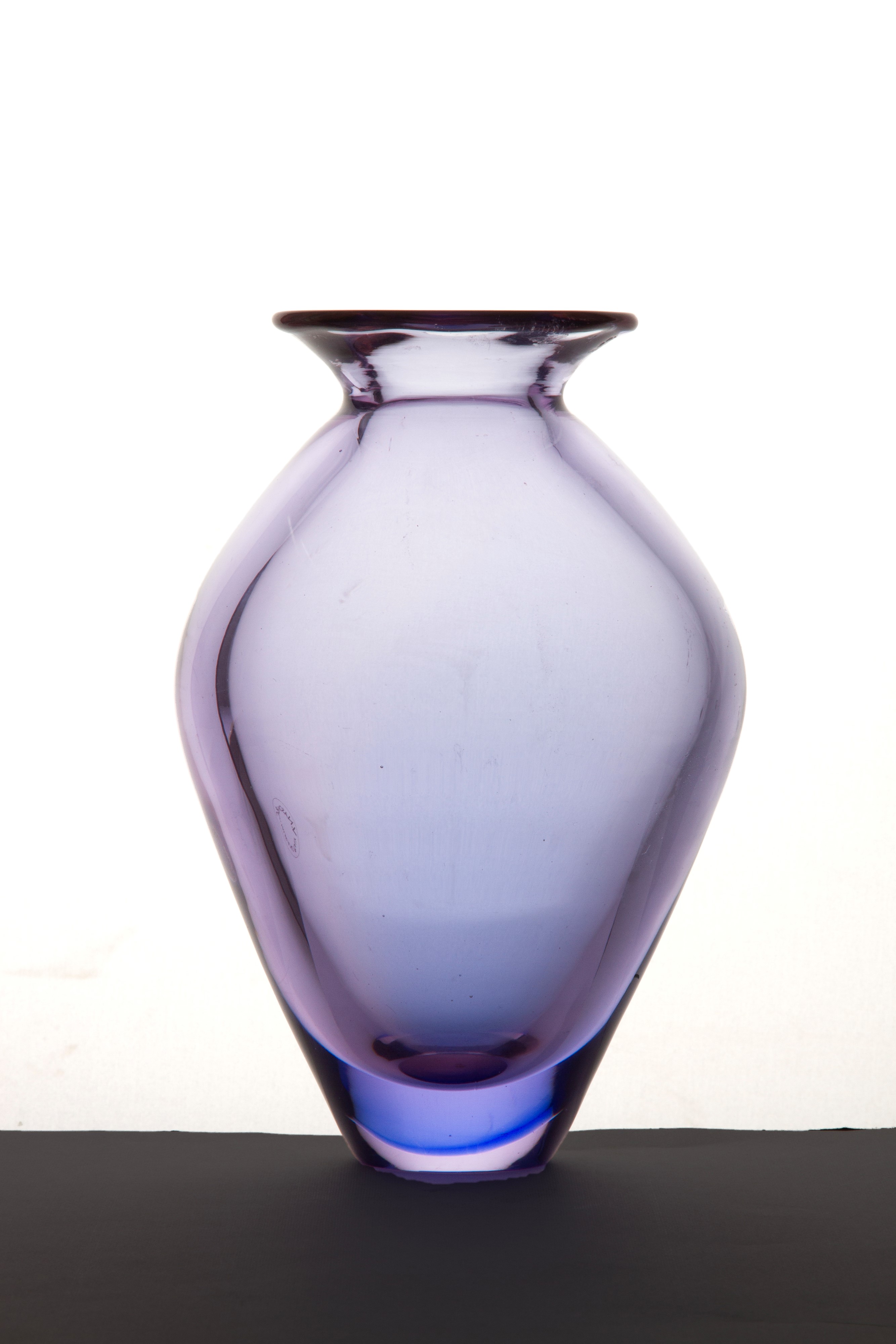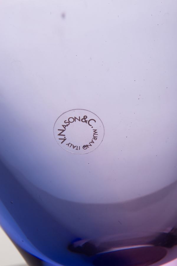 Vaso in vetro di Murano color malva. Con etichetta del produttore V. NASON & C. sul lato.