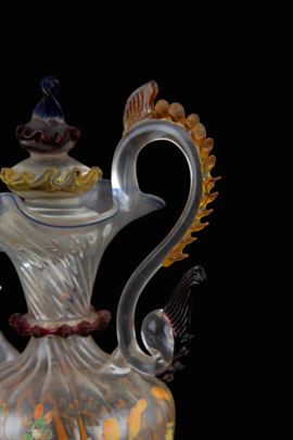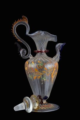 Versatoio in vetro soffiato e policromo con decori dipinti a motivi floreali. XVIII secolo.